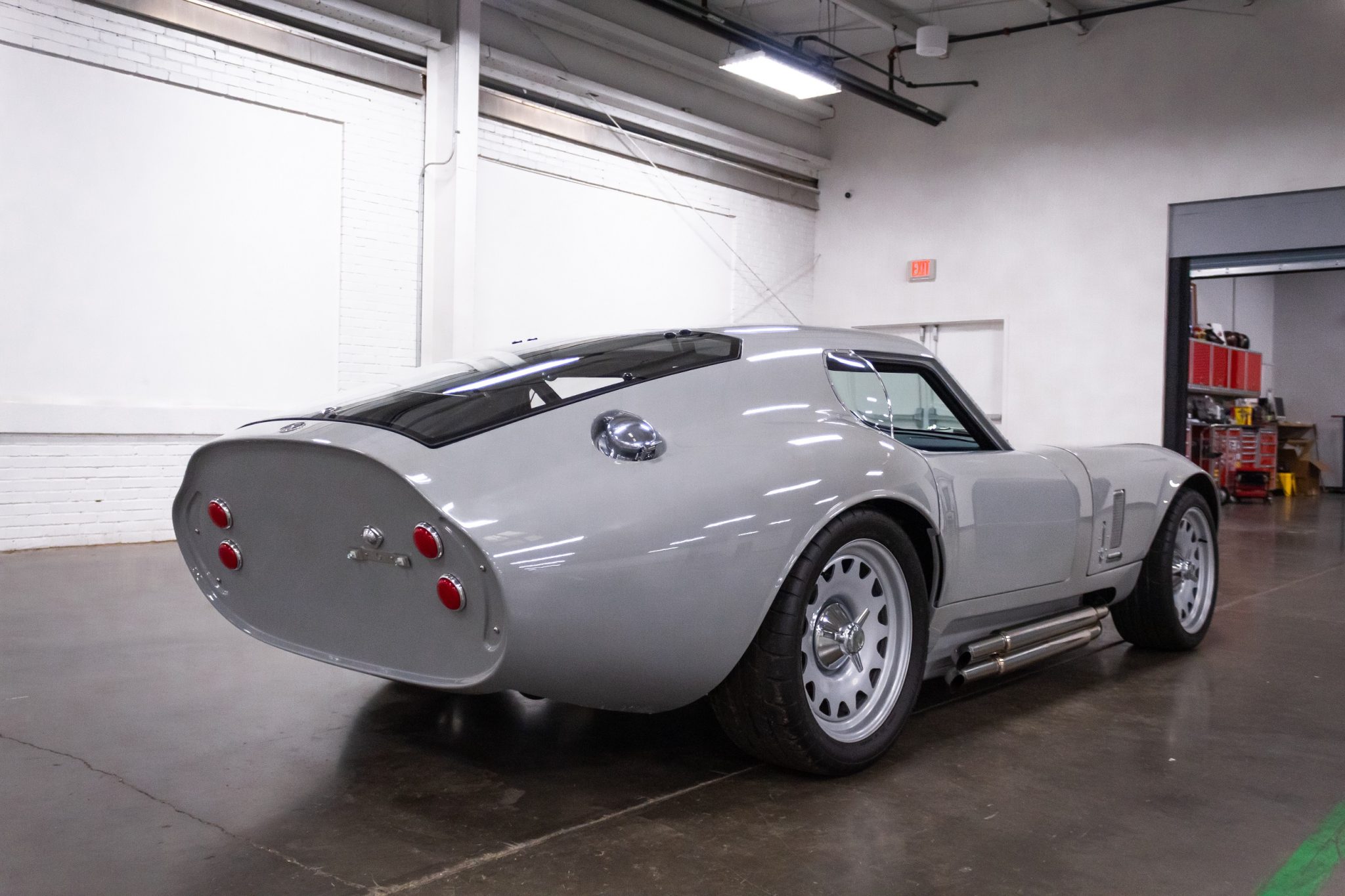 Detroit Steel Ambassador 18″ wheels are powder-coated silver and wrapped in Mickey Thompson Street Comp tires measuring 245/40 up front and 295/35 out back. Braking is handled by four-wheel discs featuring 11″ Ford Mustang GT-sourced rotors and Baer/PBR dual-piston calipers up front. The car is equipped with power steering, and the suspension system features a Factory Five Racing three-link rear suspension with a Panhard bar and adjustable Koni coilovers.