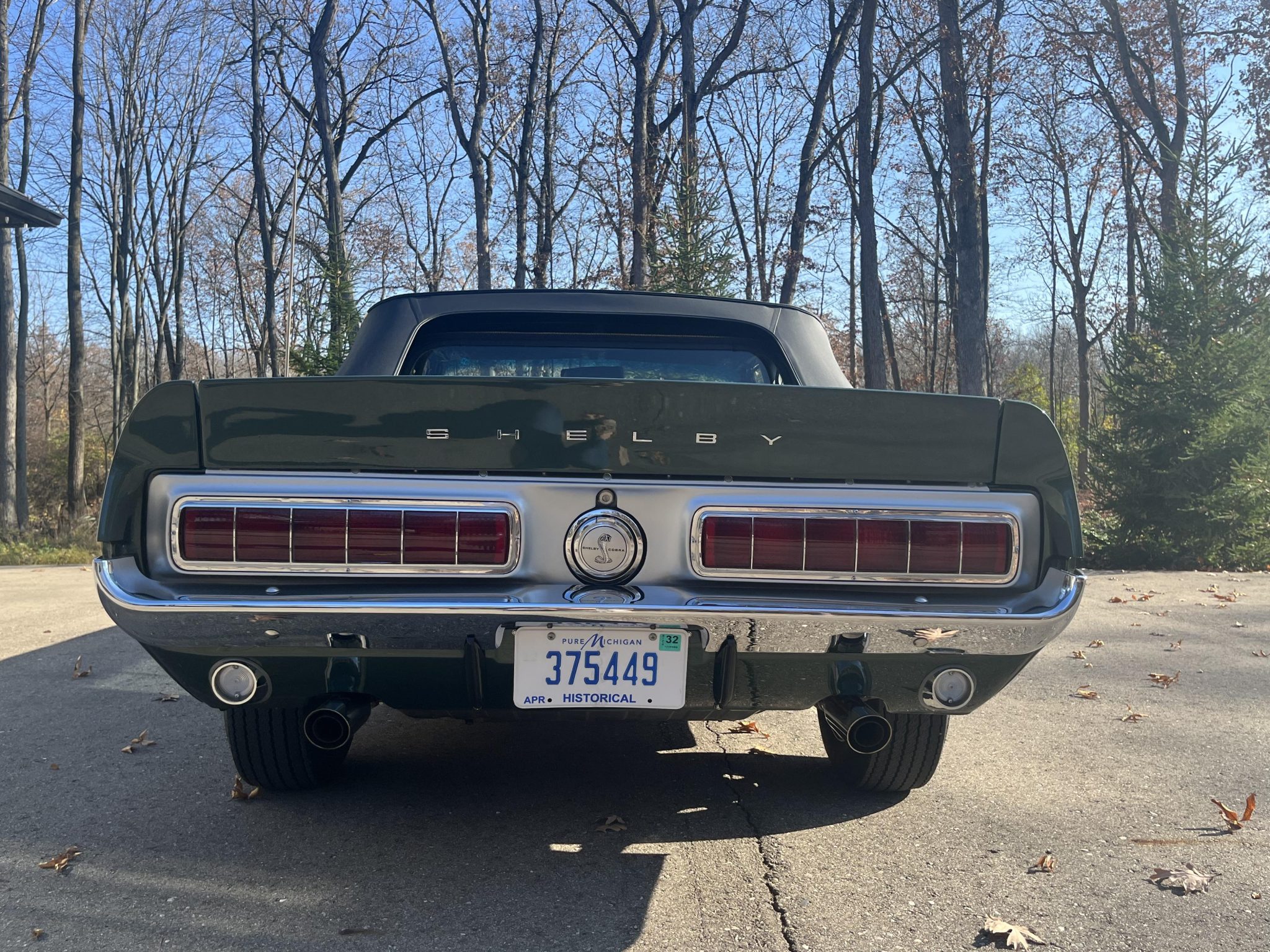 Ten-spoke 15″ wheels wear Shelby Cobra center caps and are mounted with F70-15 Goodyear Speedway white-letter tires. The car is equipped with power steering and braking is handled by power-assisted front discs and rear drums.