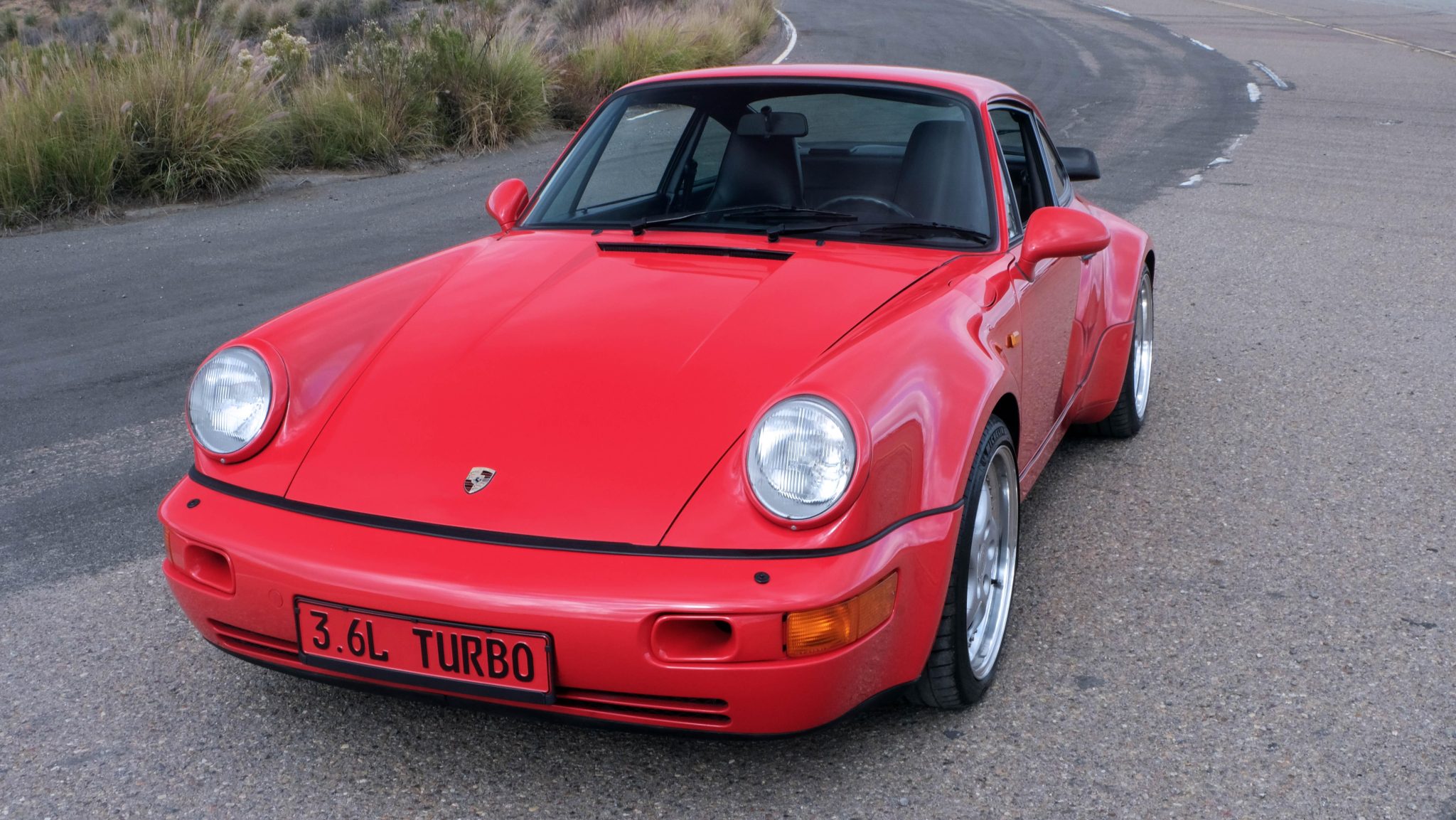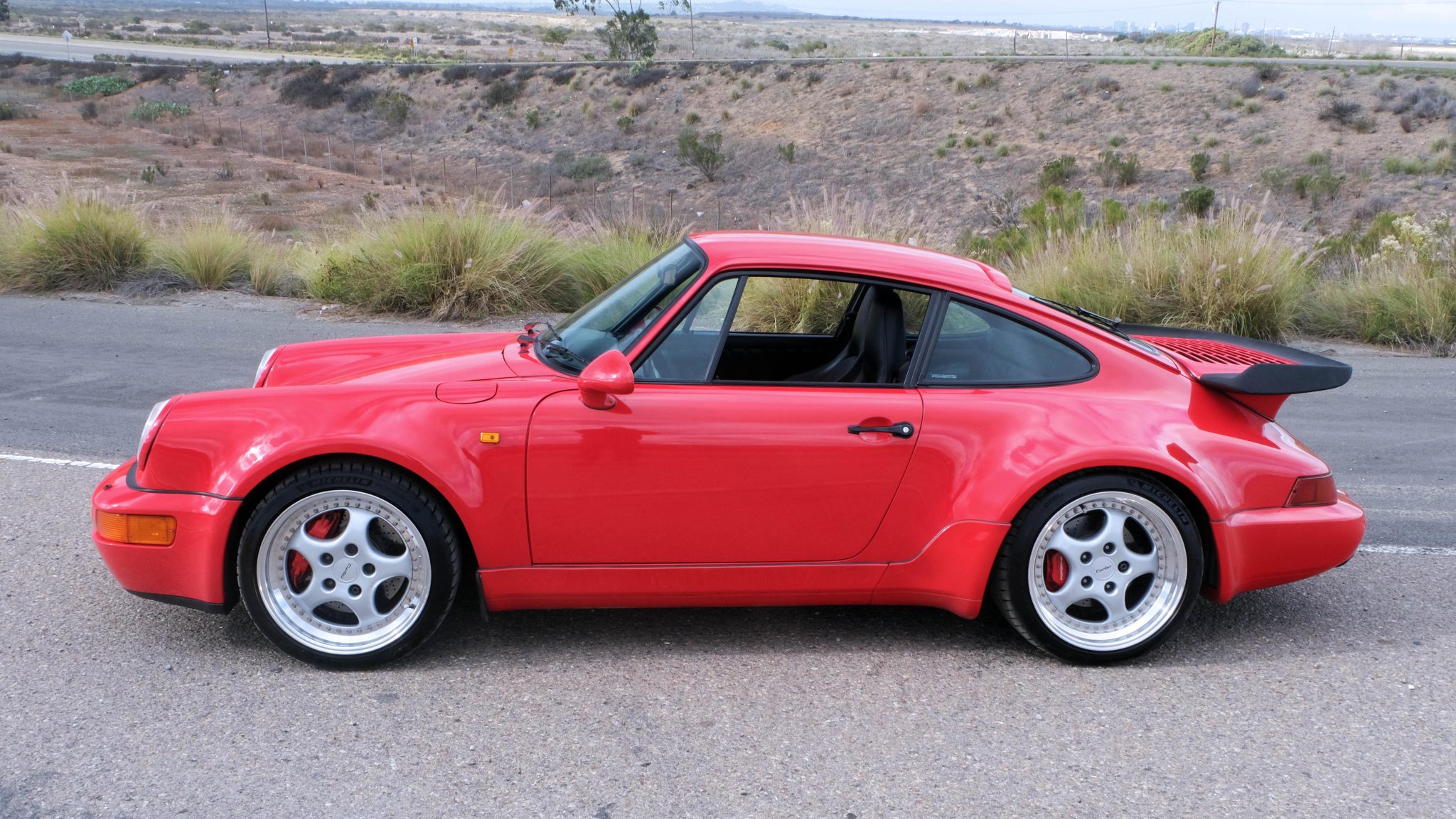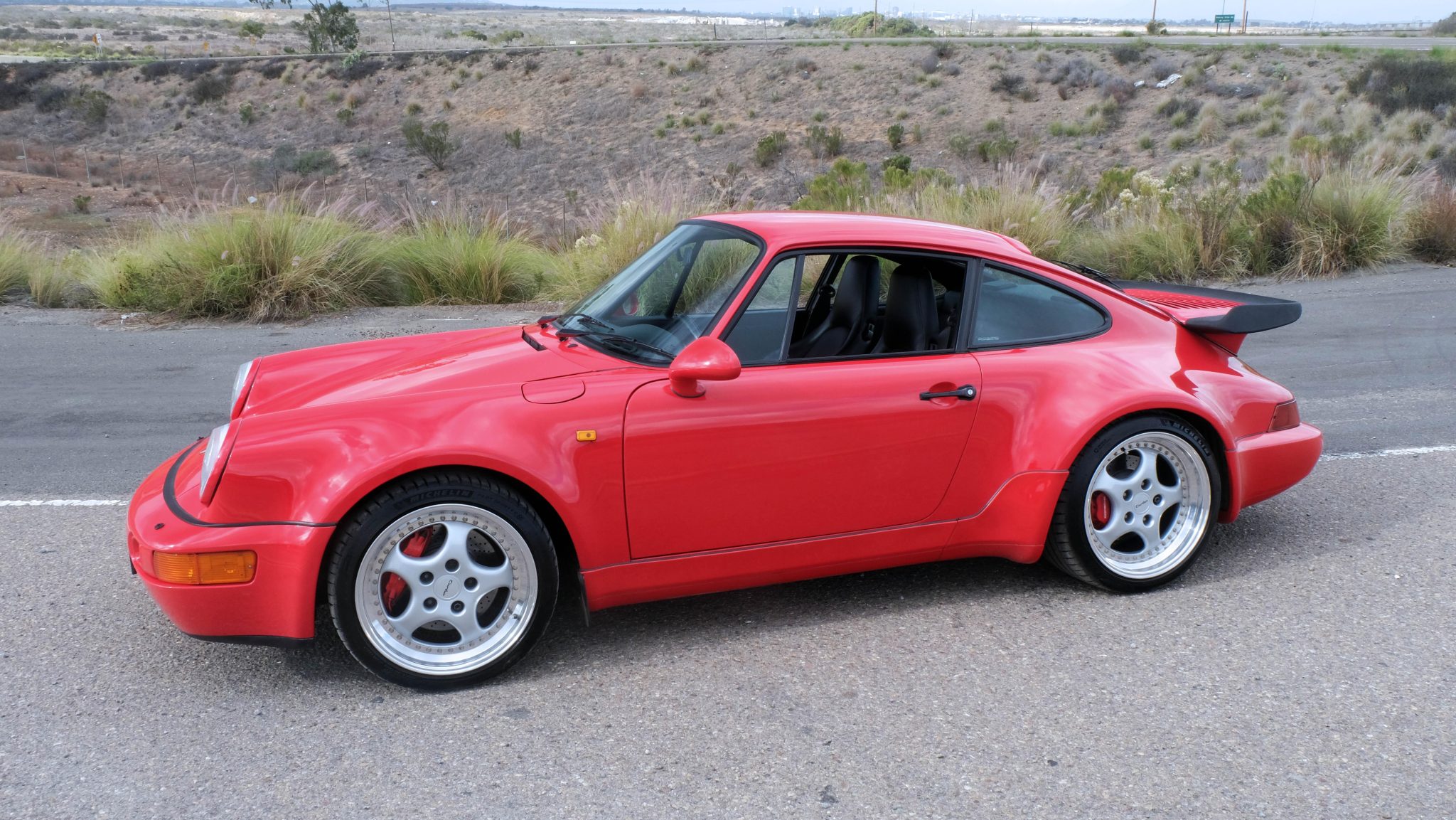 Silver multi-piece 18″ Speedline wheels feature polished lips and are mounted with 225/40 front and 265/35 rear Michelin Pilot Sport 4S tires. A red spare wheel with a Vredestein space-saver tire is mounted in the front trunk. The Turbo features uprated brakes compared to the standard 964, including larger calipers and cross-drilled rotors at each corner.