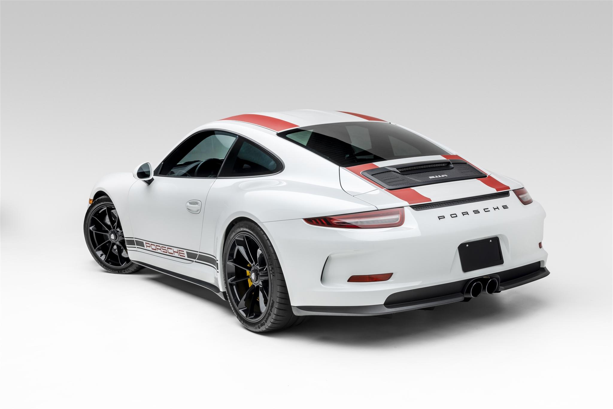This example is finished in white with red center stripes and black side stripes with red Porsche-script accents. Features include LED headlights with Porsche Dynamic Lighting System along with fog lights, SportDesign mirrors with carbon-fiber lower trim, and a speed-activated rear spoiler.