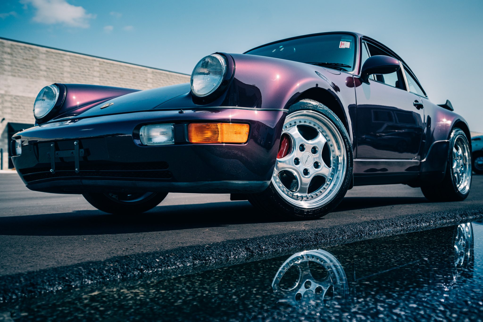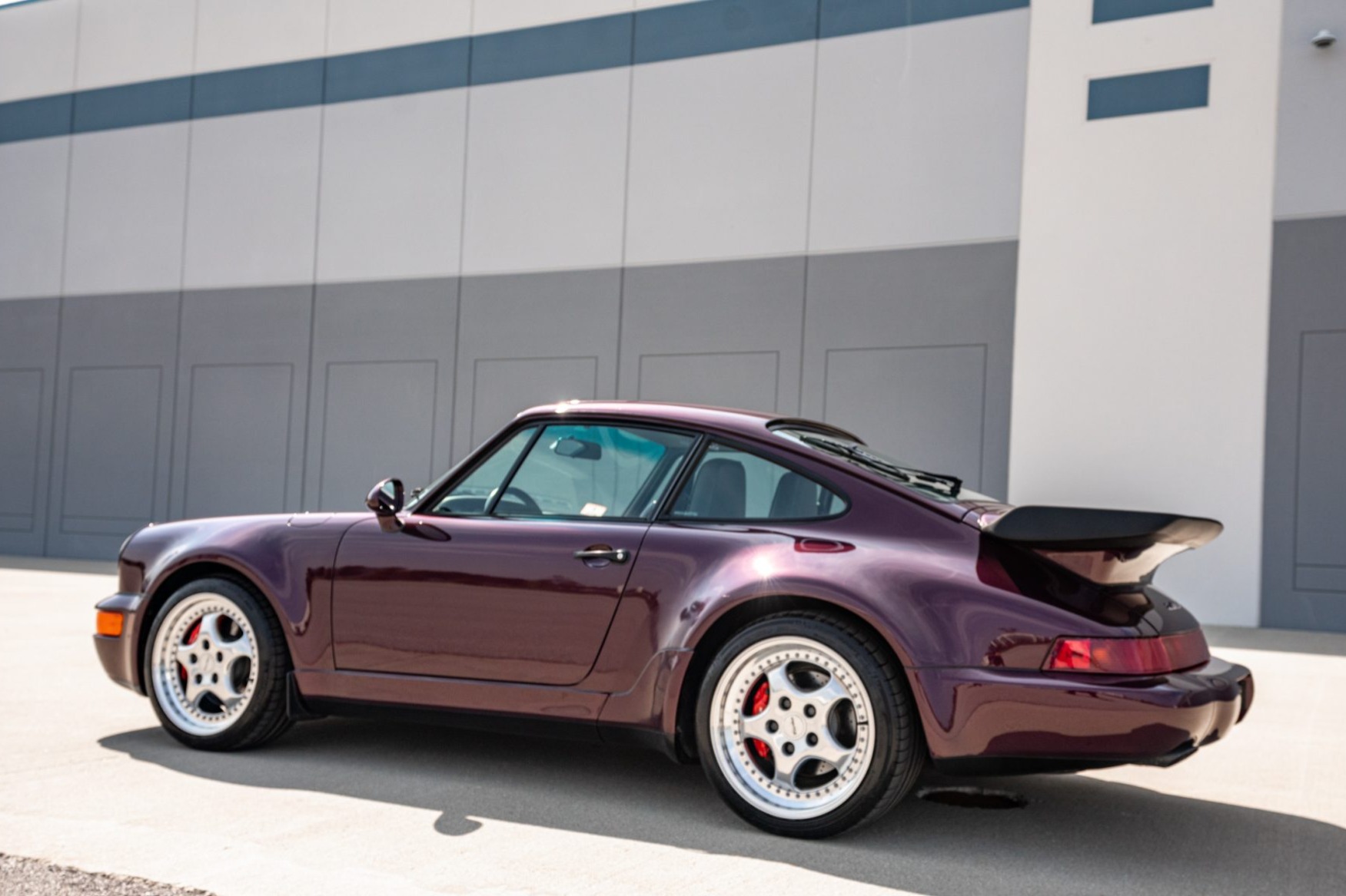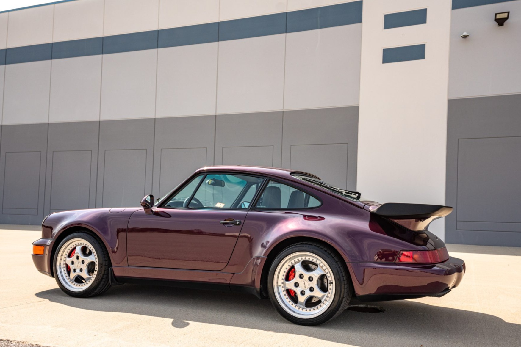 The replacement polished, multi-piece 18″ Speedline wheels wear Turbo-script center caps and are said to have been installed by the selling dealer. They are mounted with 225/40 front and 265/35 rear Michelin Pilot Sport Tires. The Turbo features uprated brakes compared to the standard 964, including larger calipers and cross-drilled rotors at each corner. The removed set of polished 18″ Speedline wheels are included in the sale and can be seen in the gallery.