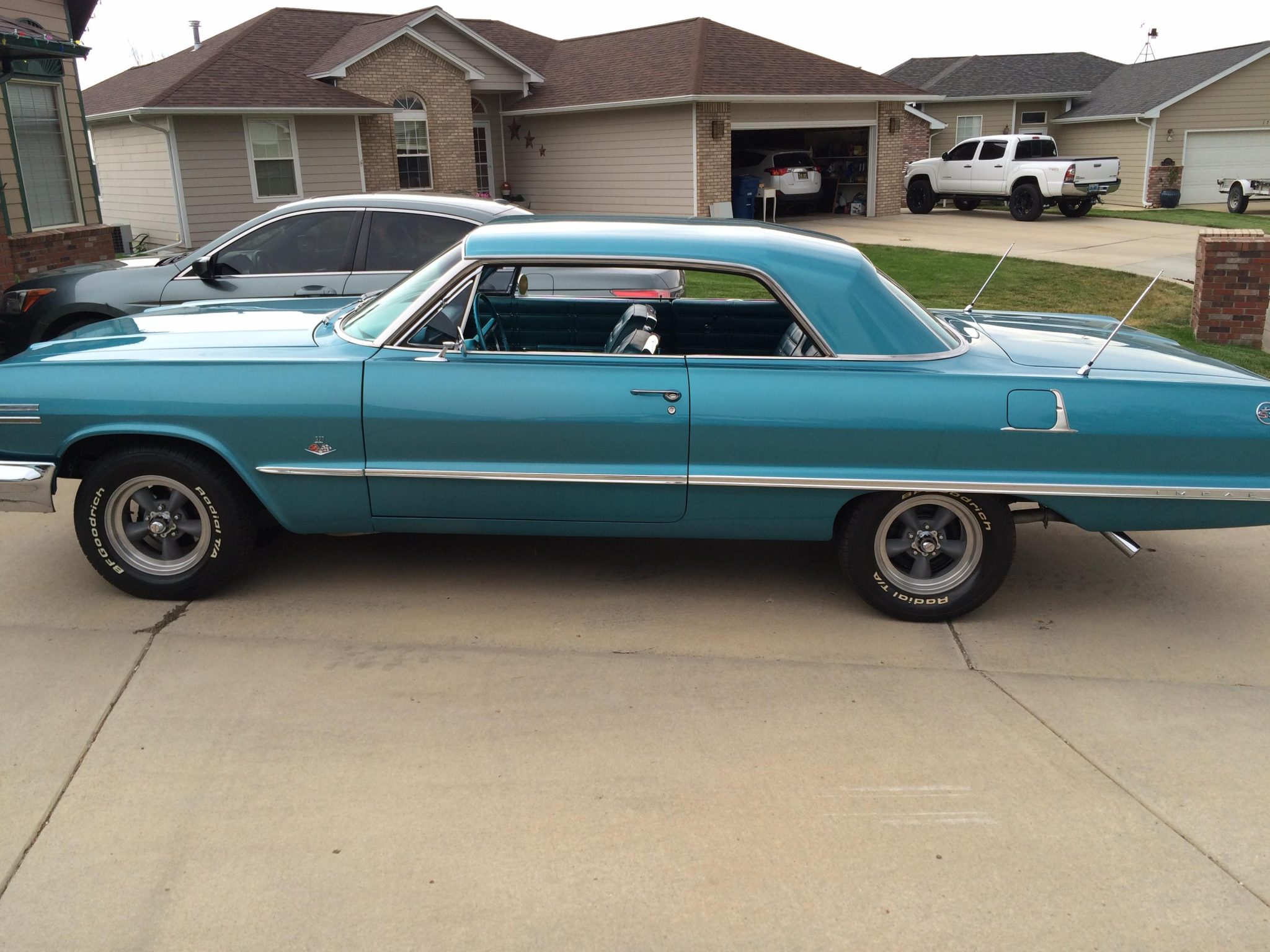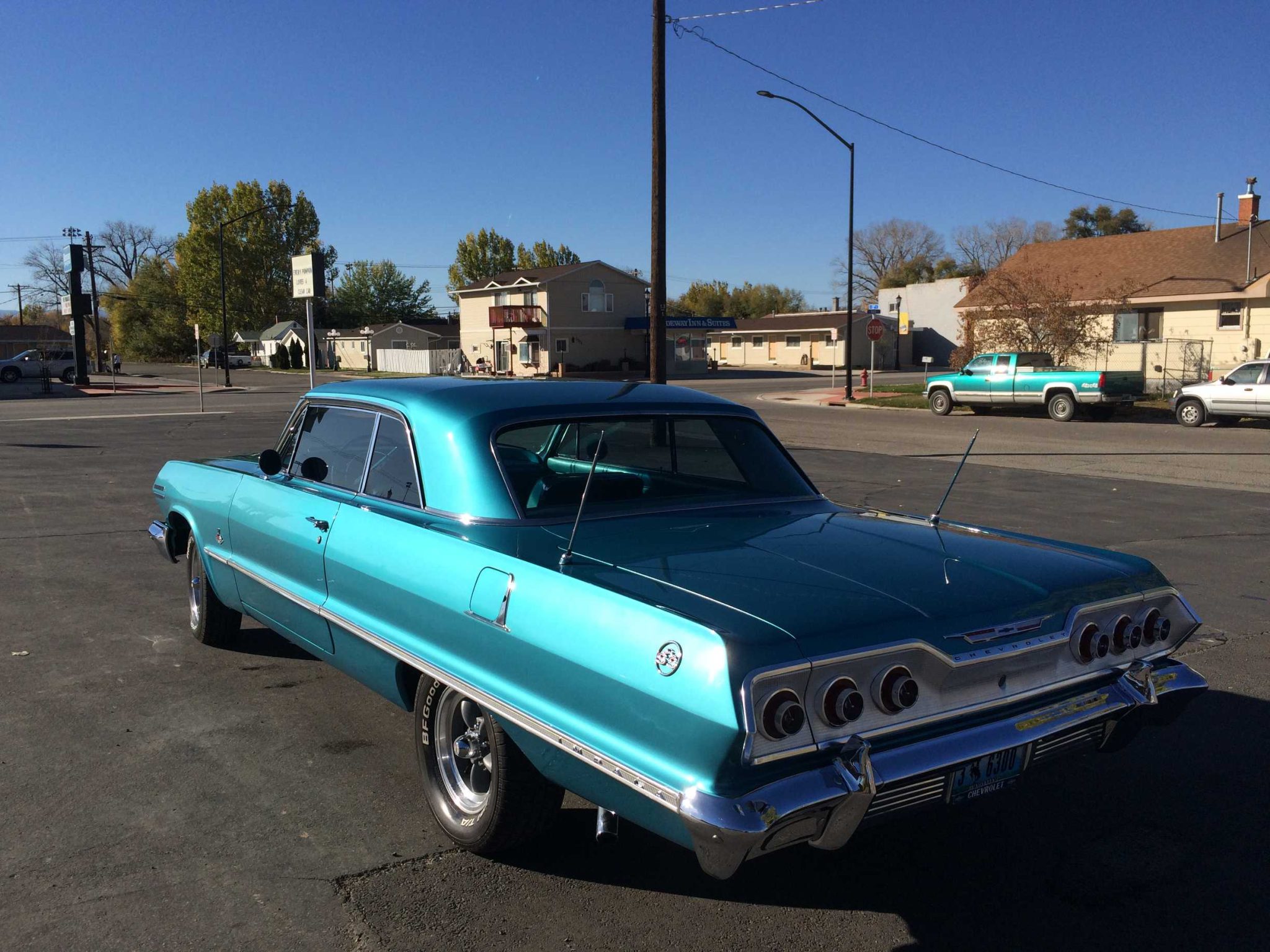 The 15″ American Racing wheels are mounted with 215/70 BFGoodrich Radial T/A tires. The car is equipped with power steering and air shock absorbers, and braking is handled by power-assisted front discs and rear drums.