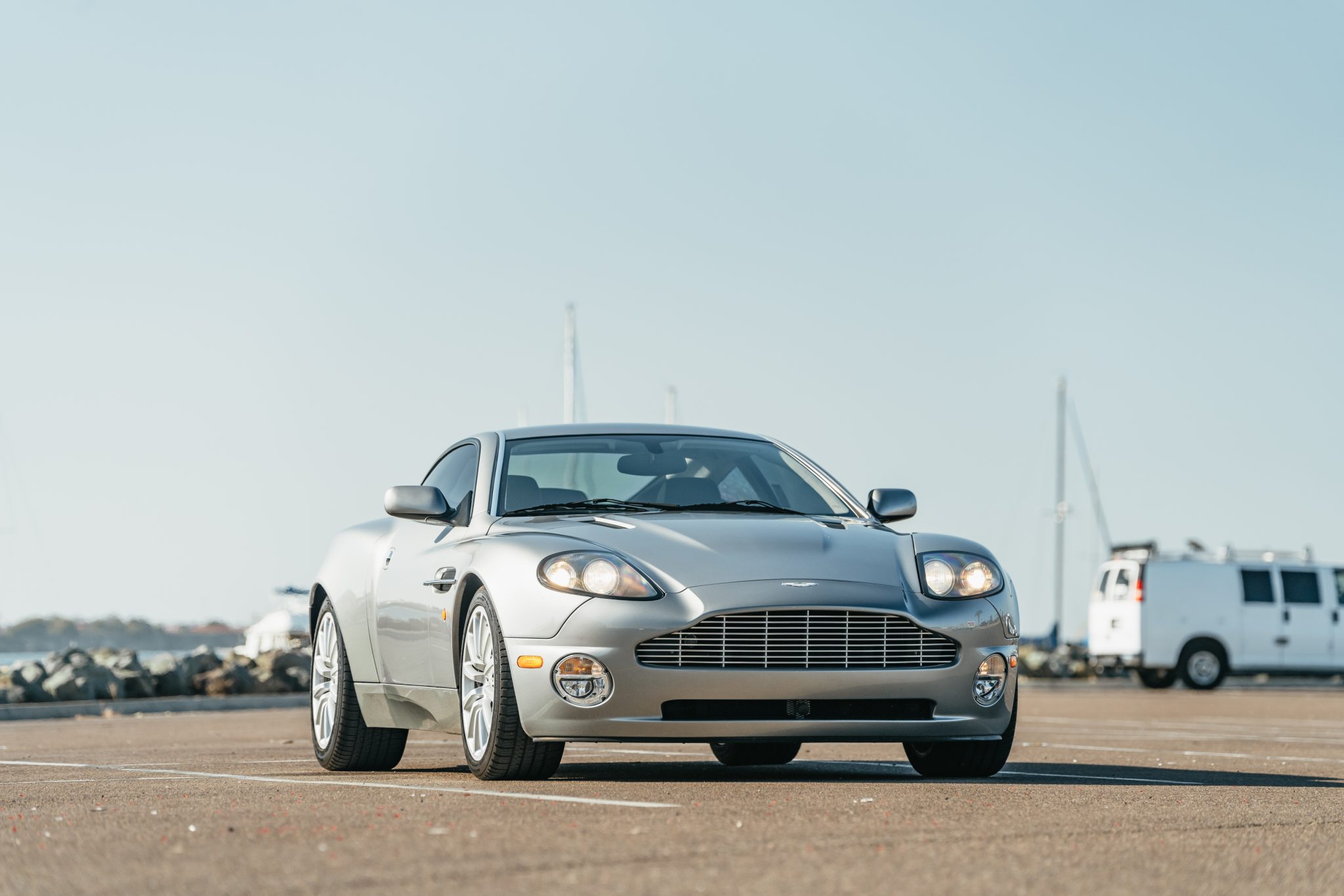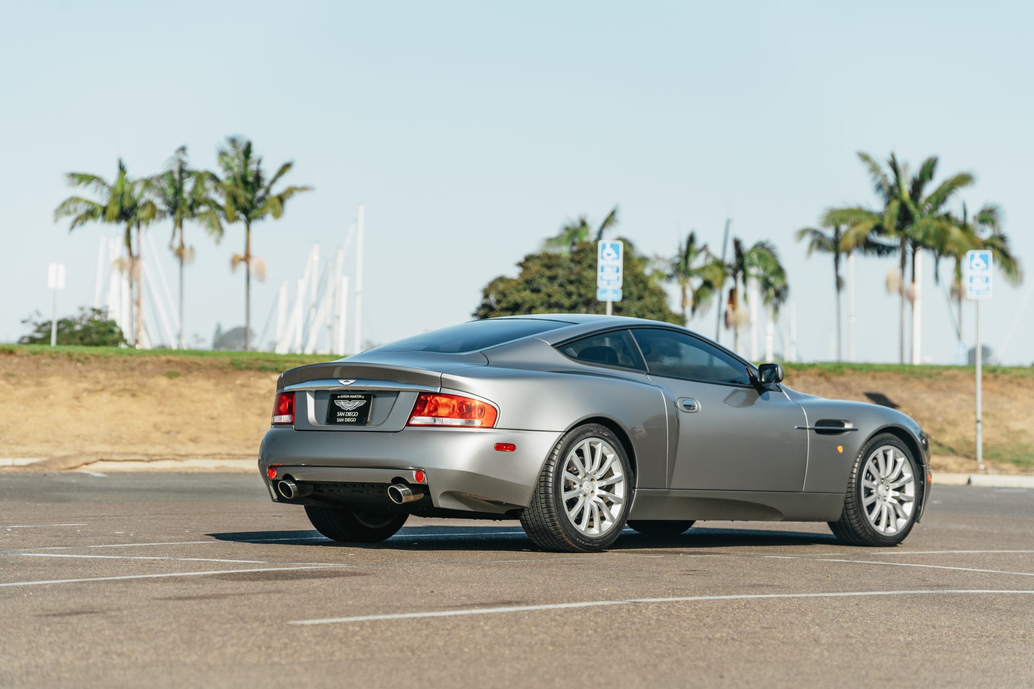 Silver 12-spoke 19″ alloy wheels wear Michelin Pilot Sport A/S 3 tires measuring 255/40 up front and 285/40 in back. Braking is handled by black-finished Aston Martin-branded calipers over ventilated cross-drilled rotors. Curb marks are visible on the right-front wheel.