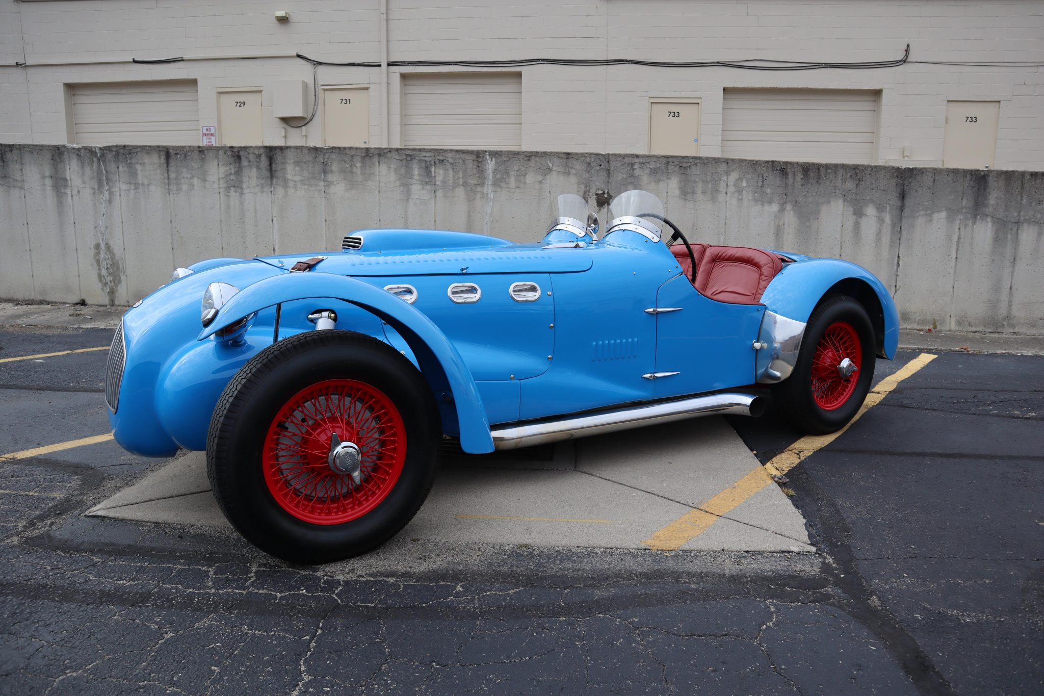 The J2X model’s aluminum bodywork shared the J2’s styling, but with its nose extended forward of the wheels and a single chin vent instead of two. This example is finished in blue and features a hood scoop, leather hood retention straps, dual windscreens, and a Monza-style fuel filler cap. A red tonneau cover is included in the sale.