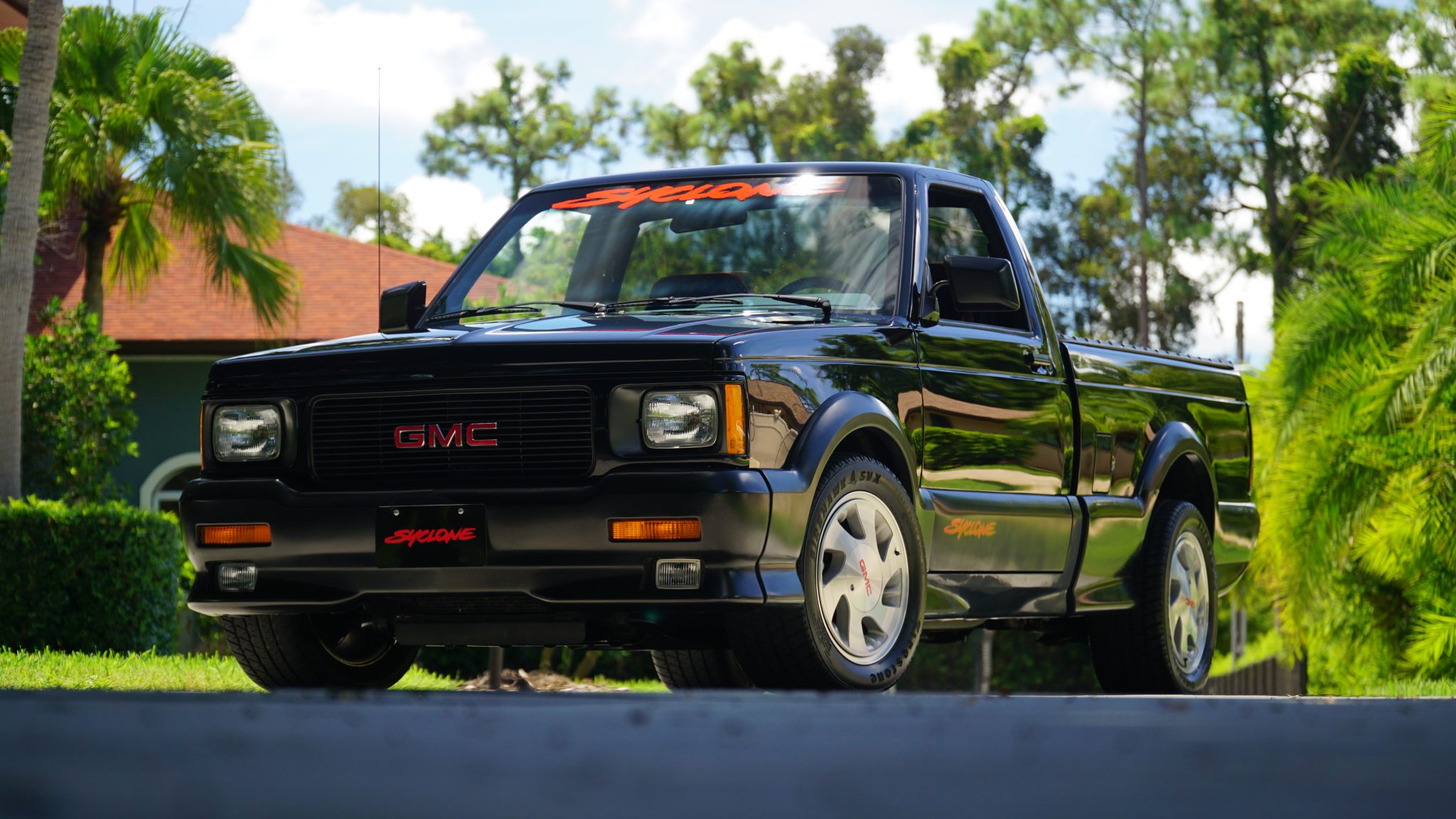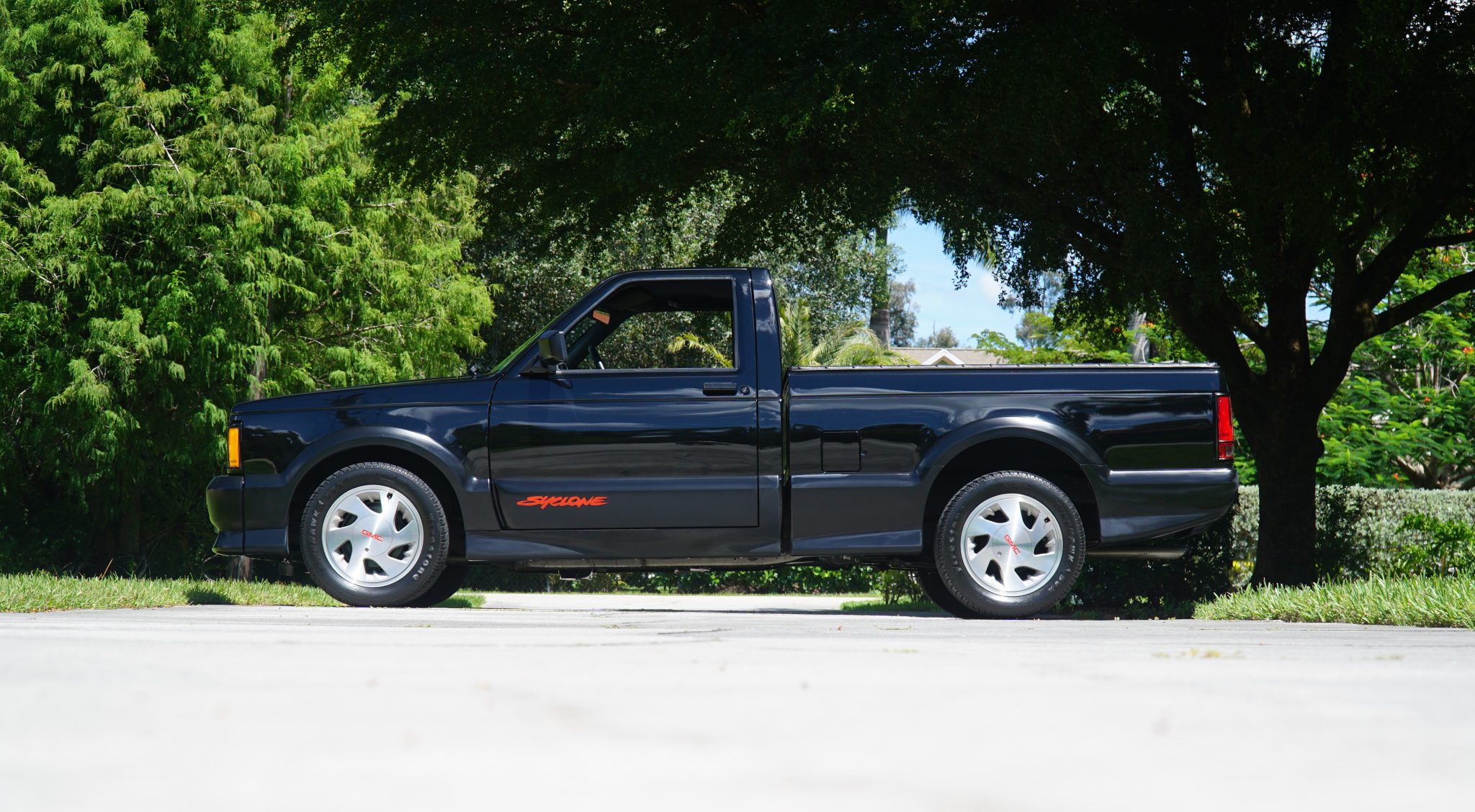 Six-spoke 16″ aluminum wheels feature GMC-branded center caps and are wrapped with older 245/50 Firestone Firehawk SVX tires. The truck is equipped with power steering, a sport-tuned suspension with Bilstein shock absorbers, and front disc brakes. The selling dealer notes the brake booster was replaced in August 2022, and the malfunction-indicator light for the four-wheel ABS system is on.