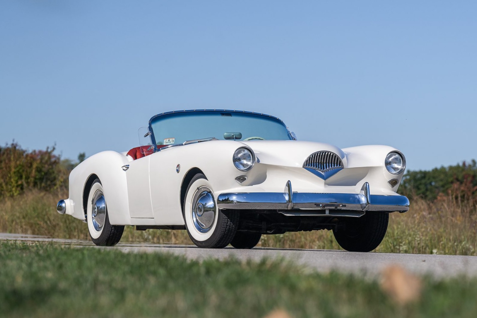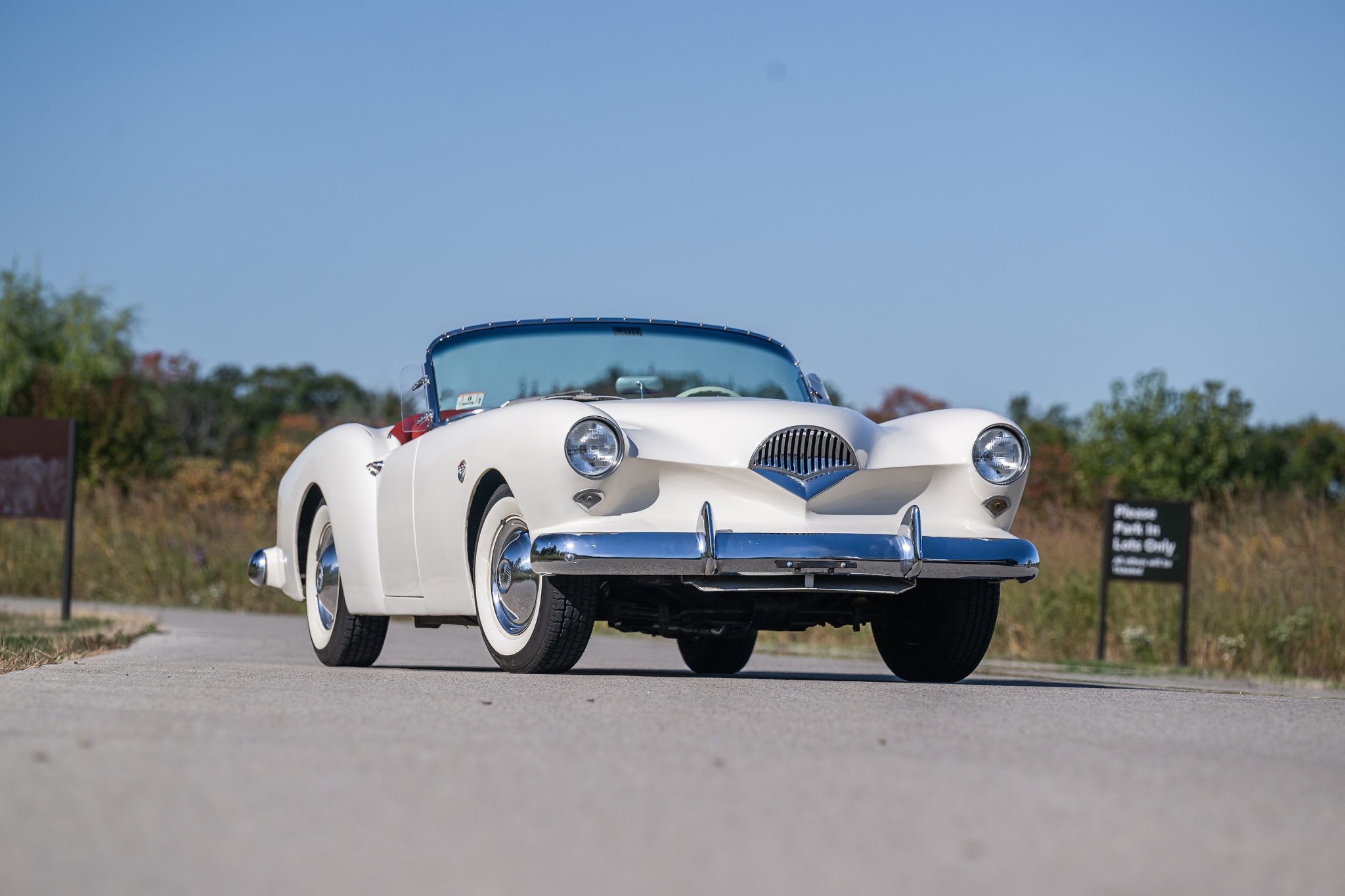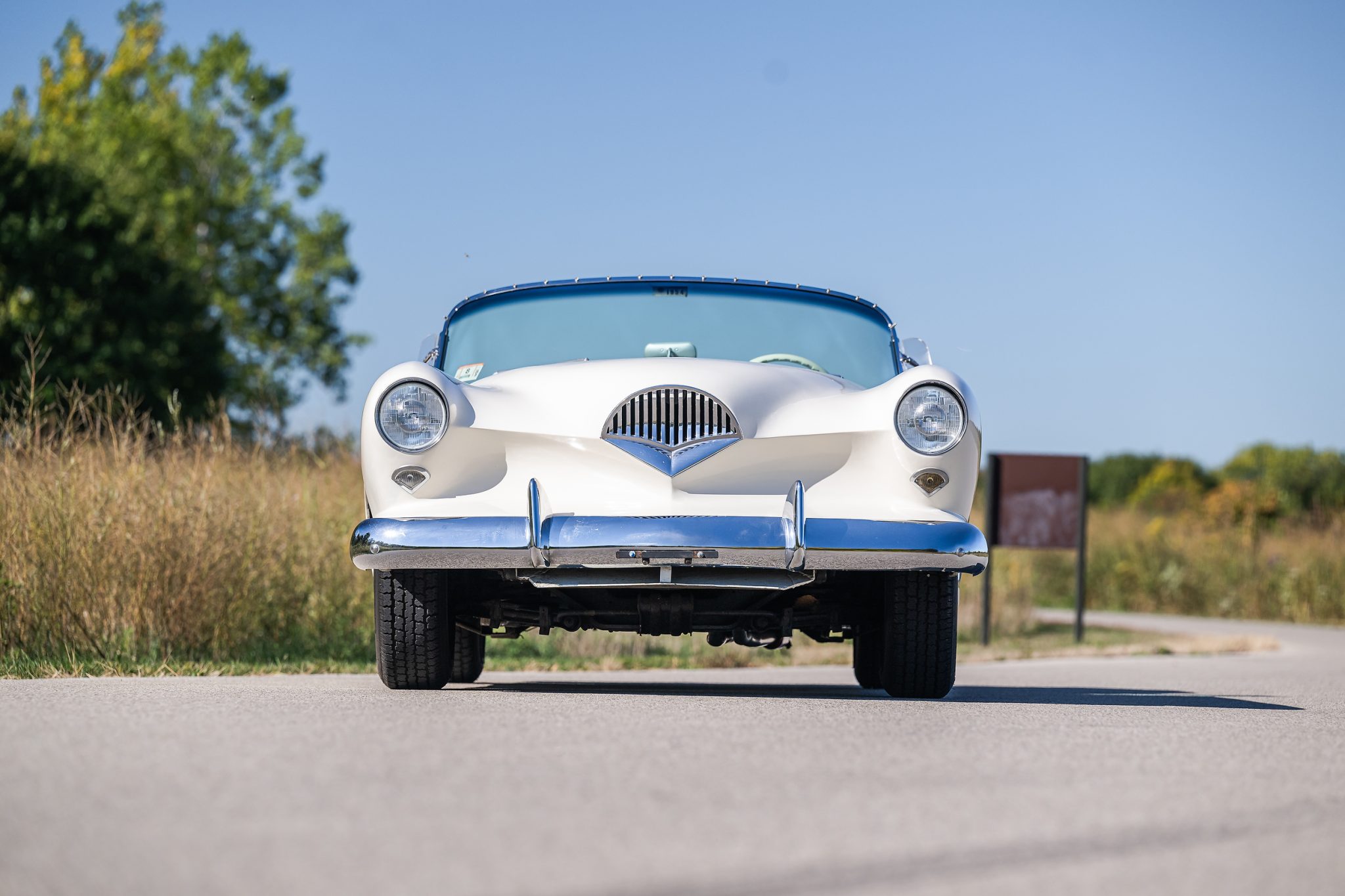 The body-color steel wheels wear chrome hubcaps and are mounted with 195/75 American Classic radial whitewall tires. A spare wheel and tire are mounted under a red vinyl cover in the trunk. The Darrin’s chassis was based on the contemporary Henry J, featuring an independent front suspension and a live rear axle with leaf springs. Stopping power is provided by four-wheel drums shared with the contemporary Kaiser Manhattan.