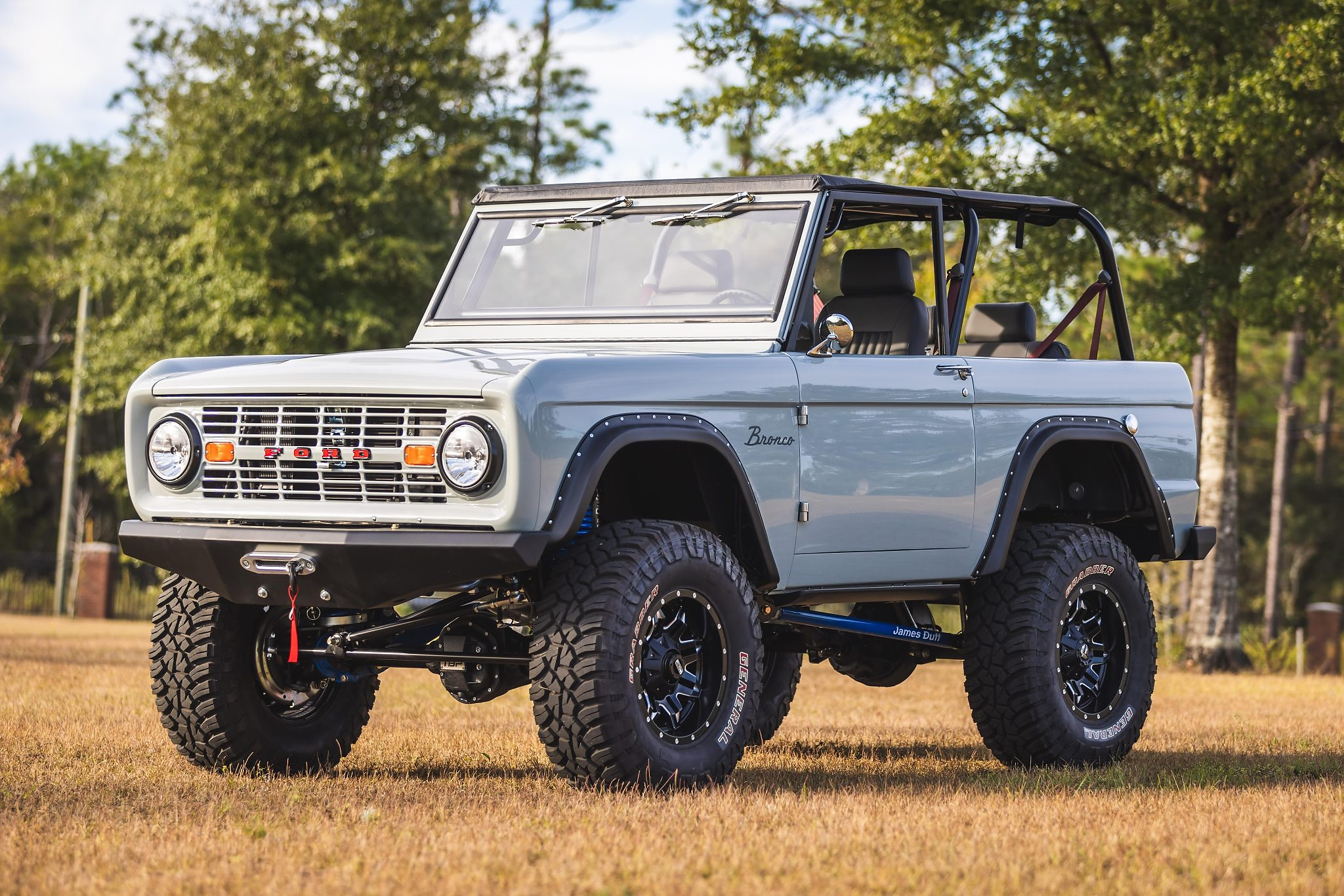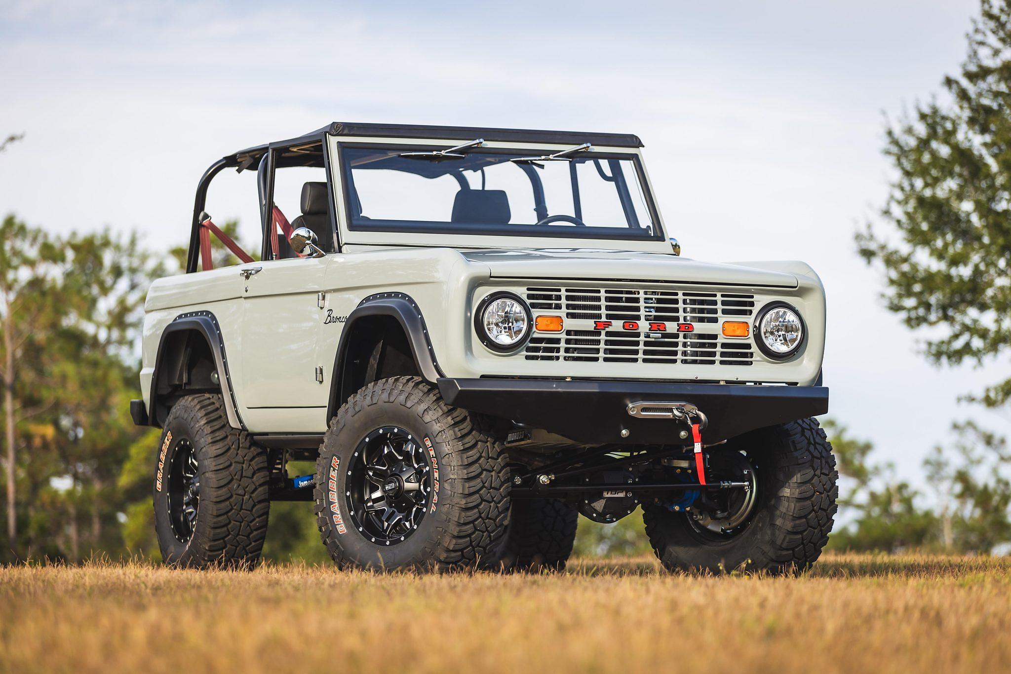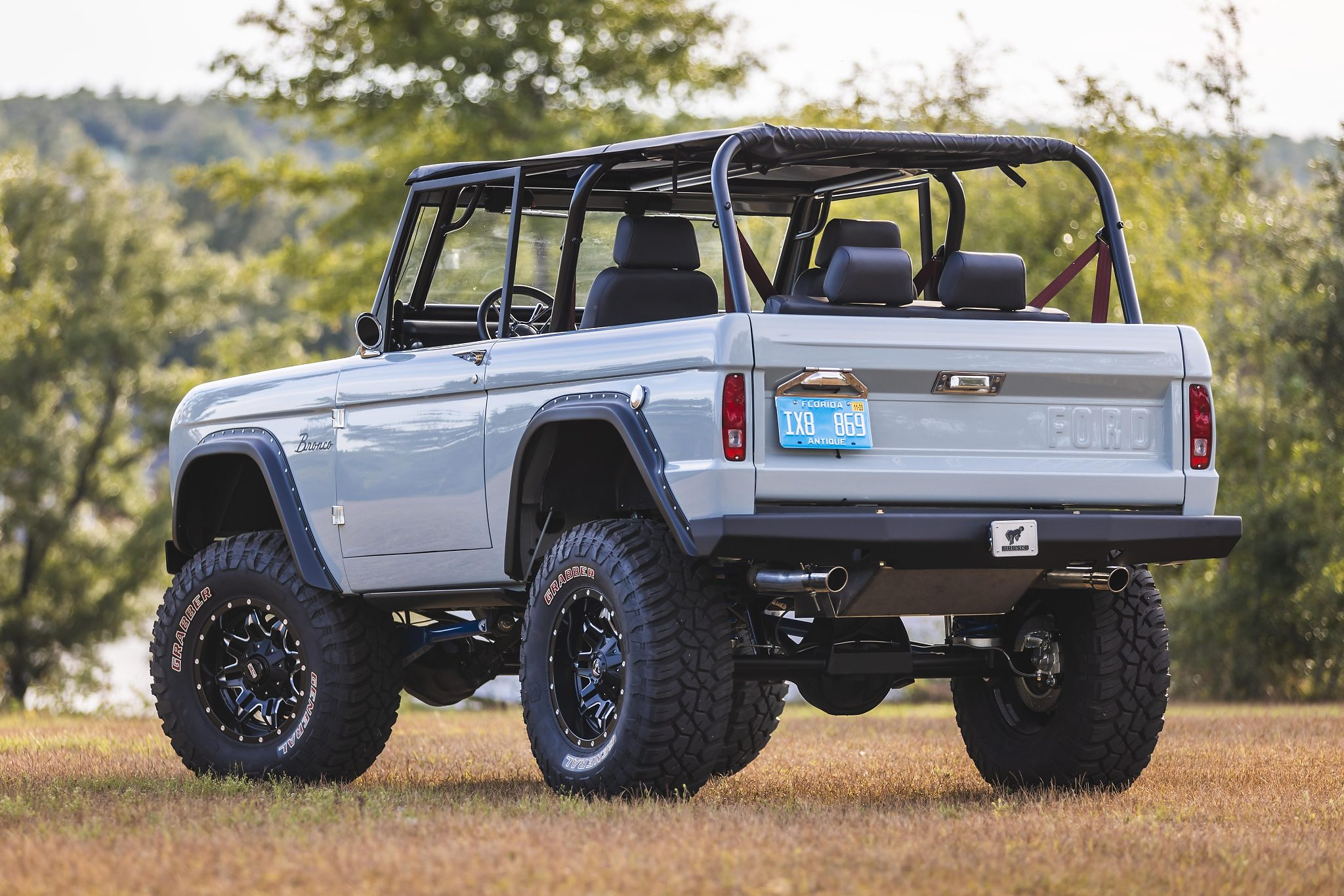 Fuel 17″ alloy wheels are wrapped in 35×12.50 General Grabber tires. Stopping power is from four-wheel discs, and replacement brake lines have been installed. The steering and suspension systems were fitted with James Duff components including a four-link rear setup, quad rear shock absorbers, and front coil springs.