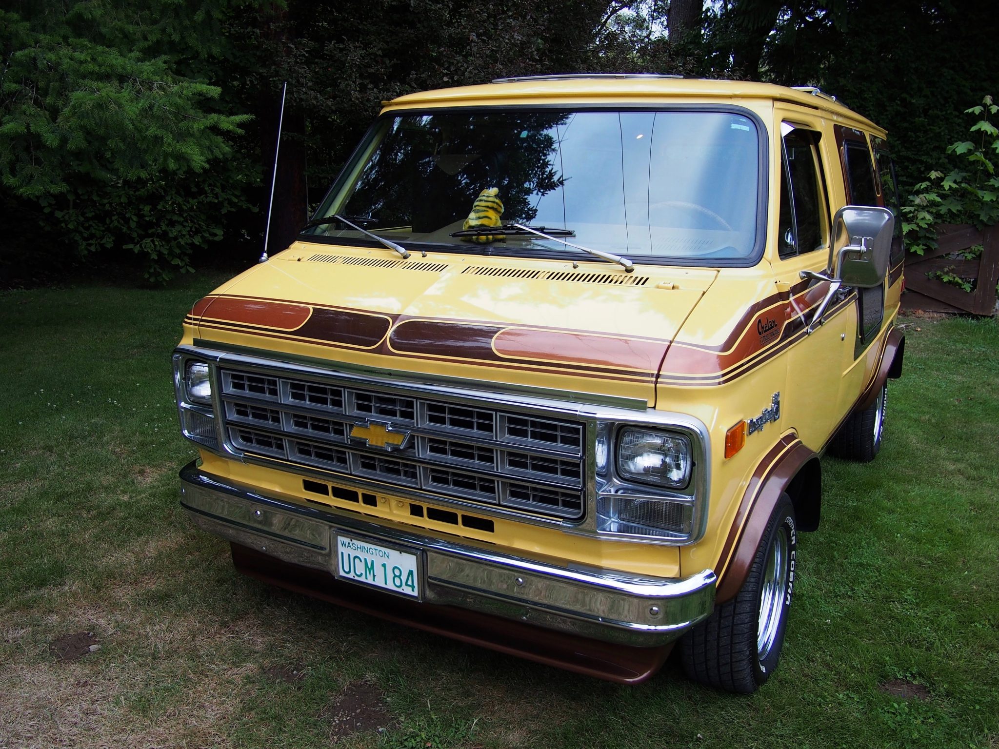 Chrome 15″ wagon wheels wear 235/60 Cooper Cobra tires that show date codes from 2020, while a spare tire with a cover is mounted on the right rear door. Braking is provided by front discs and rear drums, and the van is equipped with power steering and heavy-duty rear springs. Service performed under current ownership reportedly included replacing the brake pads and shoes, wheel cylinders, and brake hoses. Discoloration is visible on one of the wheels.