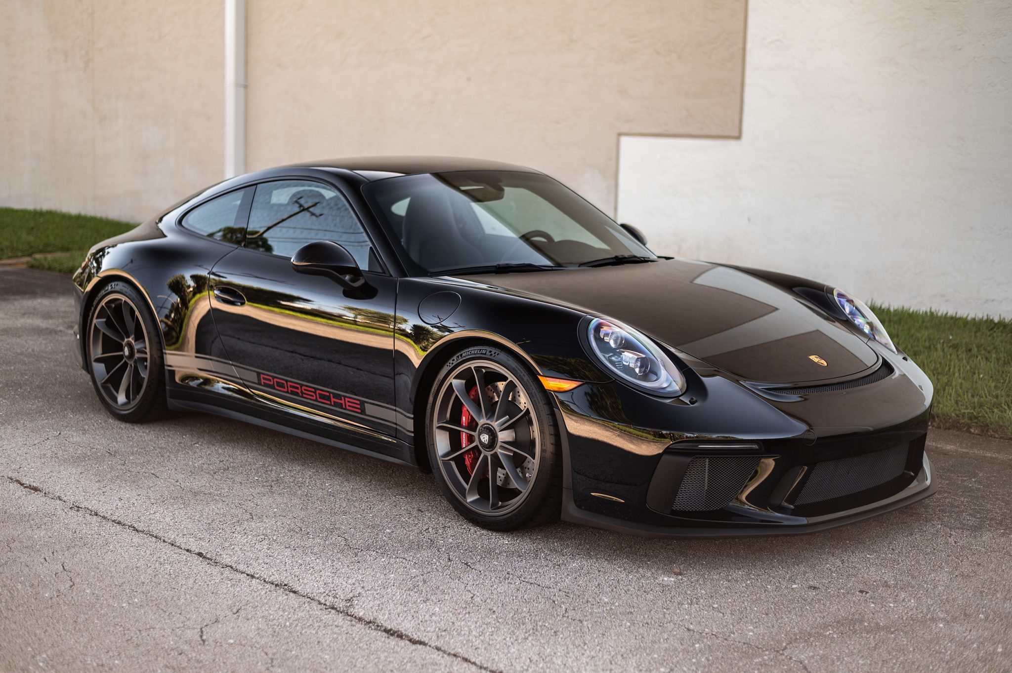 Platinum-finished 20″ center-locking wheels are mounted with Michelin Pilot Sport Cup 2 tires. Braking is handled by red Porsche-branded calipers over cross-drilled and ventilated discs. The car was optioned with a front-axle lift system.