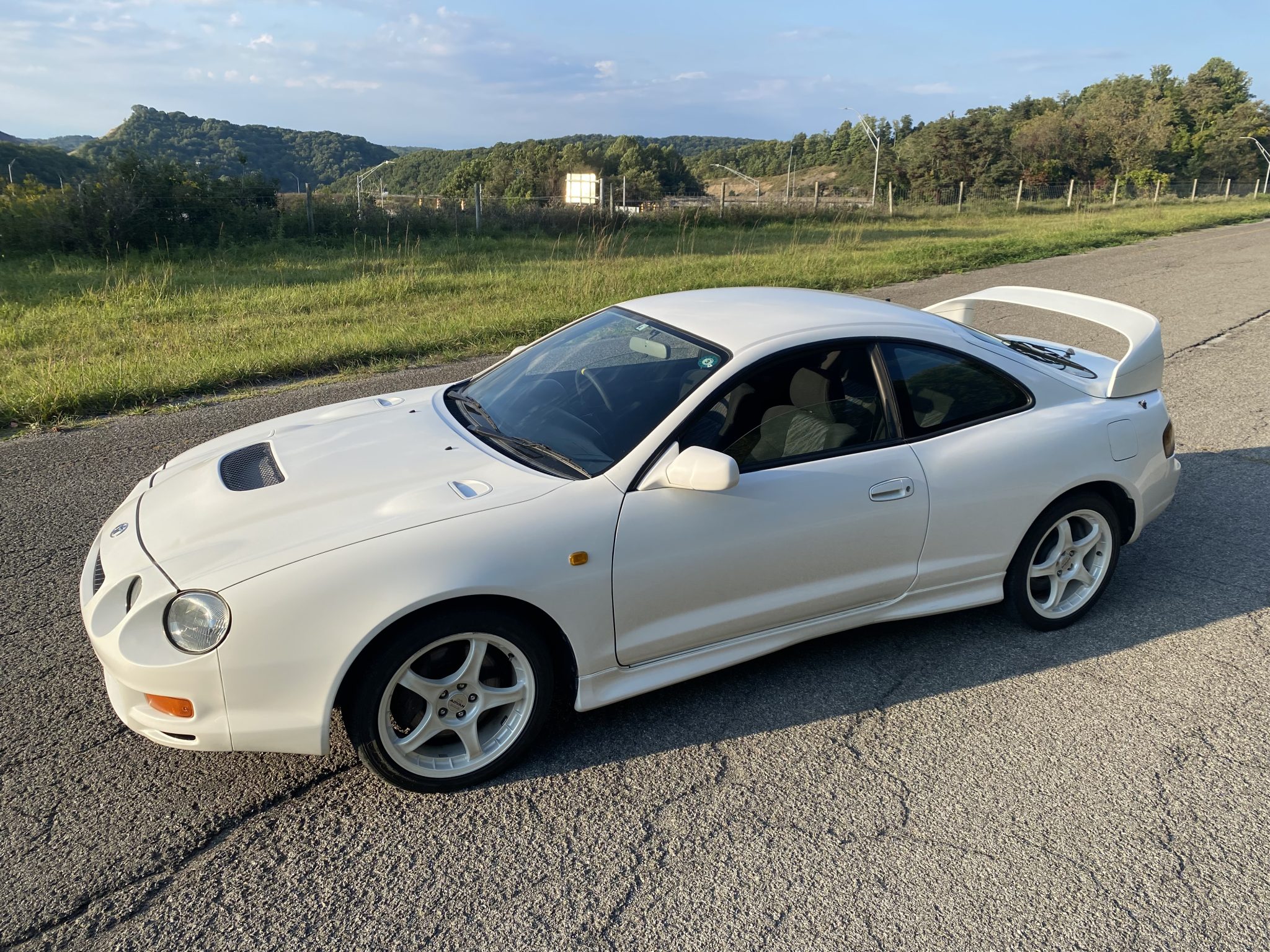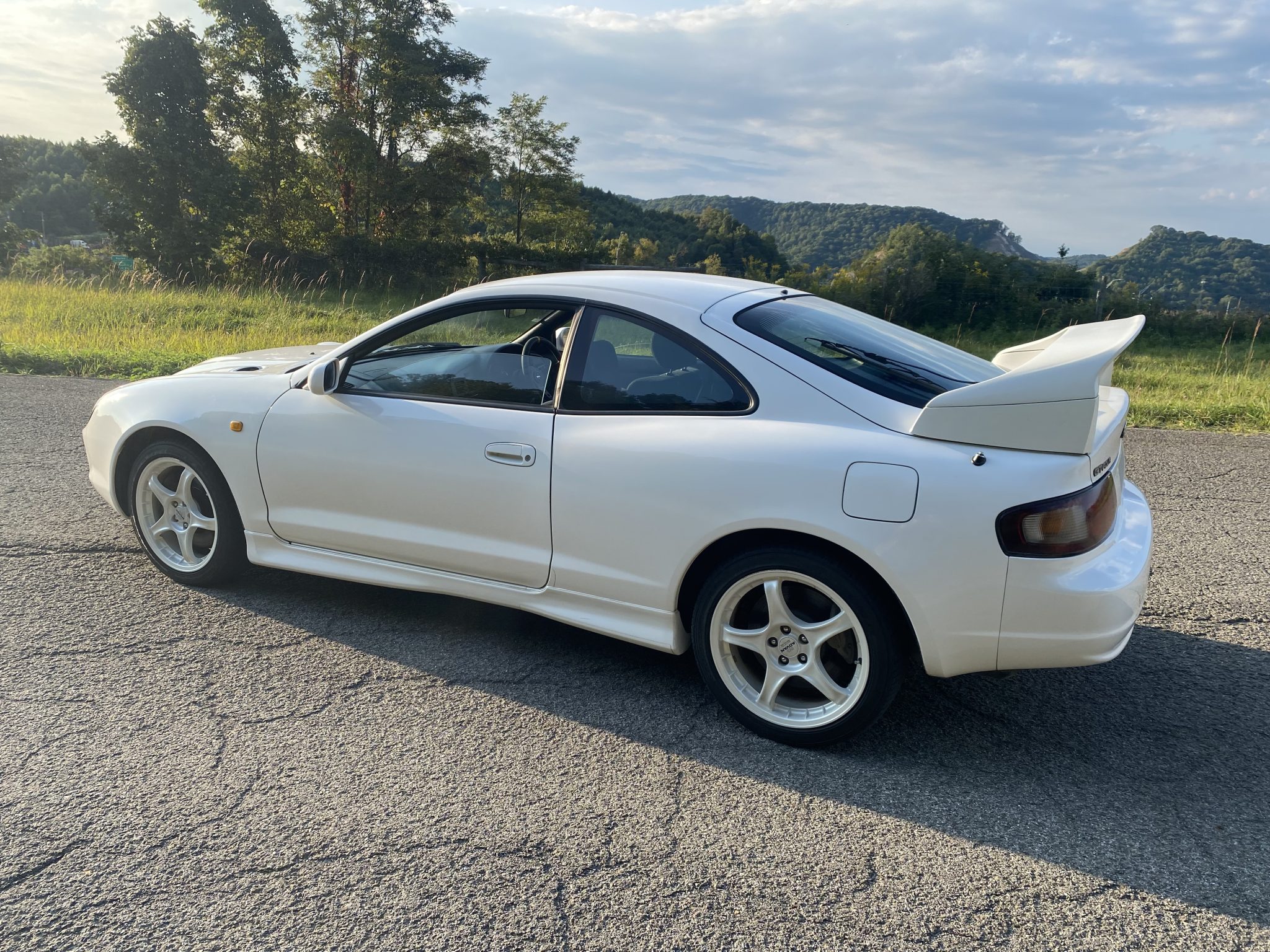 White-painted 17″ Advan RC wheels are wrapped in 215/45 Goodyear Eagle RVS tires. Sport ABS was introduced to the Celica in 1996, and stopping power is provided by four-wheel disc brakes with Celica-branded calipers. The front suspension features the Toyota “Superstrut” system, and the left-front camber control link and control arms were replaced under current ownership. Photos show curb marks on the wheels.