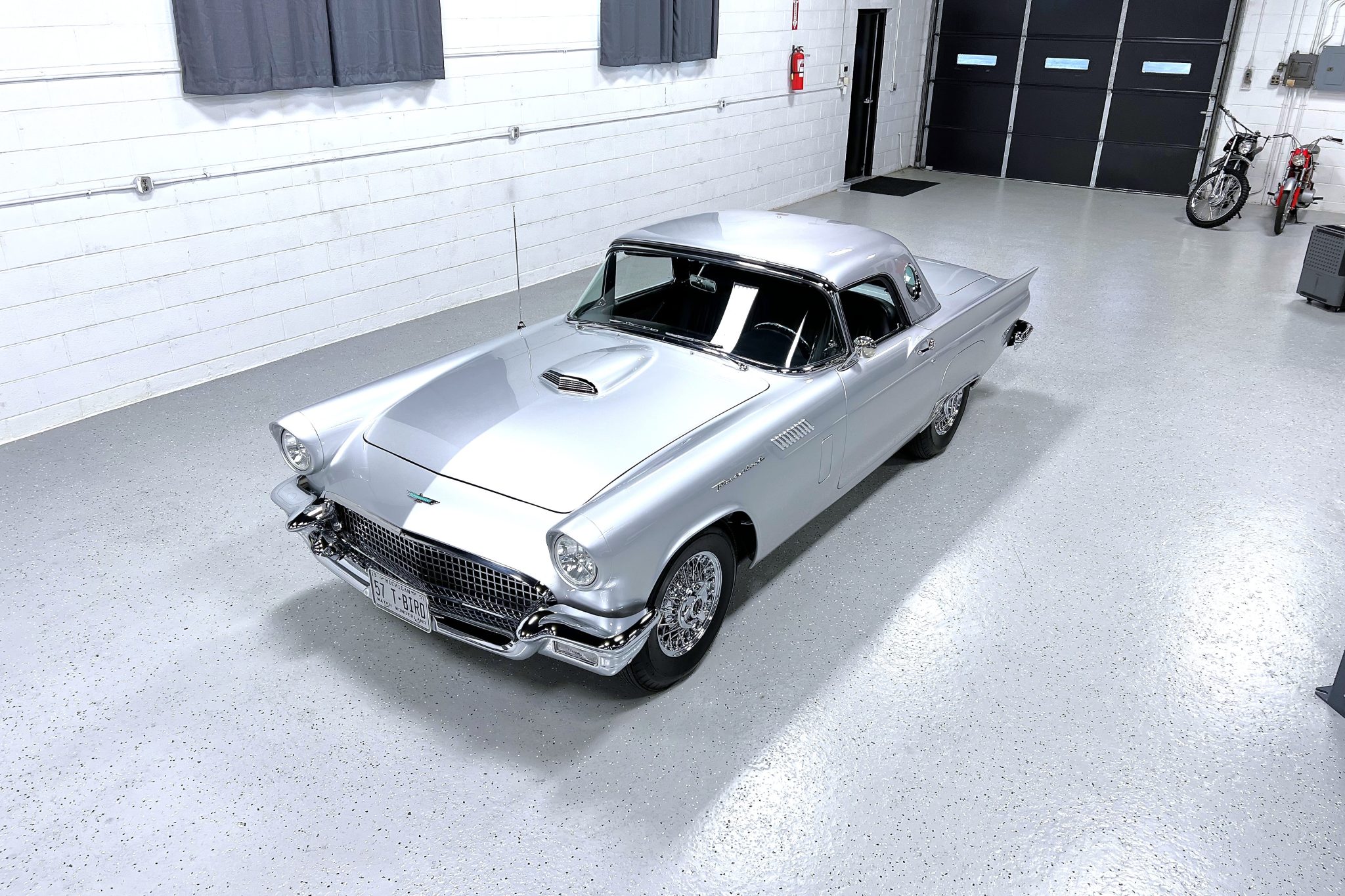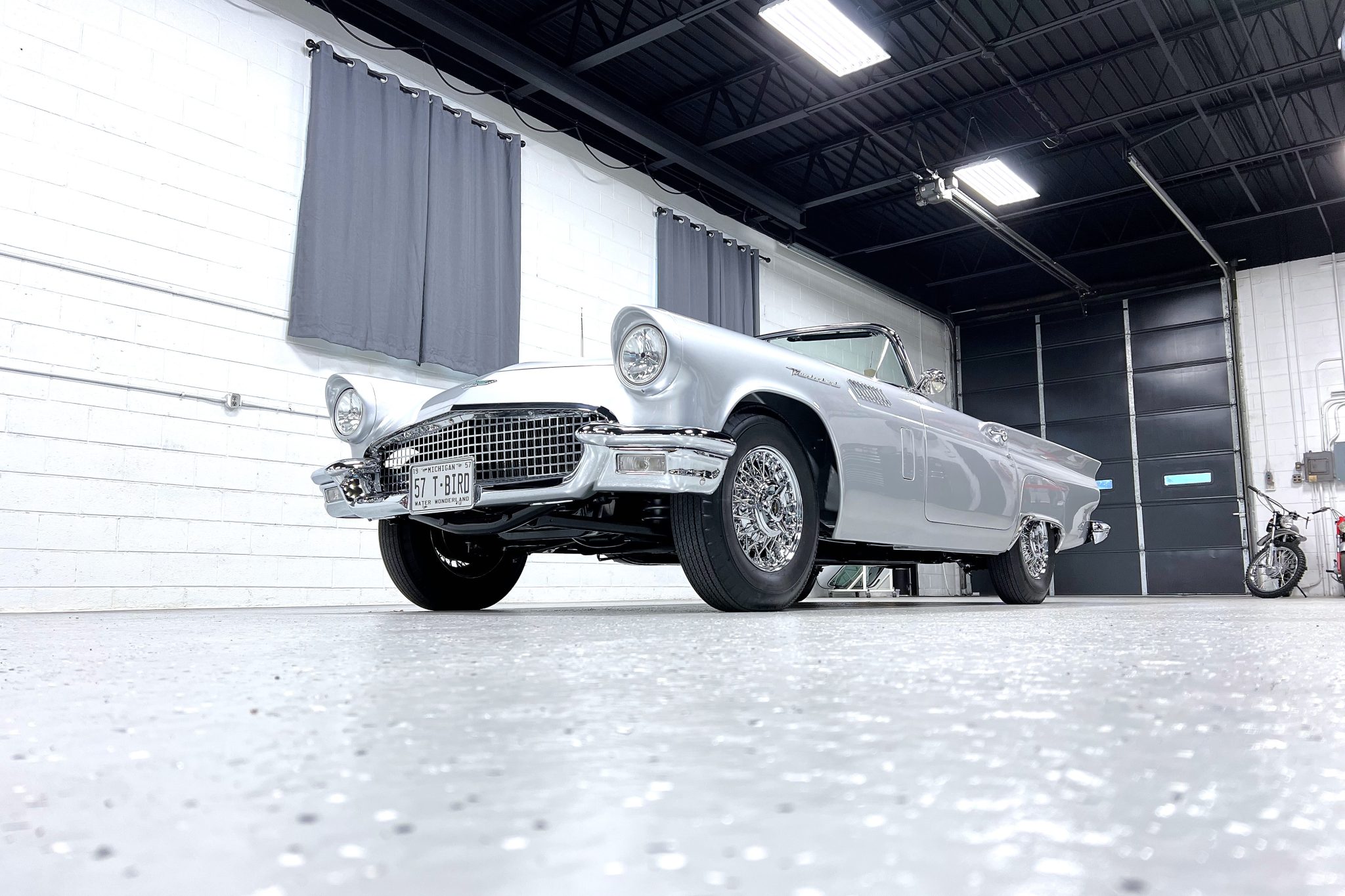 Chrome 15″ Coker wire wheels are mounted with Coker Classic tires. The car is equipped with power steering and four-wheel disc brakes.