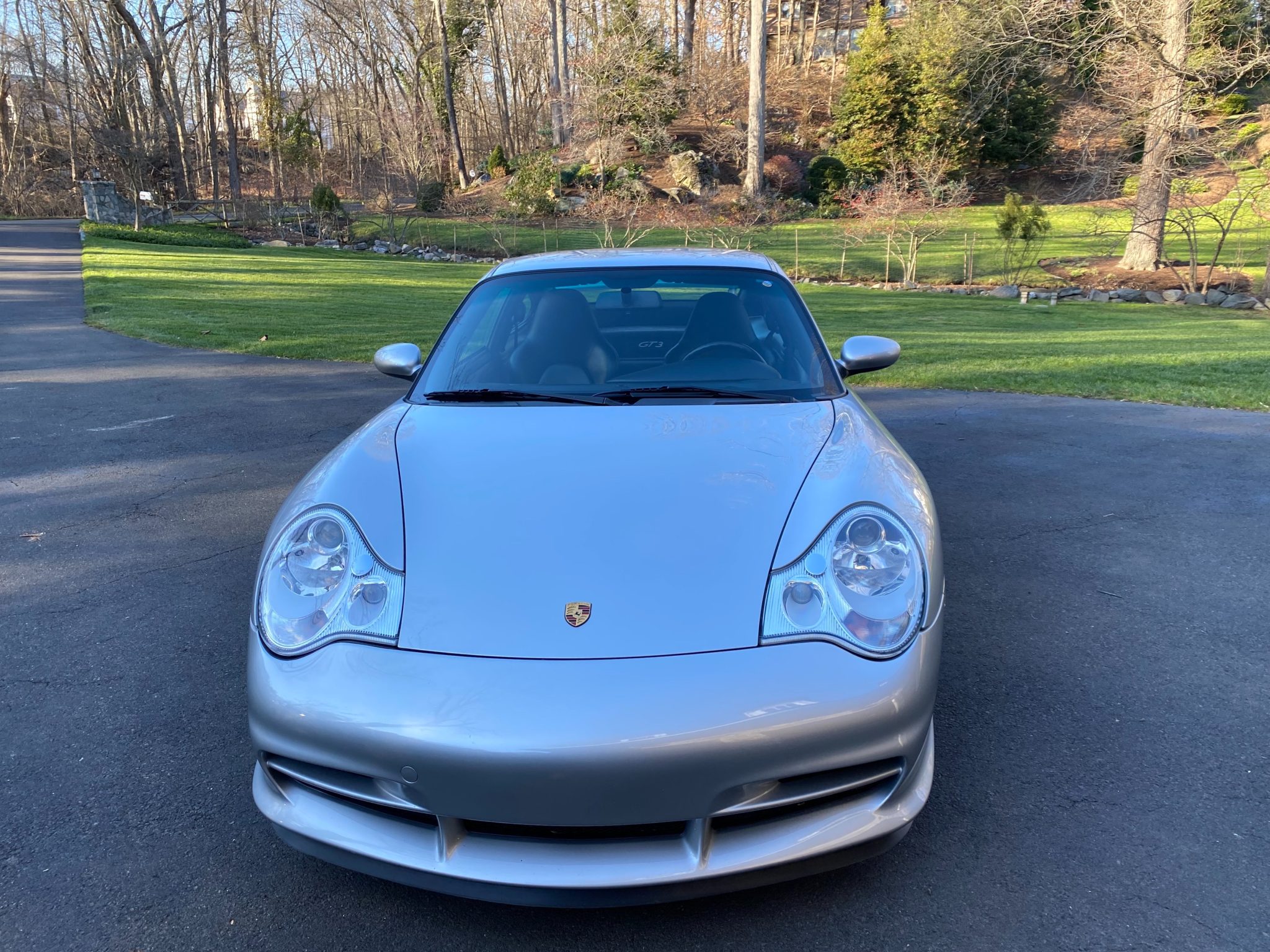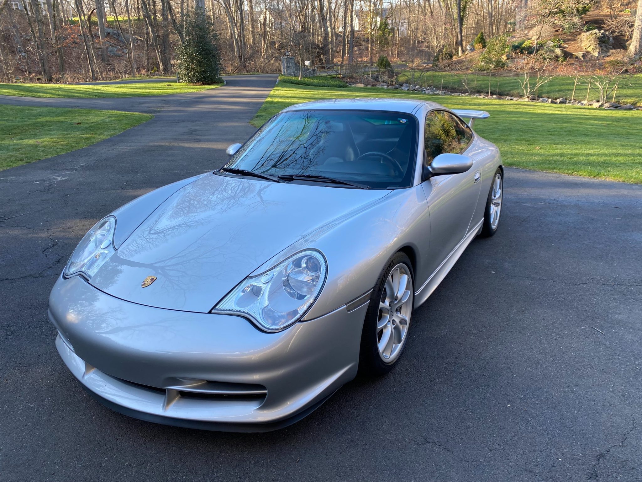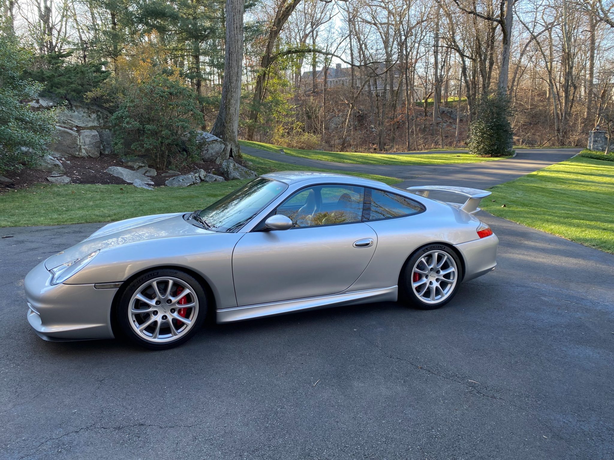 Staggered-width 18″ GT3 wheels are wrapped in 235/40 front and 295/30 rear Michelin Pilot Sport 4S tires that show 2021 date codes. Braking is from red-finished Porsche-branded calipers over slotted front and cross-drilled rear rotors, and Girodisc front spacers are fitted. The suspension is lowered and modified with a Sharkwerks rear link kit, rear toe steer kit, and rear toe lock plate set. A power-steering line was repaired under current ownership.