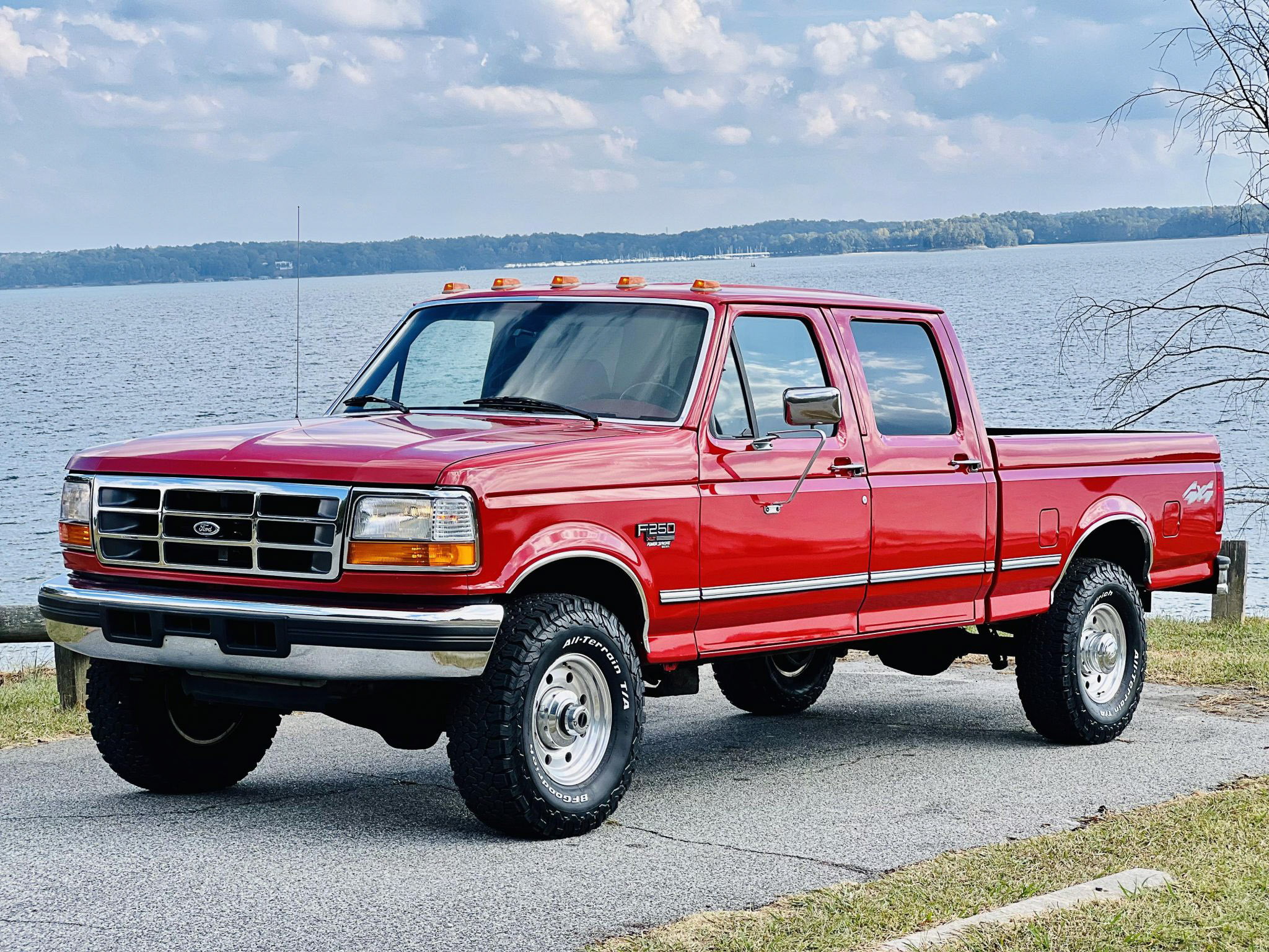 Polished 16″ forged alloy wheels show flaws pictured below and wear 285/75 BFGoodrich Radial T/A tires. The seller states that the tires and brake pads were replaced in July 2022.