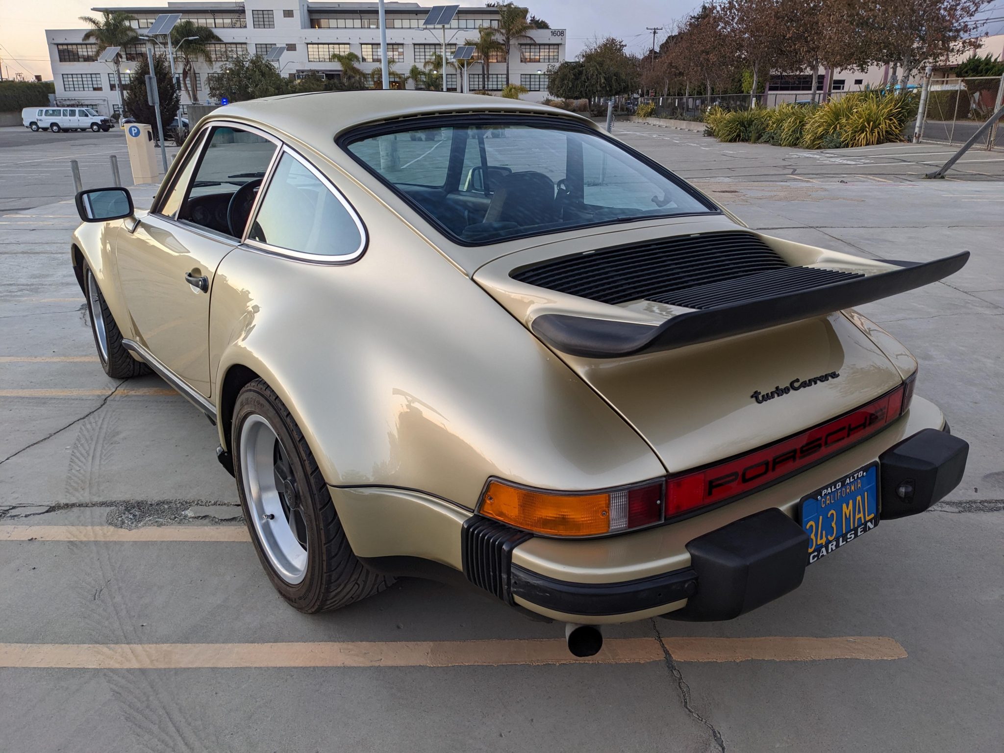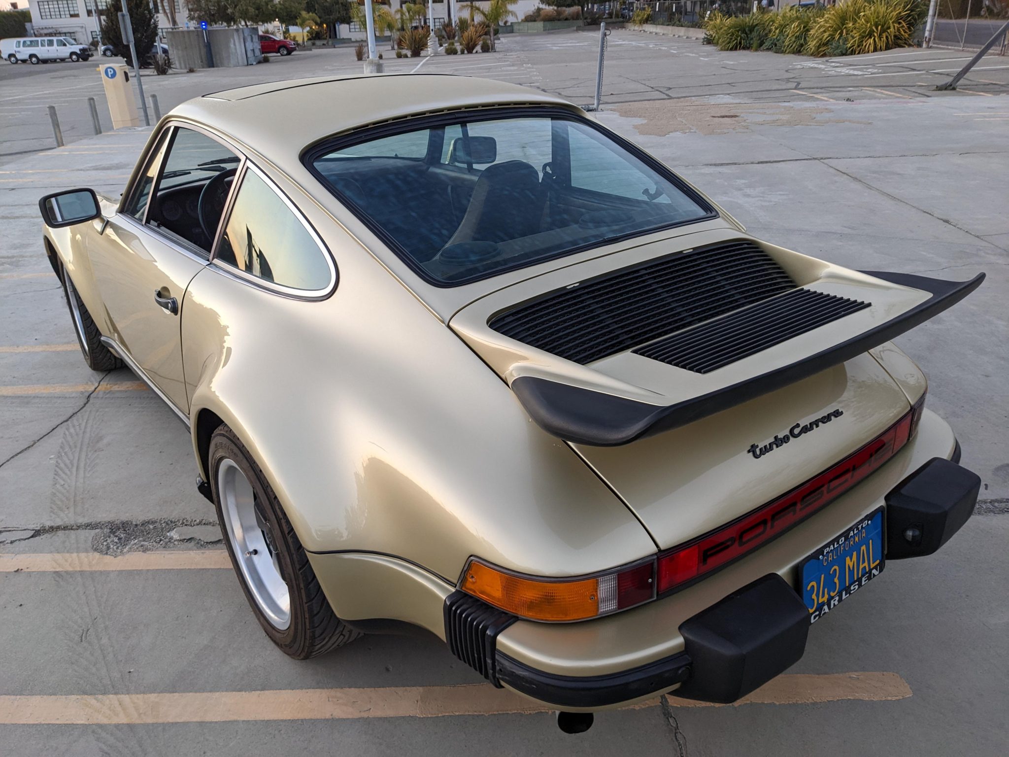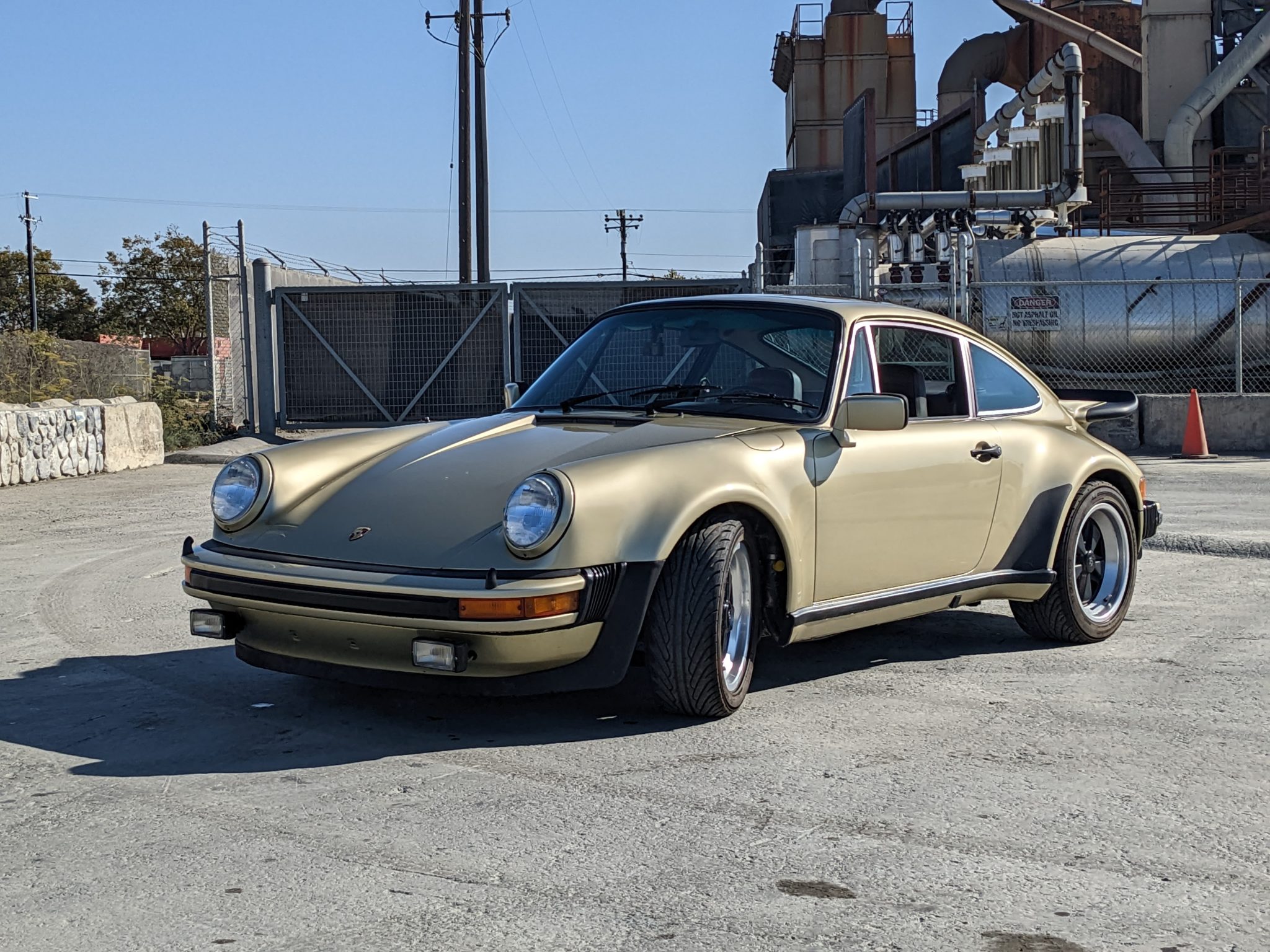 16” staggered-width Fuchs alloy wheels wear older Yokohama ES100 tires. The 930 was equipped with four-wheel disc brakes, and the rubber brake hoses were replaced within the last two years according to the seller.