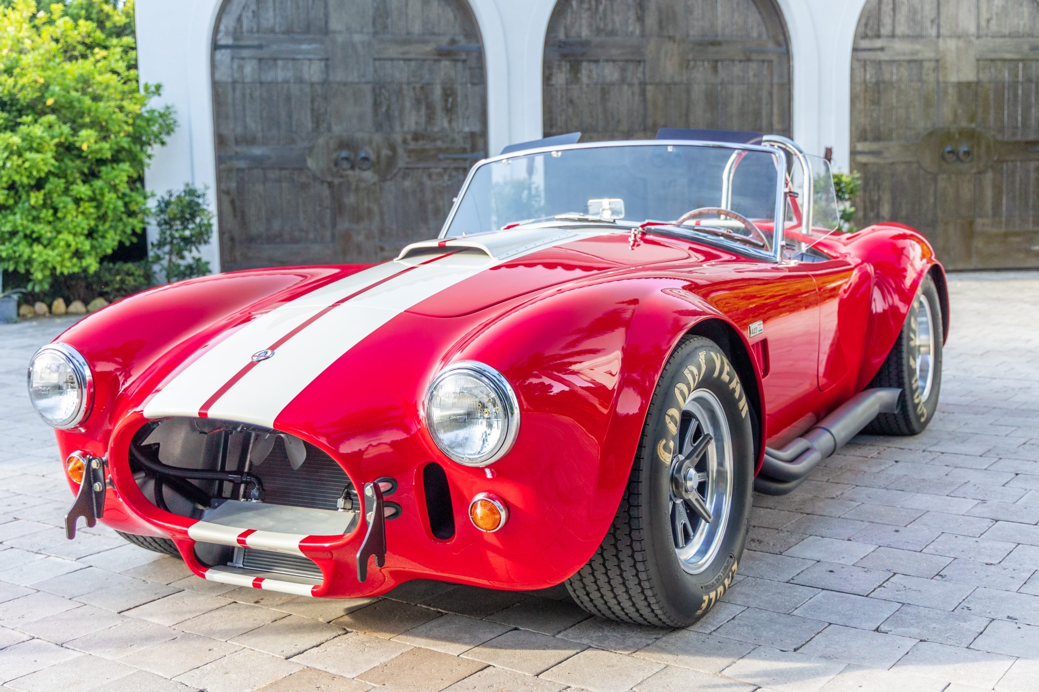 The 15” Halibrand-style wheels are secured by three-eared knock-off spinners retained by safety wire and are mounted with Goodyear Eagle white-letter tires. Braking is through Baer four-wheel discs with Shelby-branded front calipers. The car rides on four-wheel independent suspension with coilovers and rack-and-pinion steering.