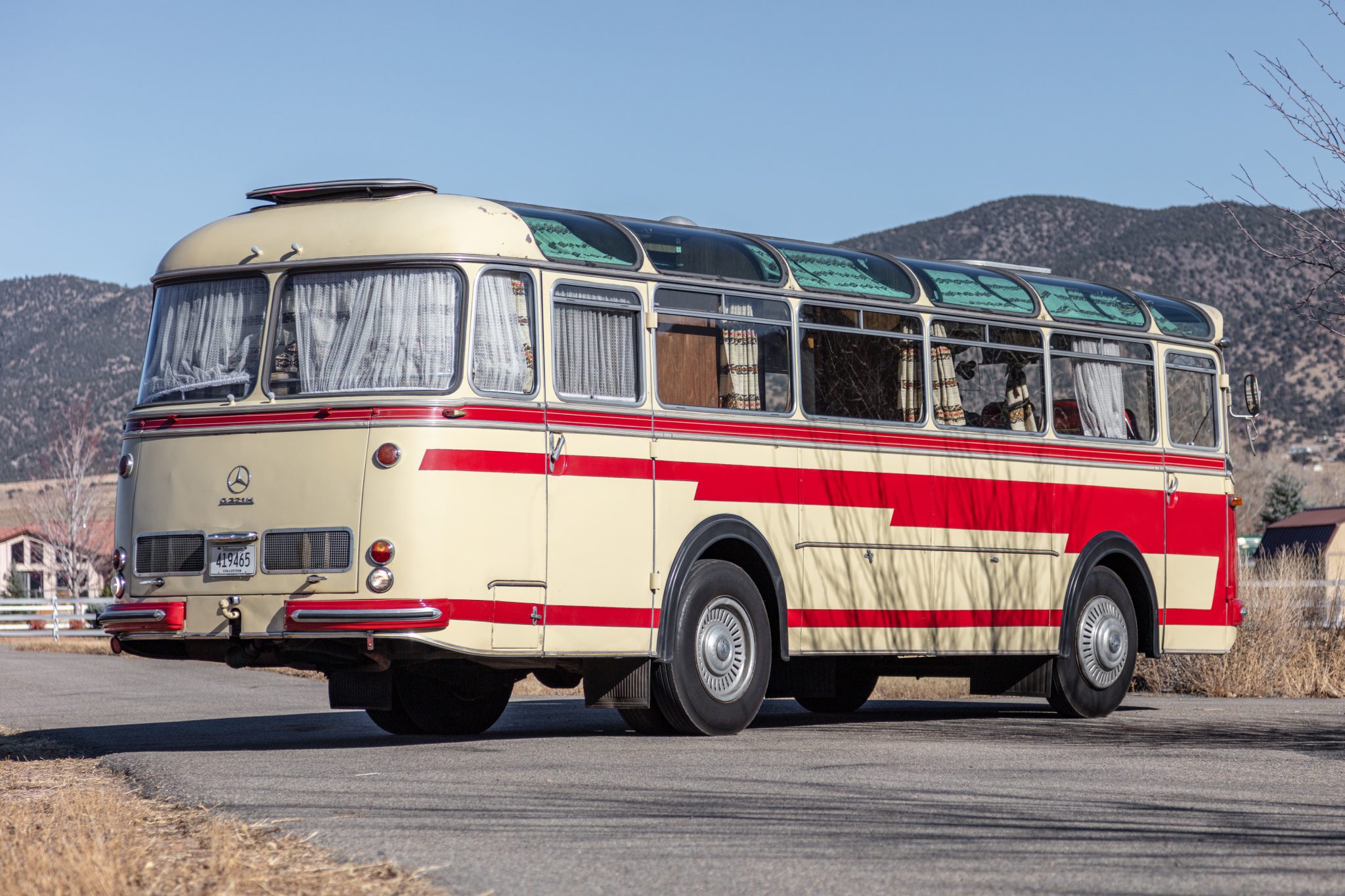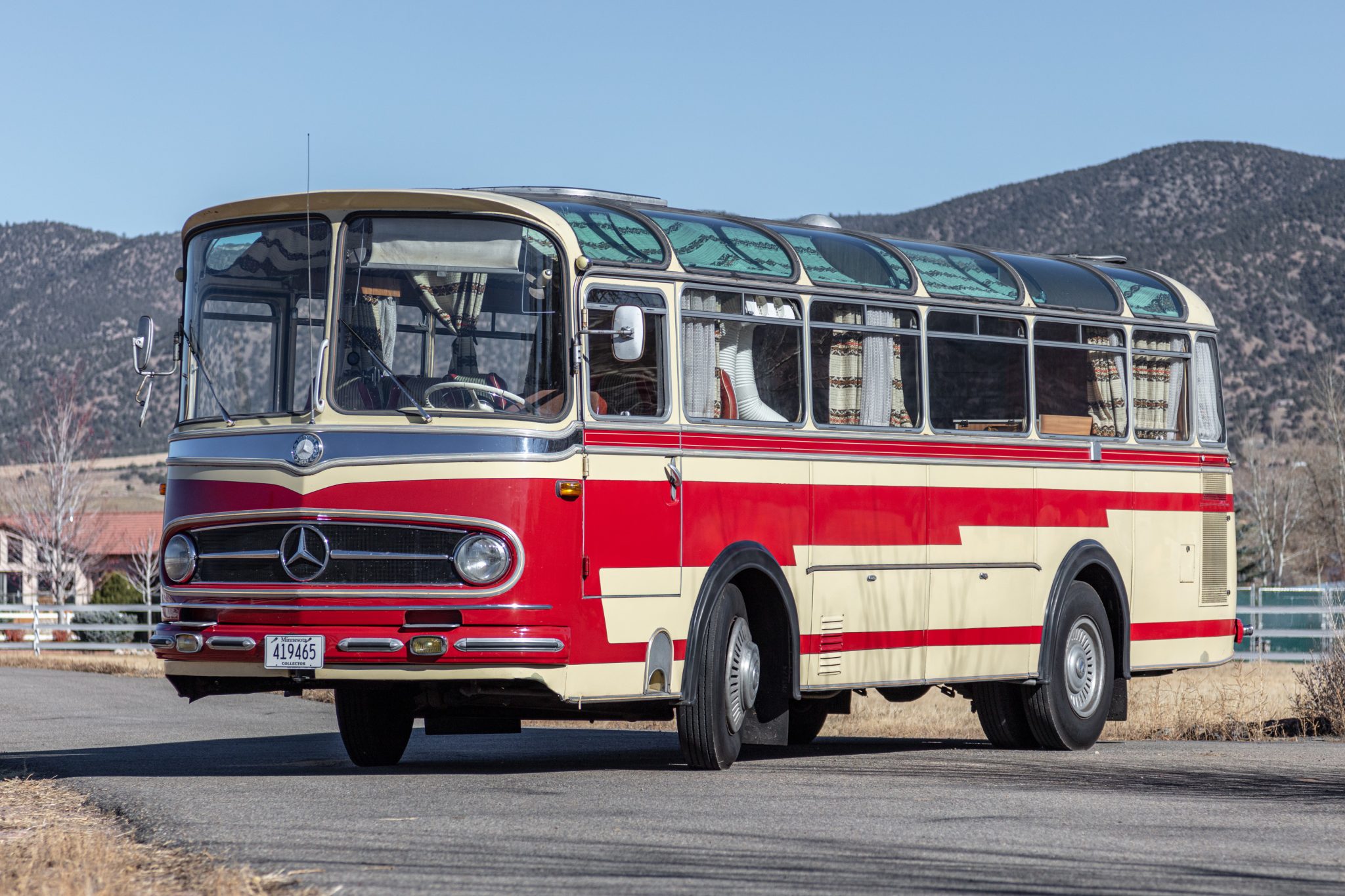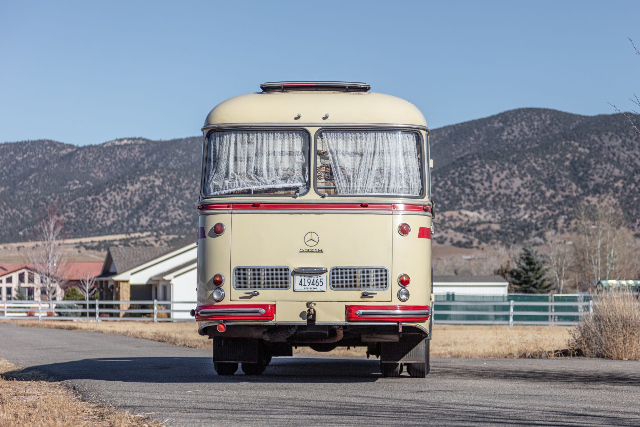 Steel 20″ wheels wear vented covers and are wrapped in 8-25 Sumitomo ST 727 tires showing 2012 date codes. The bus is equipped with drum brakes and a dually rear axle. The brakes were reportedly adjusted under current ownership.