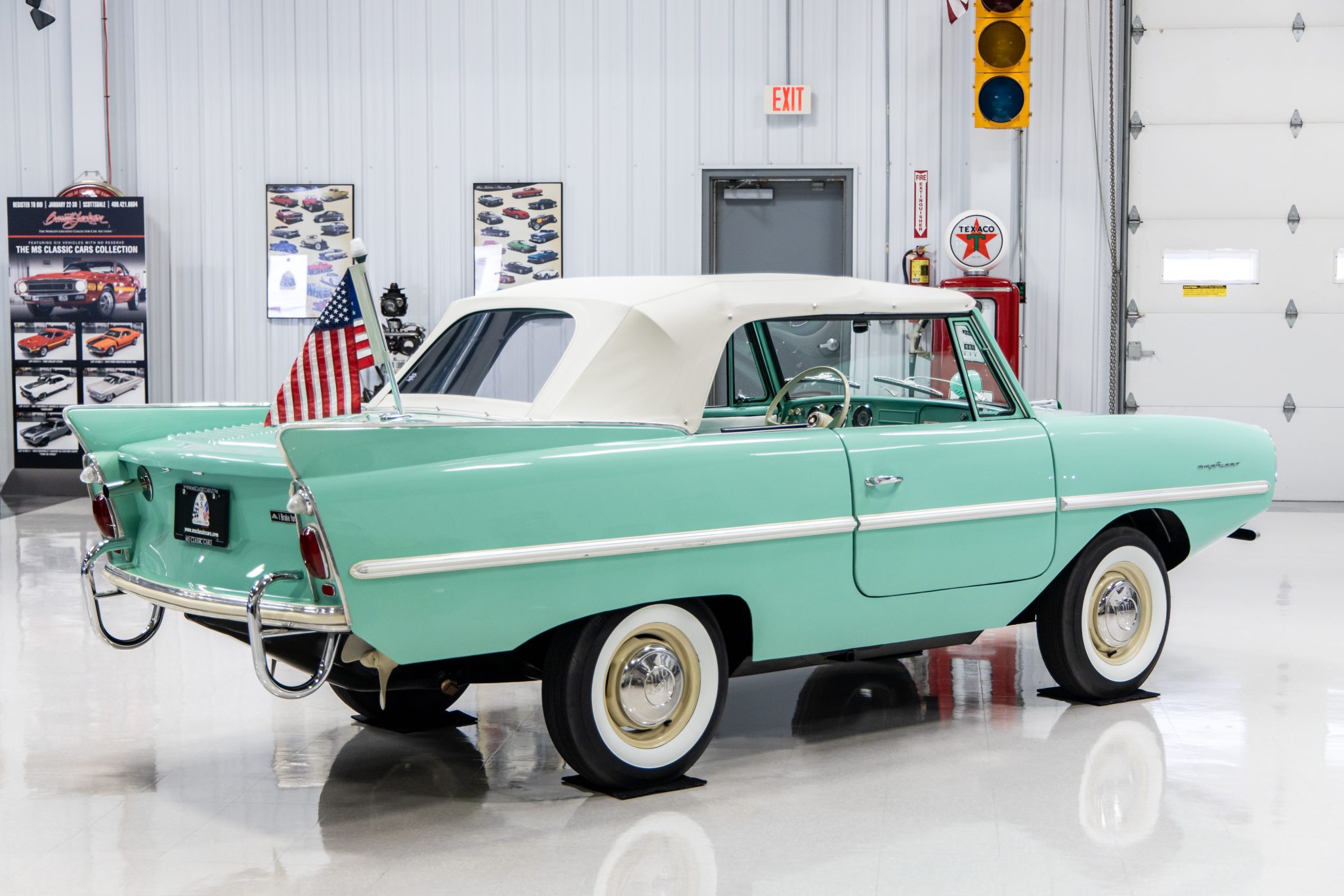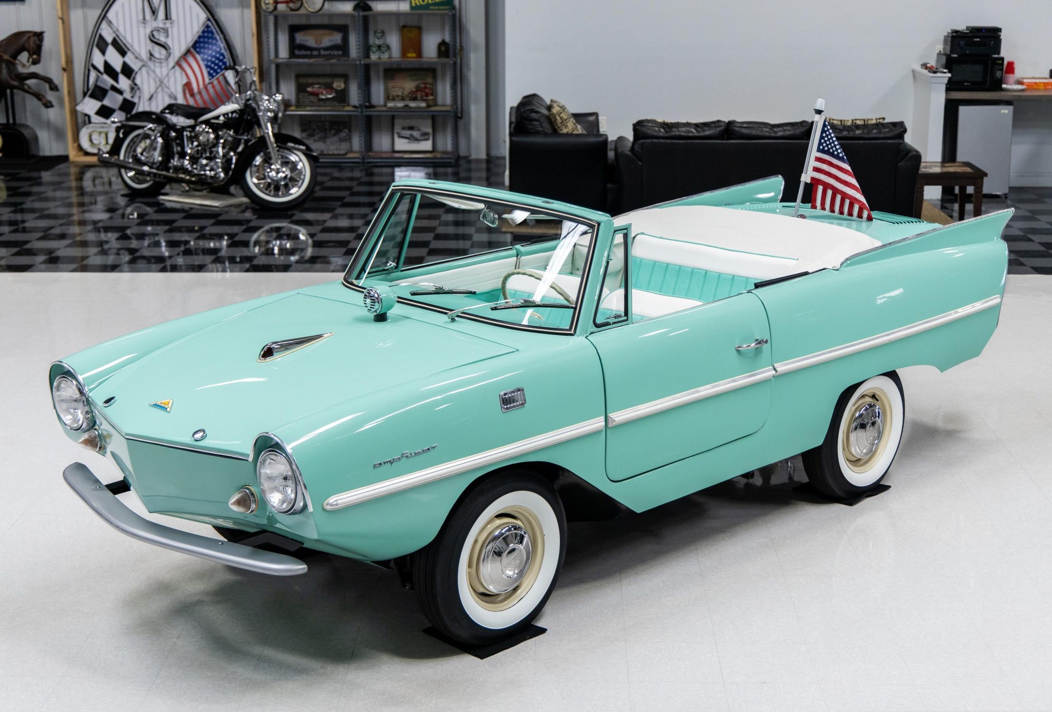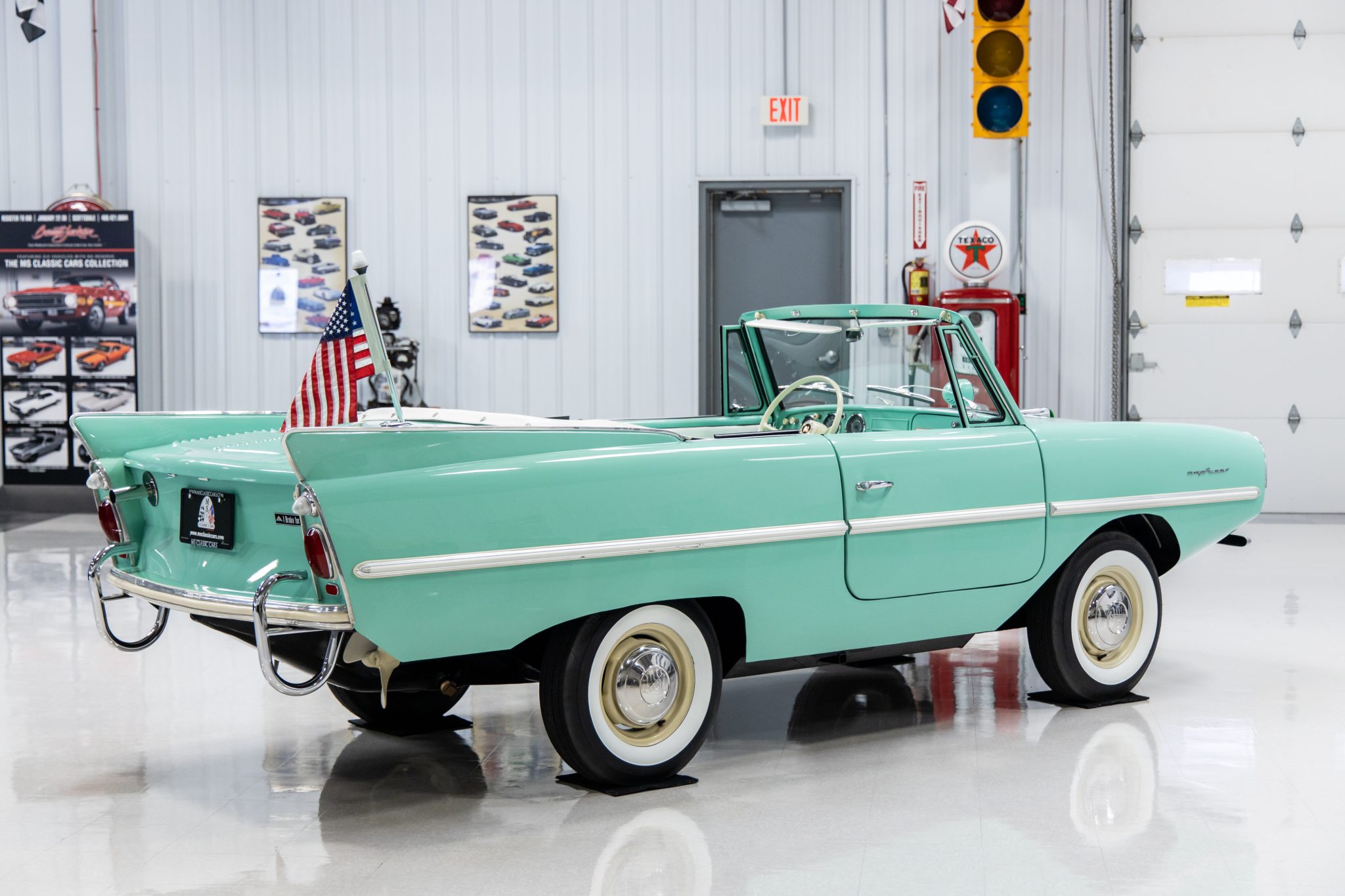 Yellow 13″ steel wheels wear Amphicar-branded hubcaps and are mounted with 6.5-13 Coker Classic wide whitewall tires that were installed in October 2022, while a matching spare is located in the front storage compartment. The front wheels serve as rudders when the car is afloat, and braking while on land is handled by hydraulic drums at each corner. Service under current ownership involved replacing the front shocks, tie rod end boots, and rear wheel cylinders.