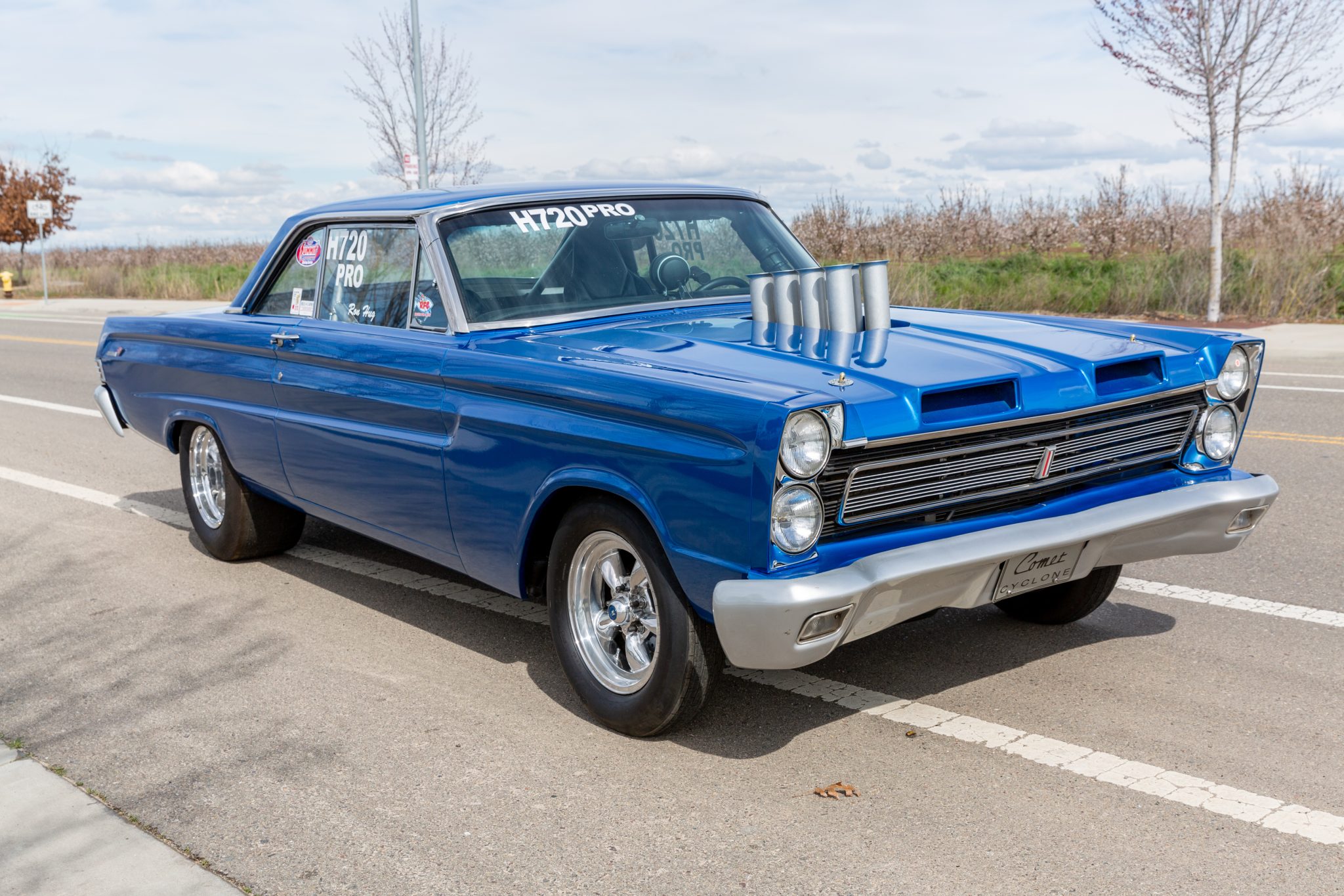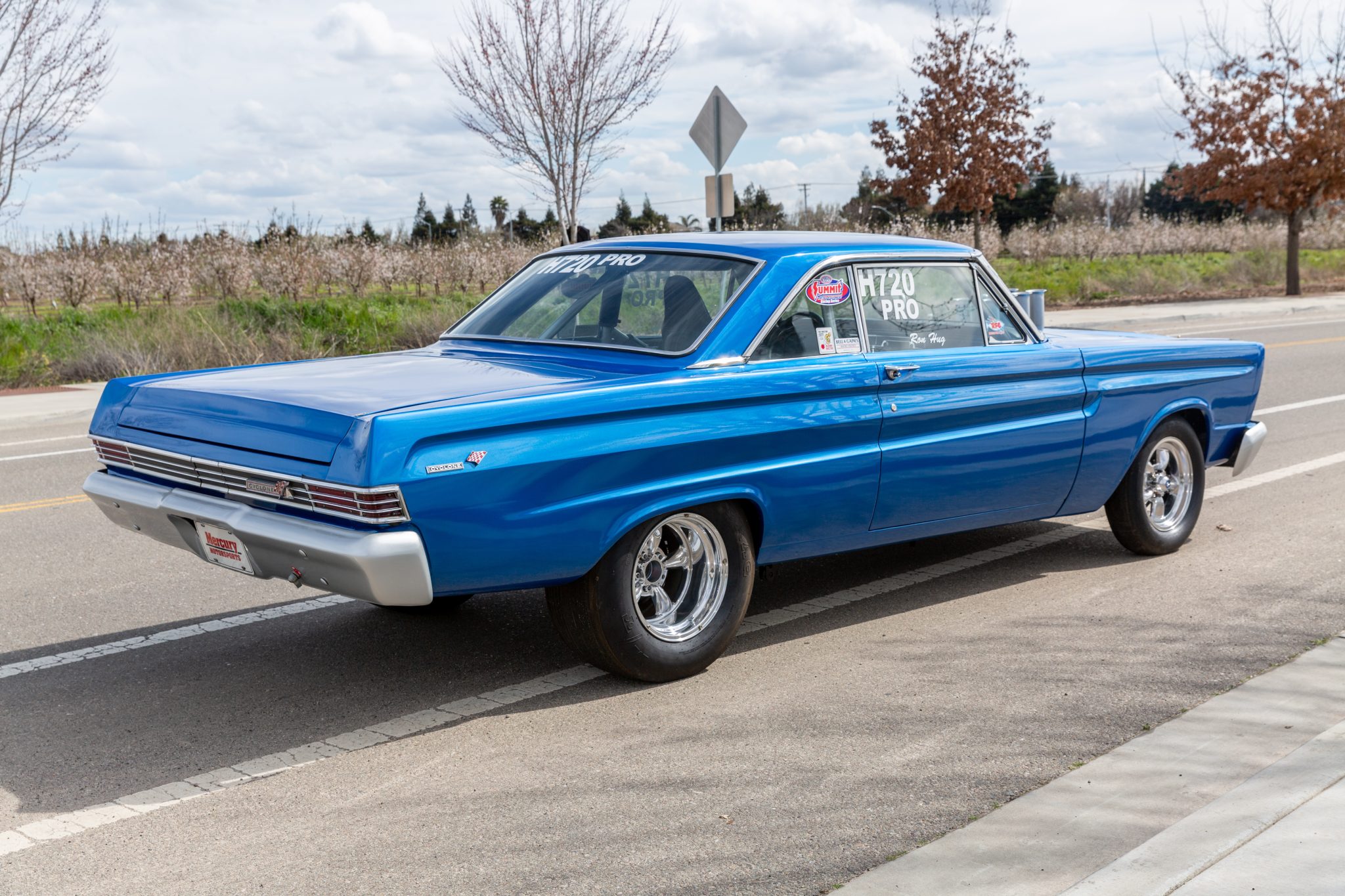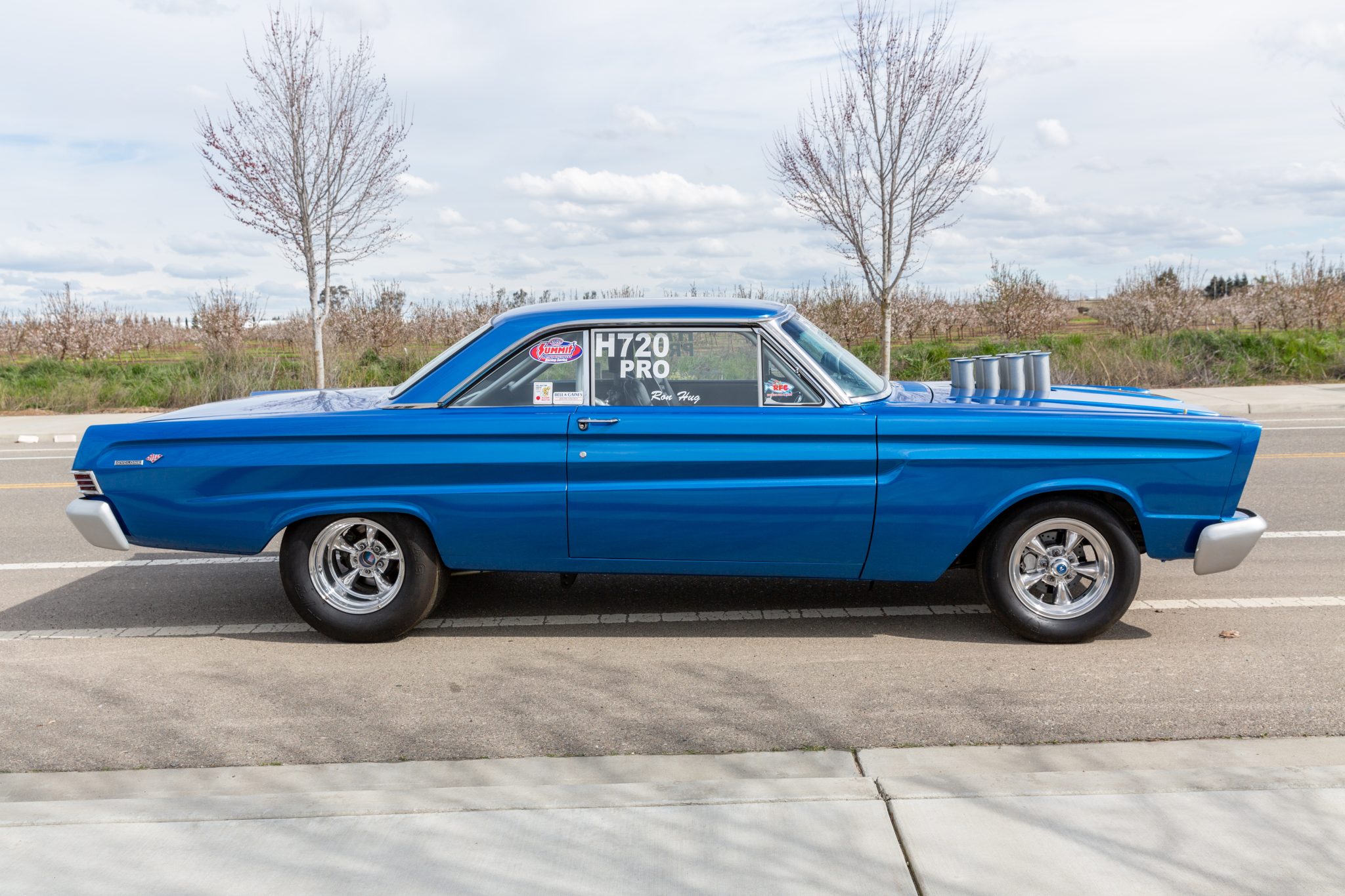 Staggered-width five-spoke 15″ polished aluminum wheels are wrapped in drag-racing tires measuring 25.0×4.5–15 at the front and 28.0/10.5–15 out back. The suspension is modified with a Mustang II–type front end with rack-and-pinion steering, a connected subframe, Koni adjustable coilovers, and a ladder-bar rear suspension. Braking is provided by four-wheel discs. A leak is noted in the left-front tire.