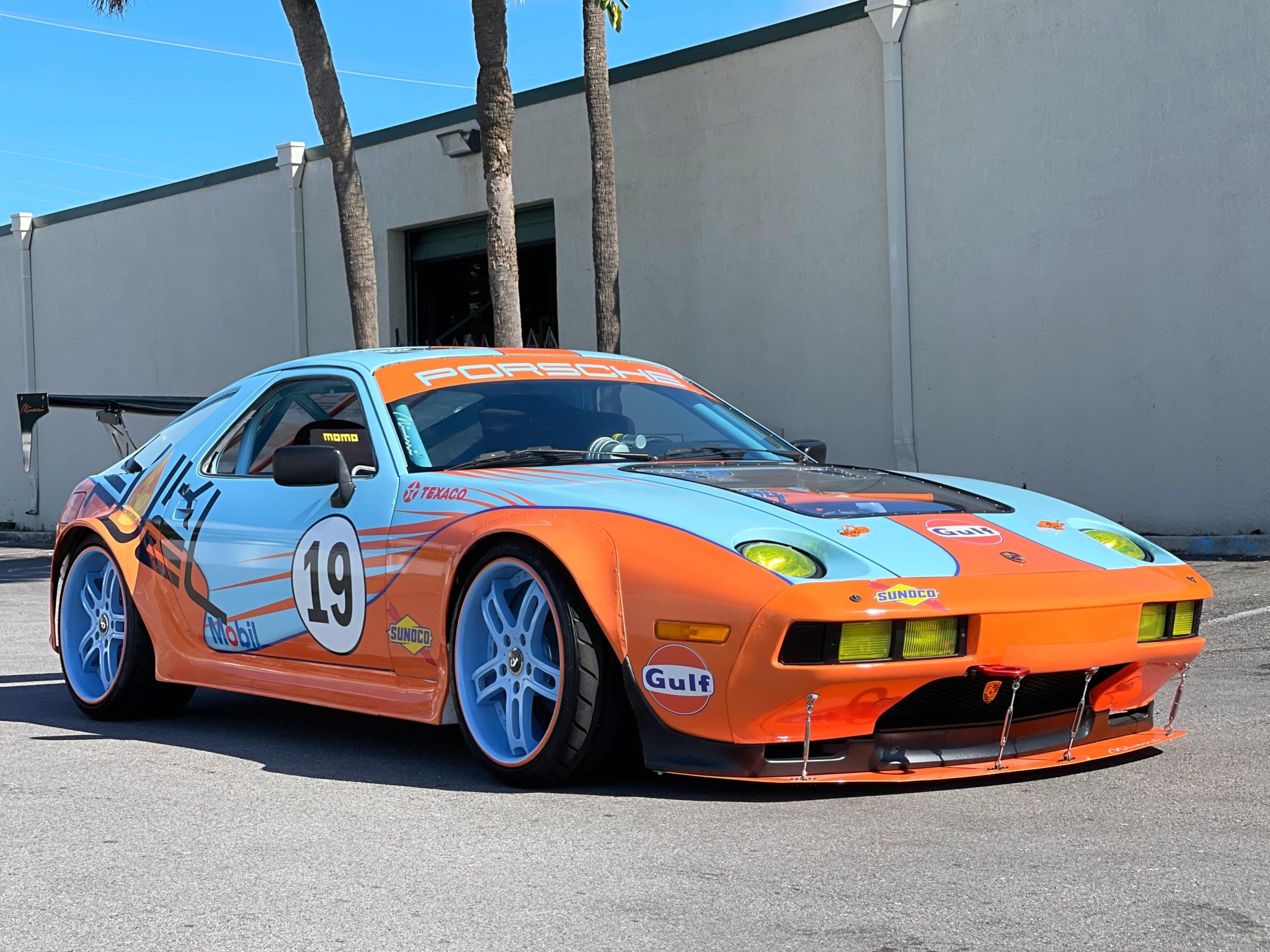 Blue 19″ Forgiato wheels are mounted with 235/35 front and 275/30 rear Nitto tires. The car is equipped with power-assisted rack-and-pinion steering, and stopping power is provided by red-finished calipers over vented disc brakes at each corner.