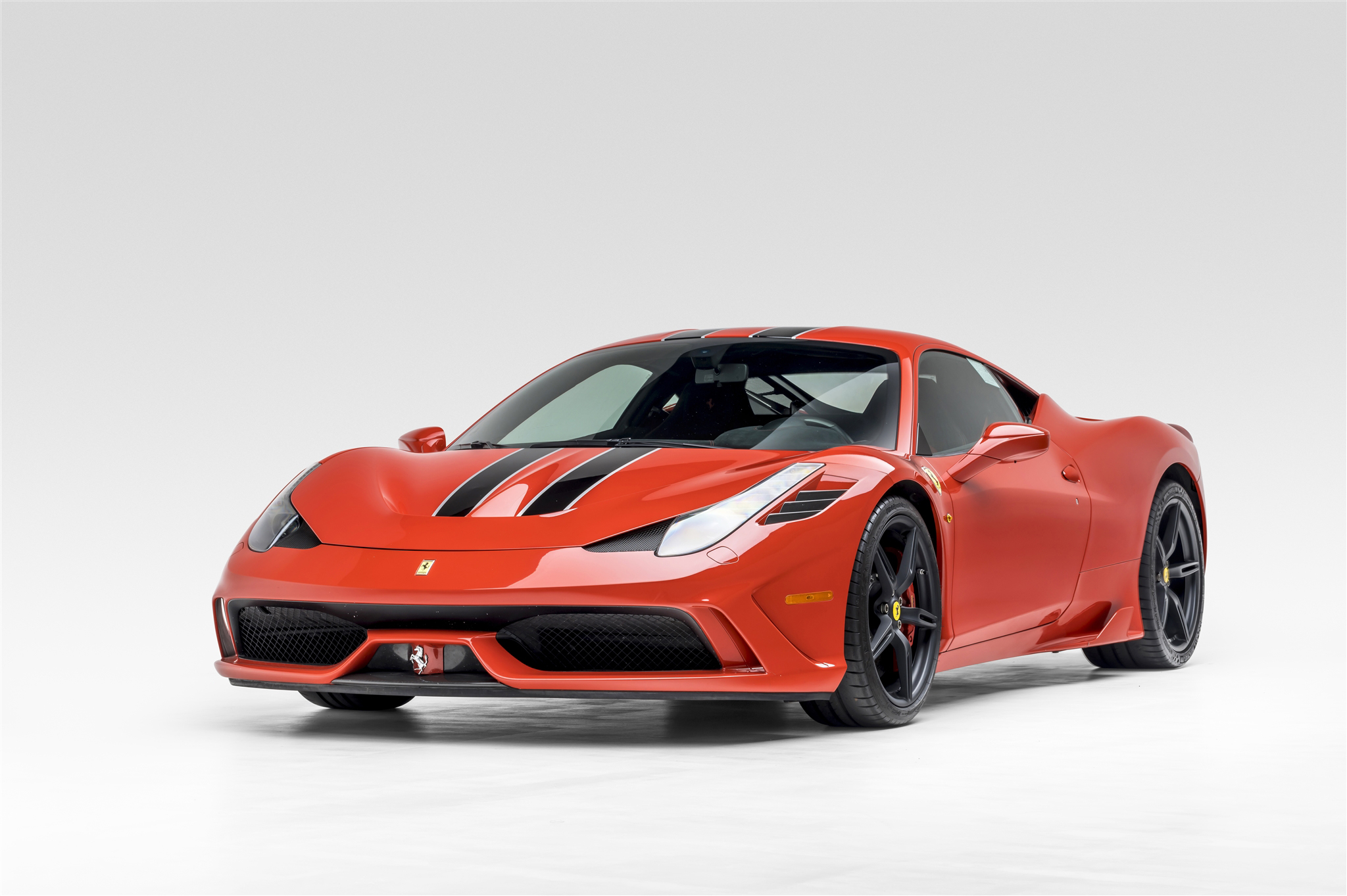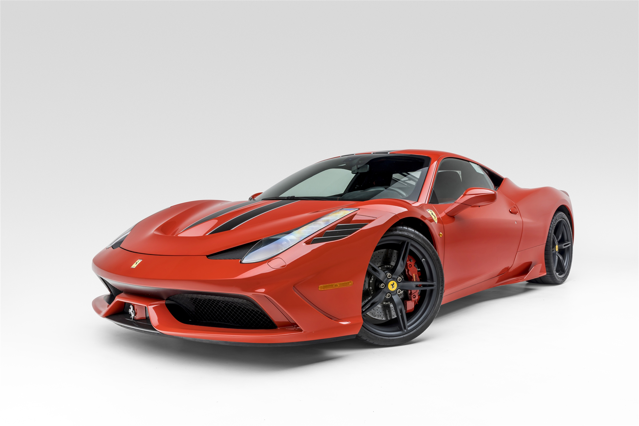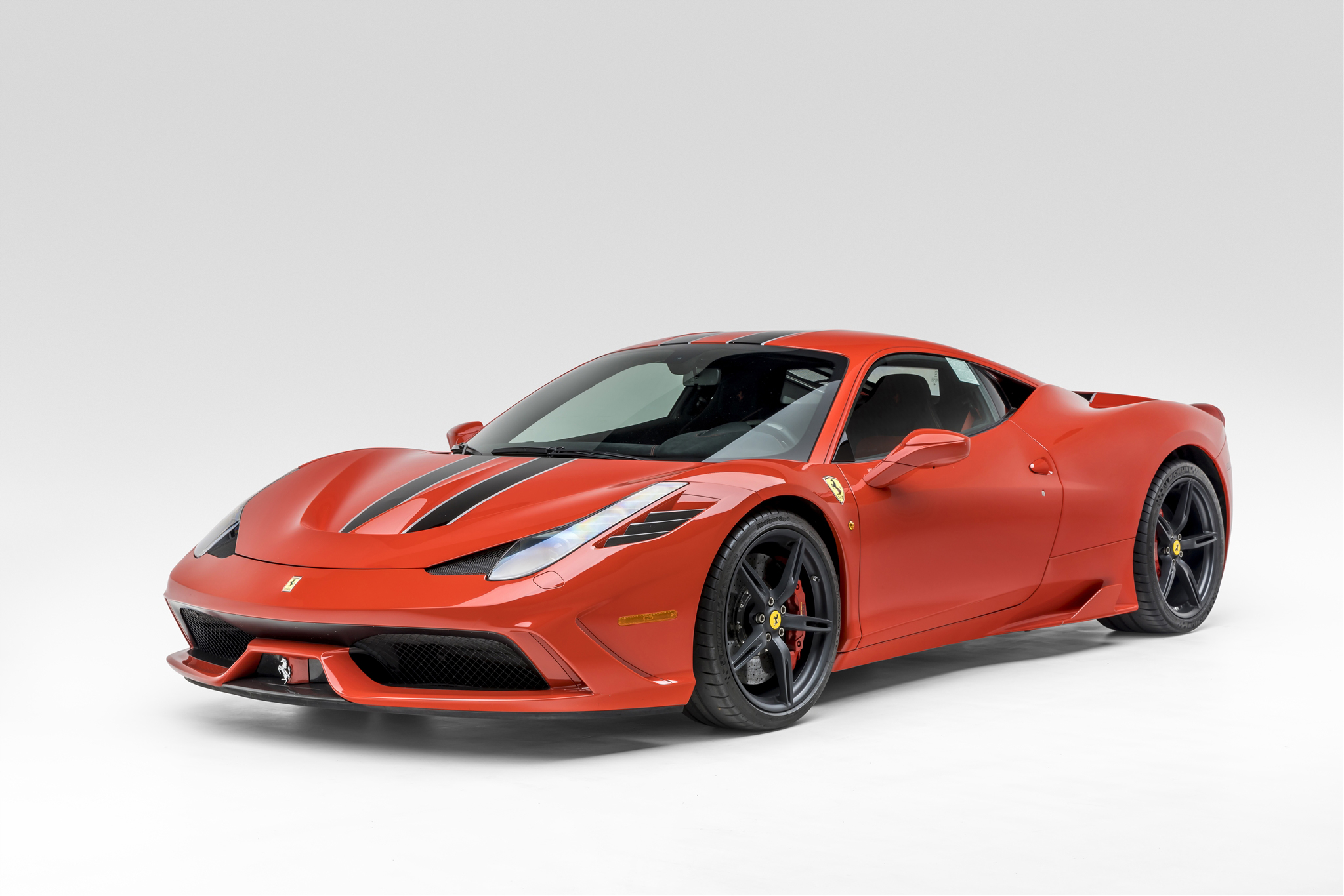 The 20″ five-spoke alloy wheels are mounted with staggered-width Michelin Pilot Sport Cup 2 tires. The car is equipped with magnetorheological dampers and a vehicle lift system, and braking is handled by red-finished Ferrari/Brembo calipers over cross-drilled carbon-ceramic rotors at all four corners. The Speciale received a retuned Side Slip Angle Control system compared with the 458 Italia as well as F1-Trac traction control.
