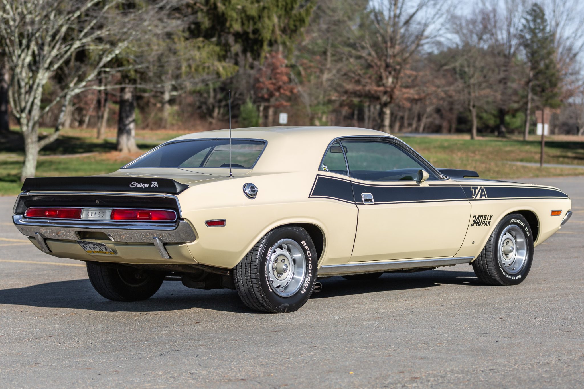 Silver 15″ Rallye wheels with polished trim rings are wrapped in 235/60 front and 255/60 rear BFGoodrich Radial T/A white-letter tires, and a space-saver spare is located in the trunk. Braking is from power-assisted front discs and rear drums.
