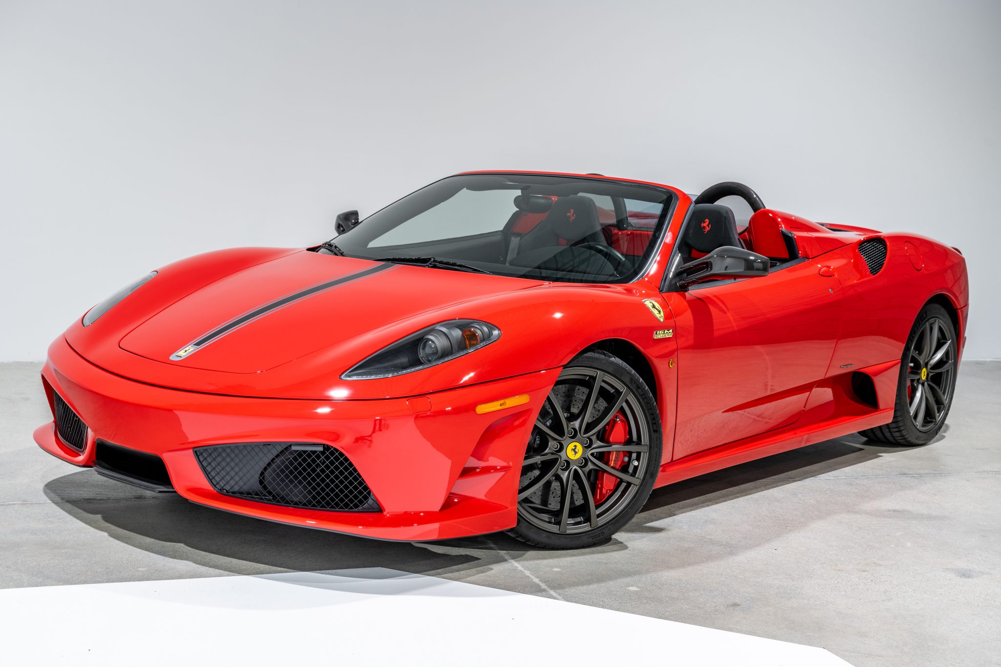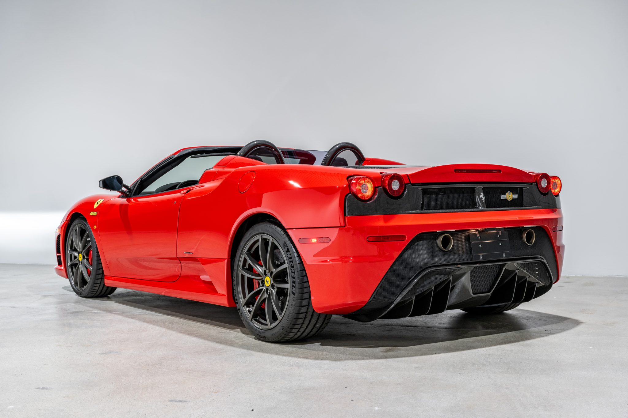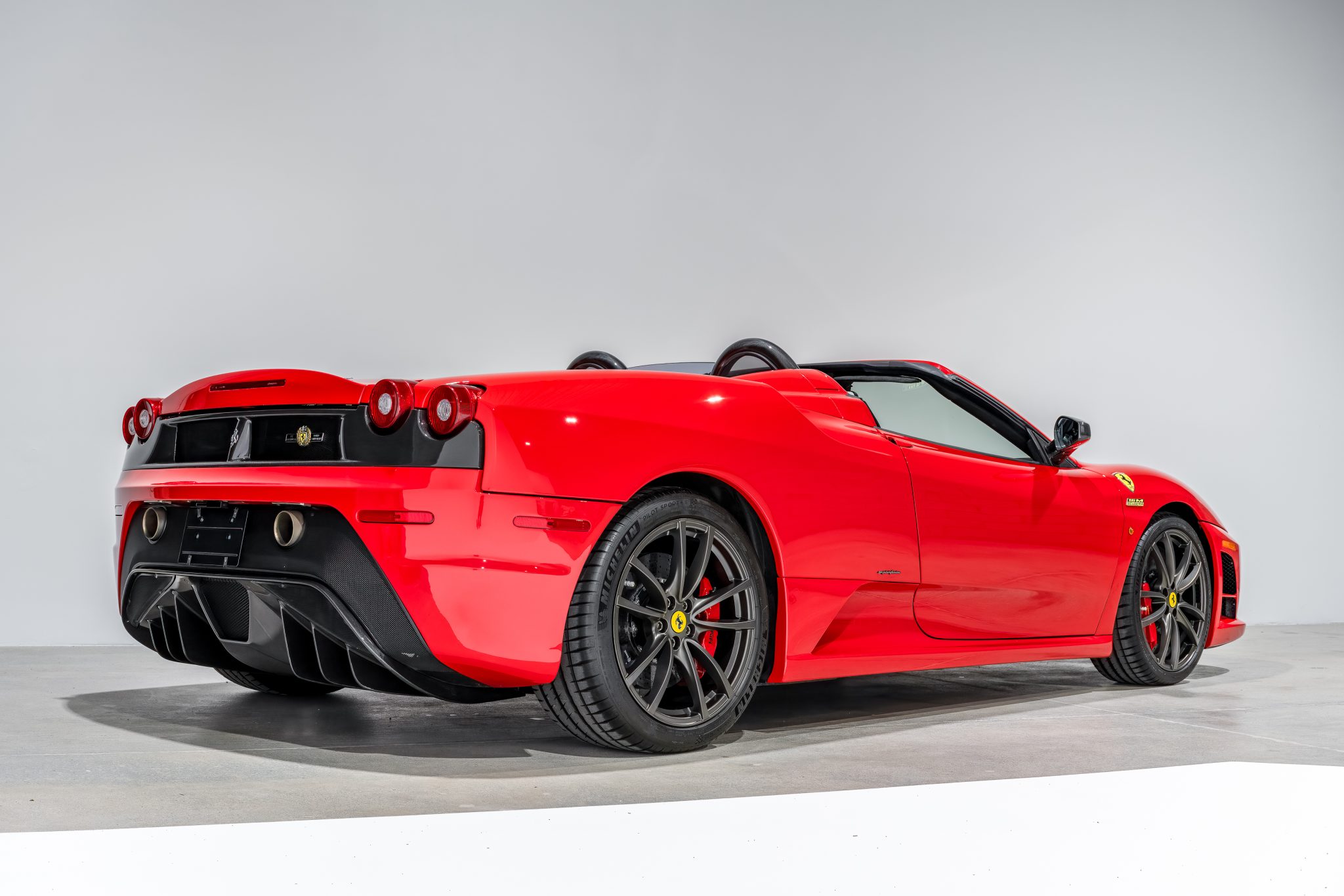 Gray-finished 19″ Scuderia alloy wheels are mounted with 235/35 front and 285/35 rear Michelin Pilot Sport tires that show date codes from 2021. The 16M features a stiffened chassis and a retuned suspension with ZF dampers and titanium springs. Braking is handled by red-finished brake calipers fitted over Brembo carbon-ceramic rotors.