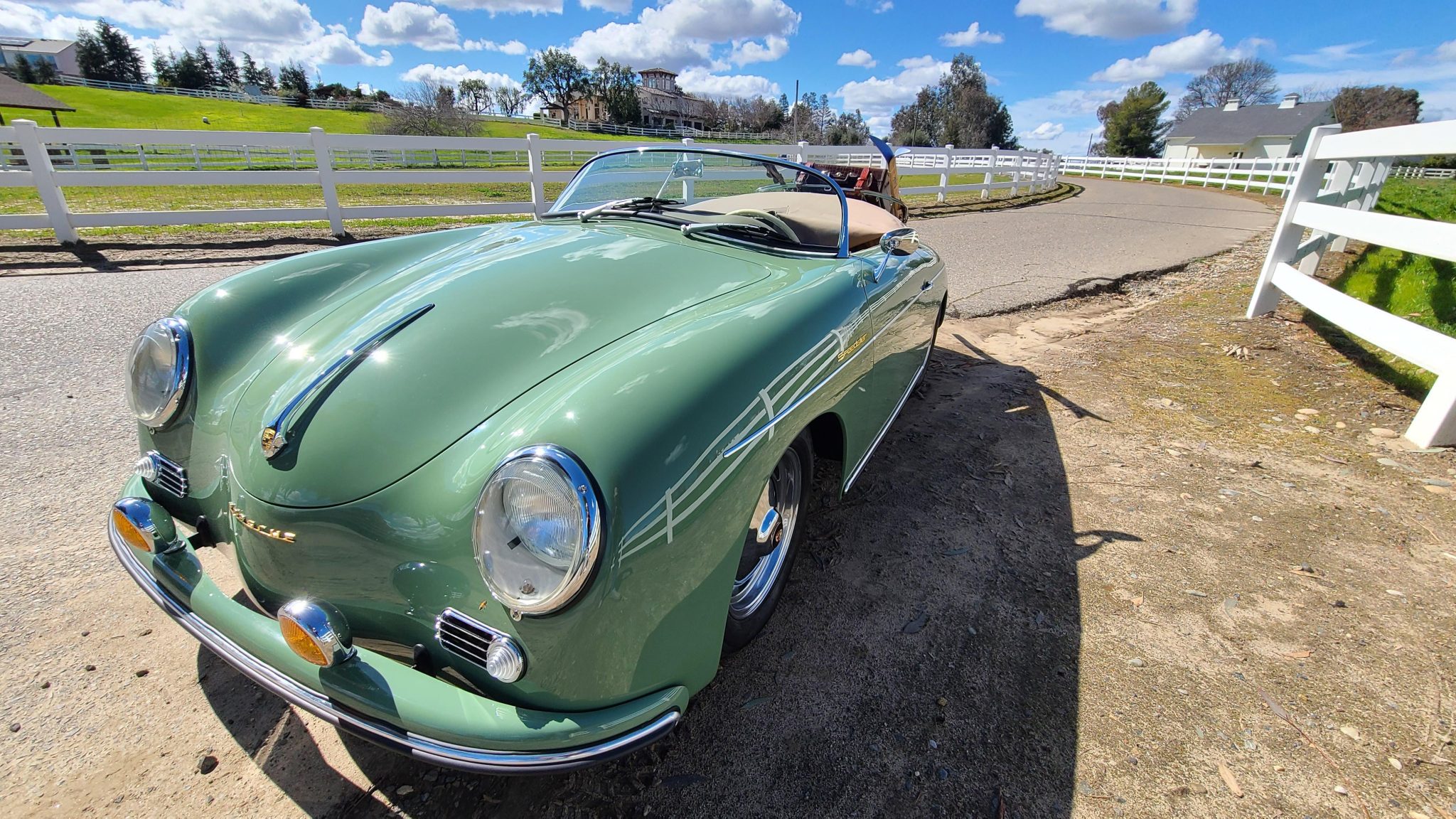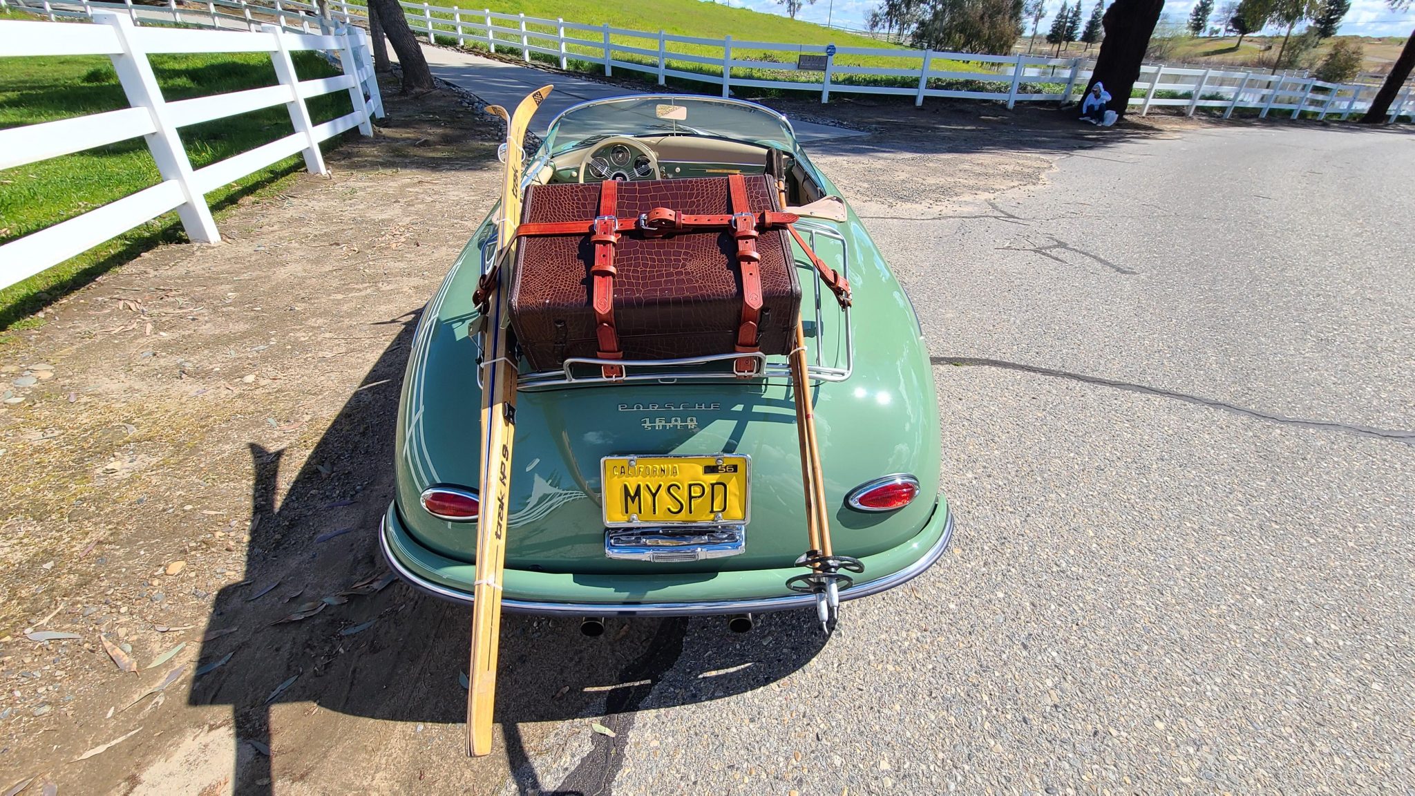 Polished 15” aluminum Vintage 190 wheels wear chrome hubcaps with Porsche crests and are mounted with 185/65 Pirelli P4 tires. Braking is through four-wheel discs, and the car features independent rear suspension.