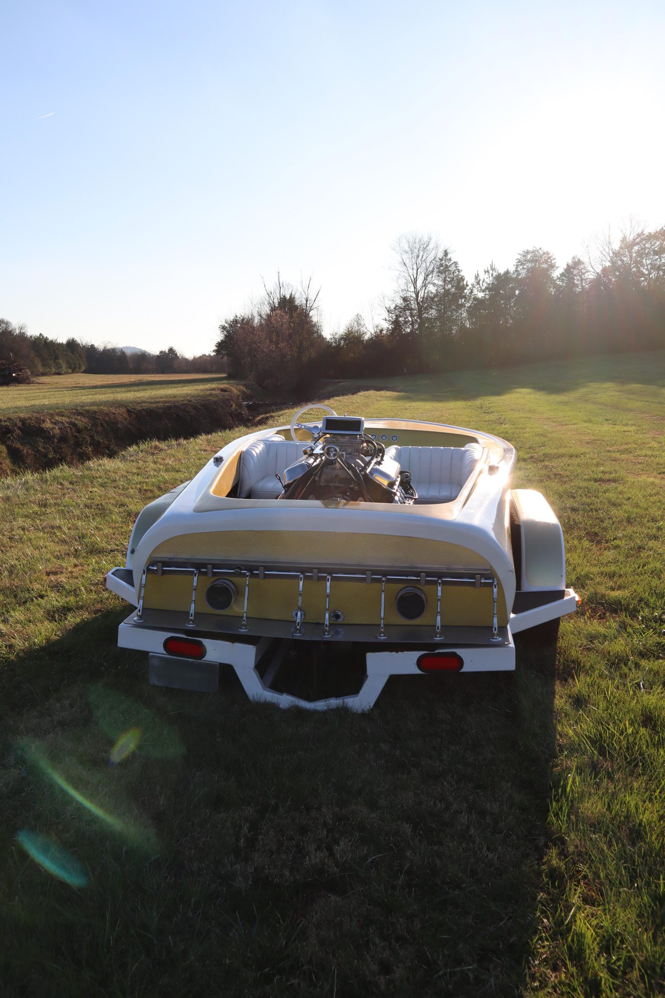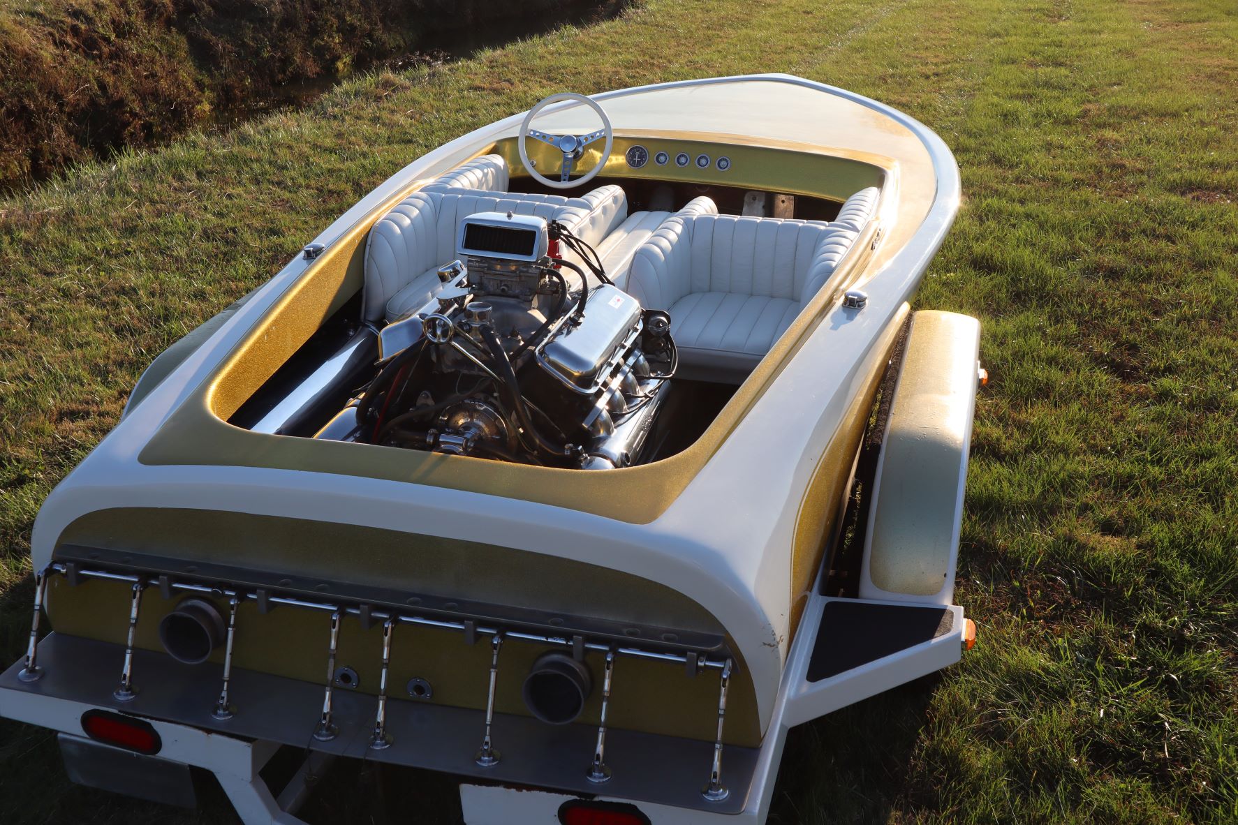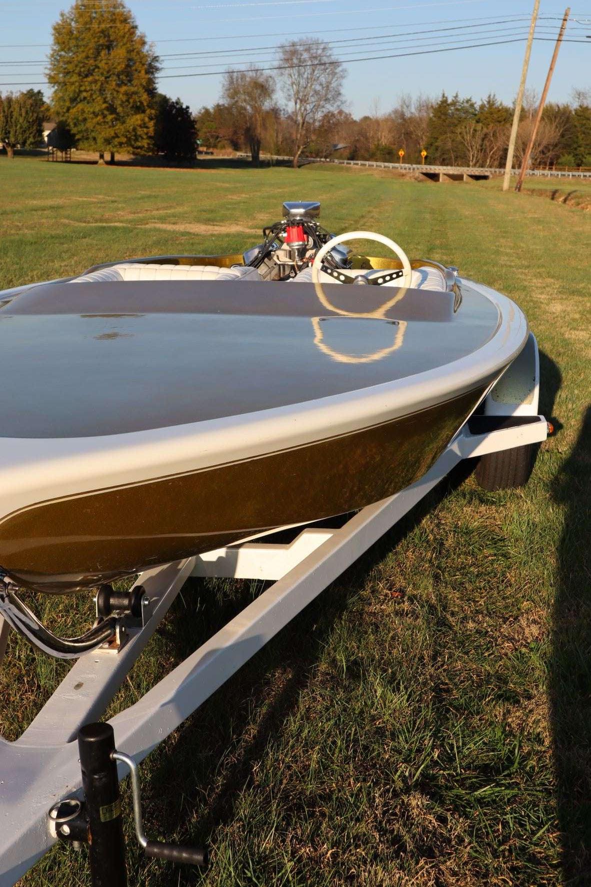 Features include adjustable MECO cavitation plates, dual skegs mounted under the hull, a waterski pylon positioned behind the engine, and gunwhale-mounted fuel filler caps. Rayson-Craft badges are riveted to each side of the cockpit.