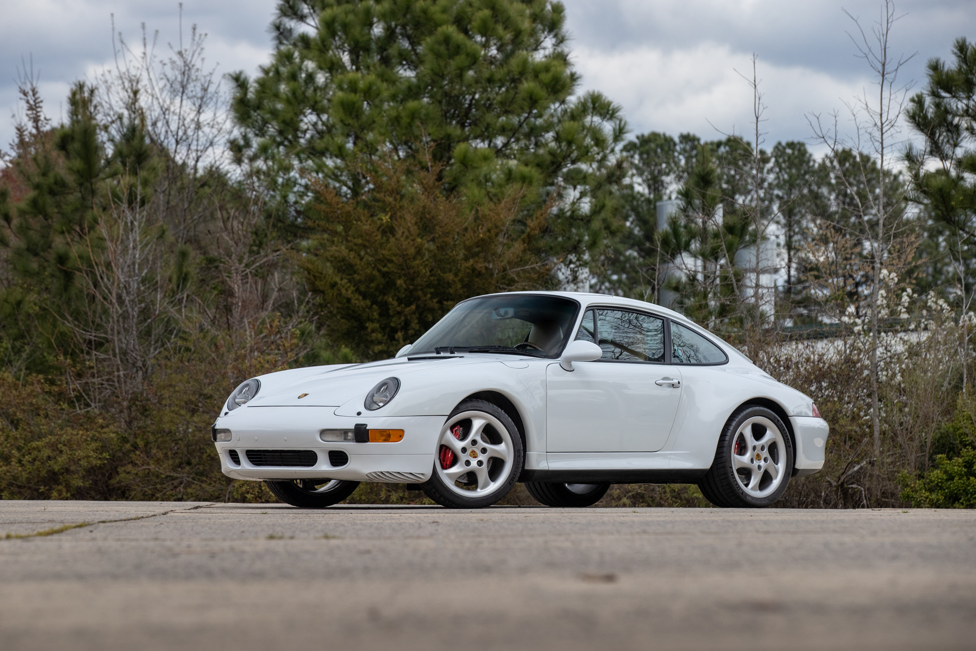 The 18″ Turbo Twist wheels are mounted with Michelin Pilot Sport 4S tires that were reportedly installed in July 2021. The car features an Automatic Brake Differential (ABD), and the 993 was the first 911 to feature multi-link rear suspension. Braking is handled by red-finished Porsche-branded calipers over cross-drilled rotors at all four corners.