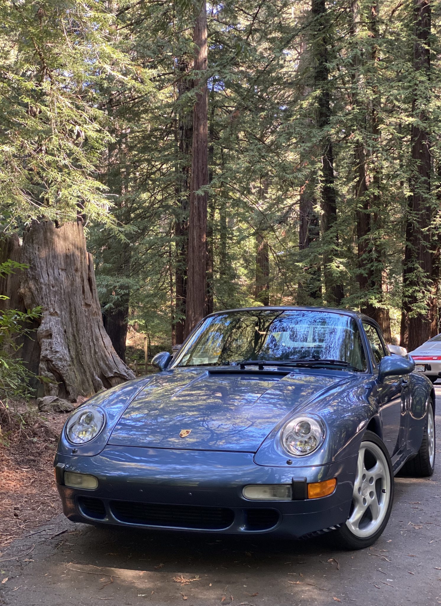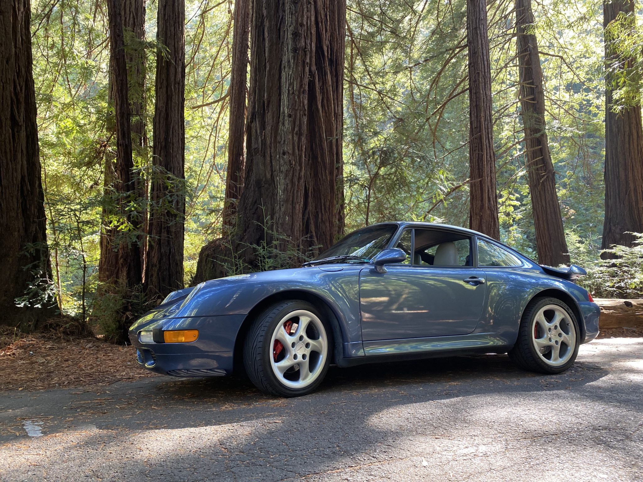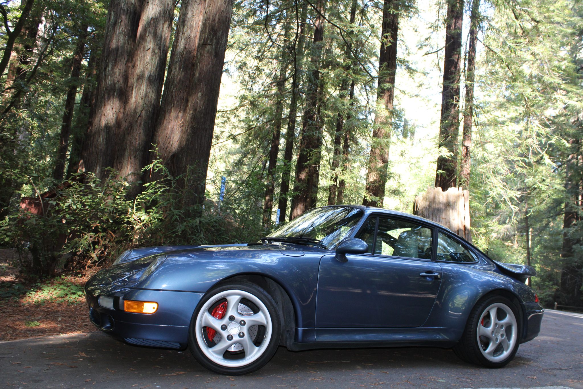 The 18″ hollow-spoke “Technology” wheels are mounted with a mixture of Toyo Proxes tires. The car features an Automatic Brake Differential (ABD), and the 993 was the first 911 to feature multi-link rear suspension. Braking is provided by red four-piston calipers over cross-drilled rotors.
