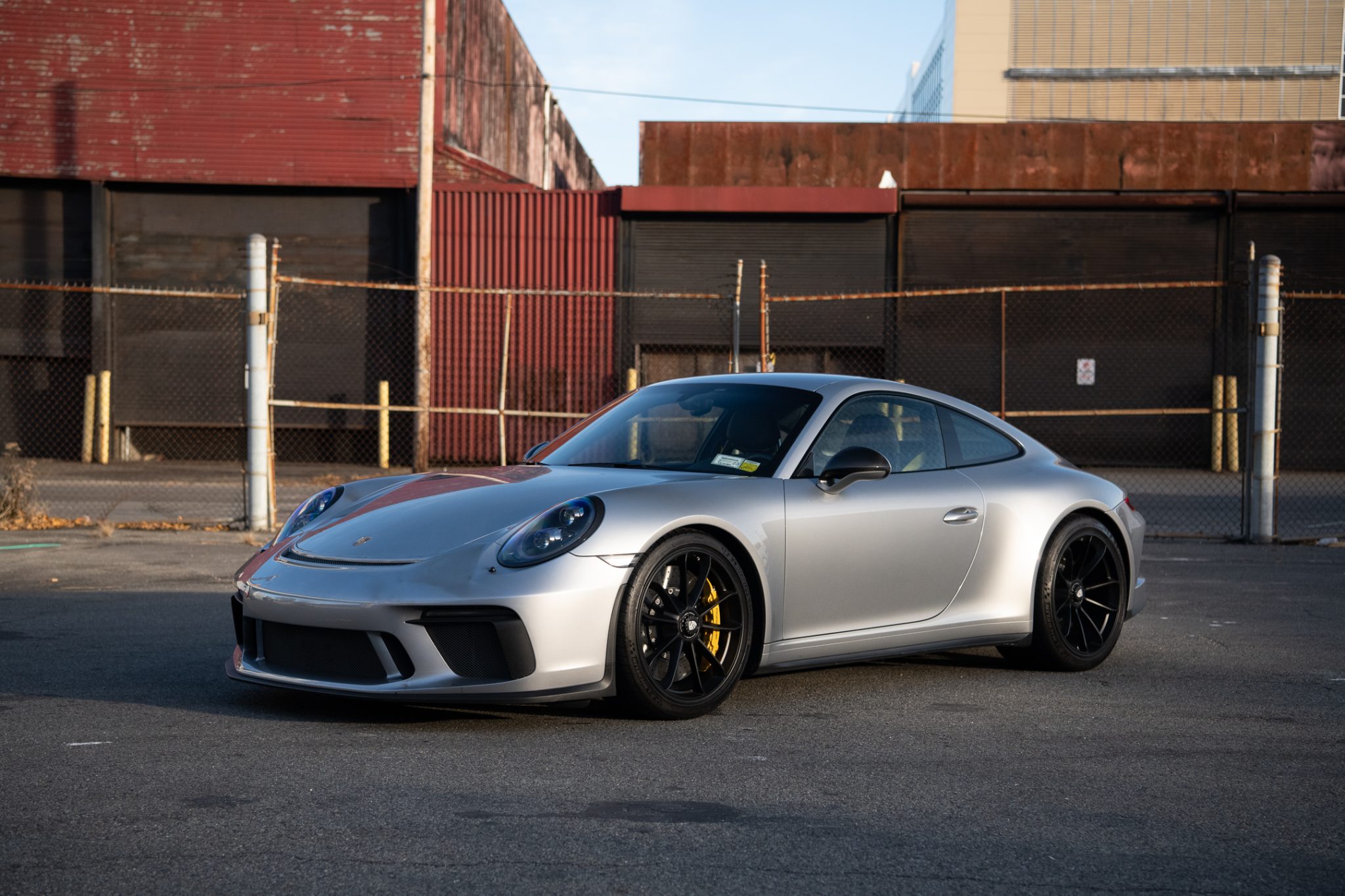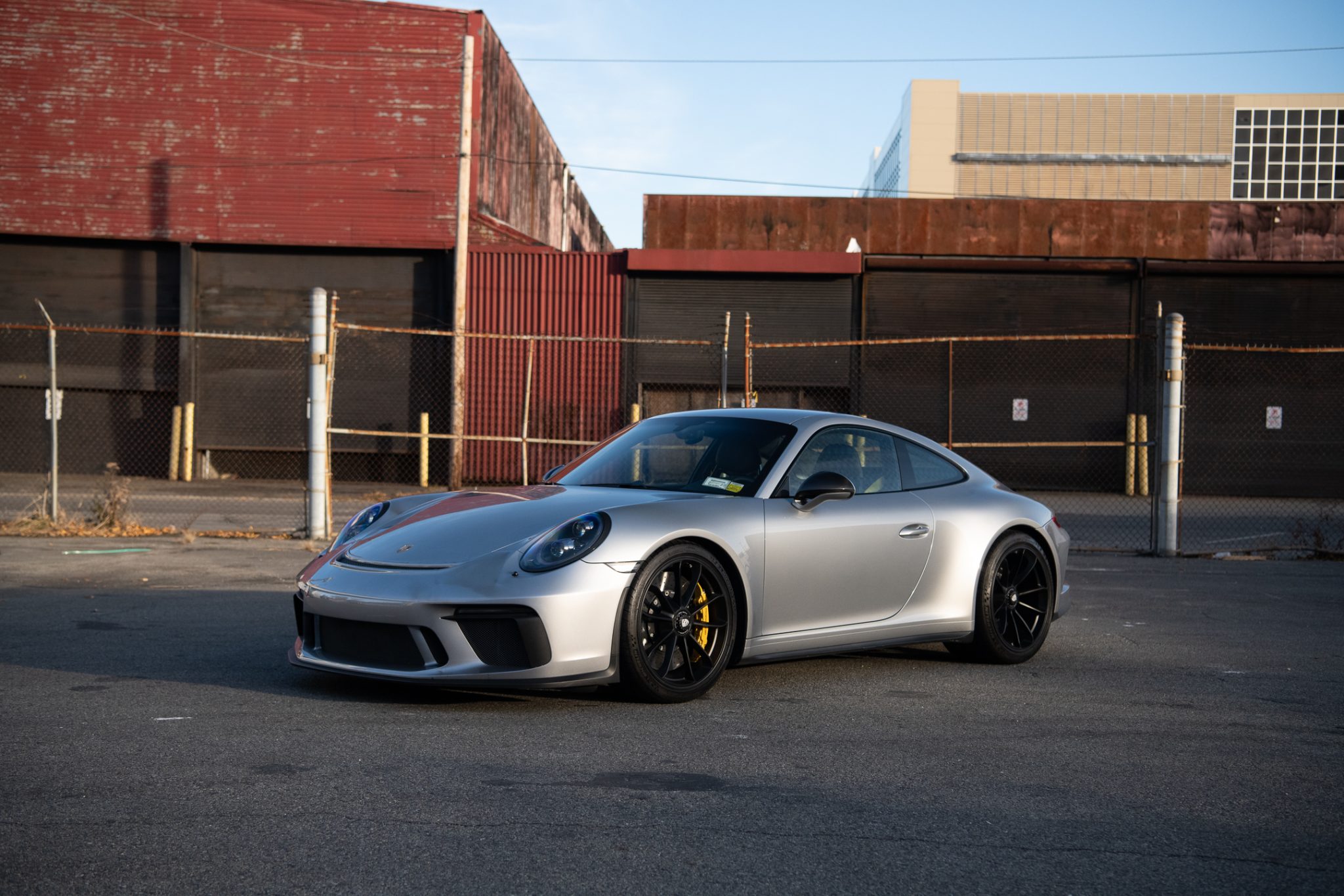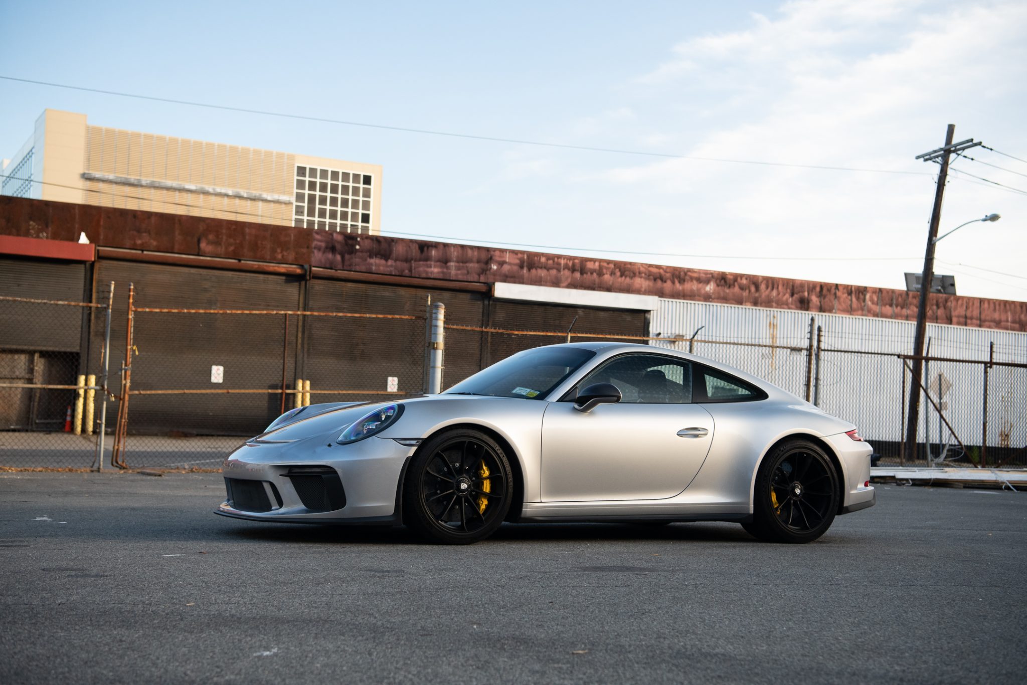Satin-black 20″ center-lock alloy wheels are mounted with 245/35 front and 305/30 rear Michelin Pilot Sport Cup 2 tires. Braking is handled by yellow Porsche-branded calipers over ceramic-composite rotors, and the car is equipped with a front-axle lift system. A brake fluid flush was performed in April 2022.