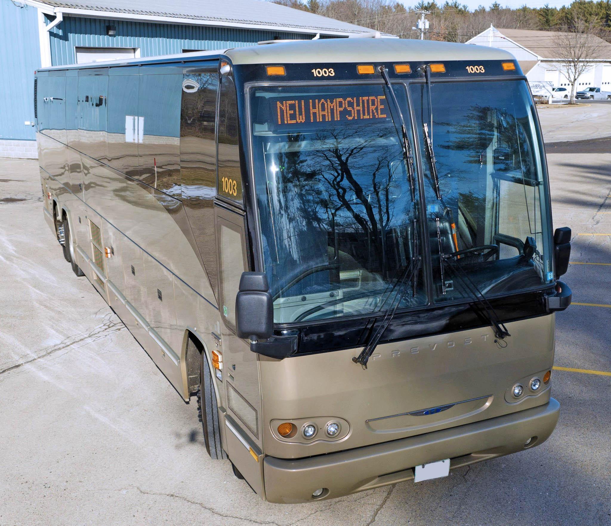 Polished 22.5″ wheels are wrapped in a mixed set of 315/80 Michelin tires. Stopping power is from air-actuated disc brakes, and the coach is equipped with a dually rear drive axle and a tag axle.