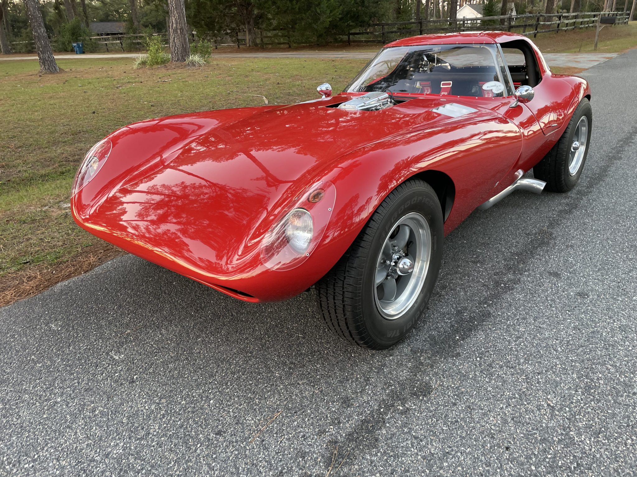 15″ American Racing wheels are wrapped in BFGoodrich Radial T/A tires sized 215/70. The car is equipped with rack-and-pinion steering, four-wheel disc brakes, and adjustable coilovers front and rear.