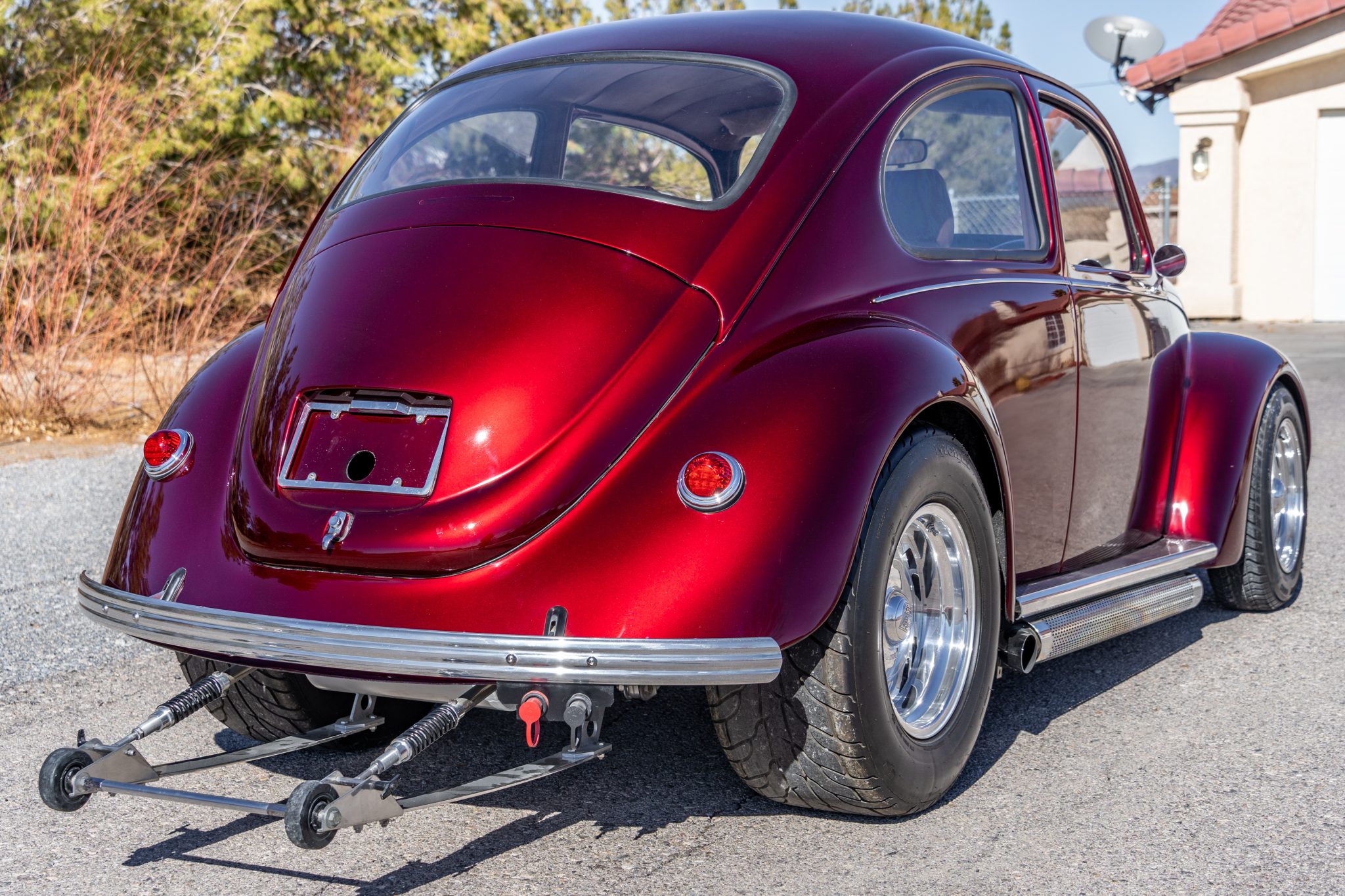 Polished 15” Center Line wheels are mounted with 165-width Metric Radial tires up front and Mickey Thompson Sportsman S/R 28×12.00″ rubber out back. Braking is through discs at all four corners. The car rides on height-adjustable air suspension and has been fitted with Mustang II-spec rack-and-pinion steering.