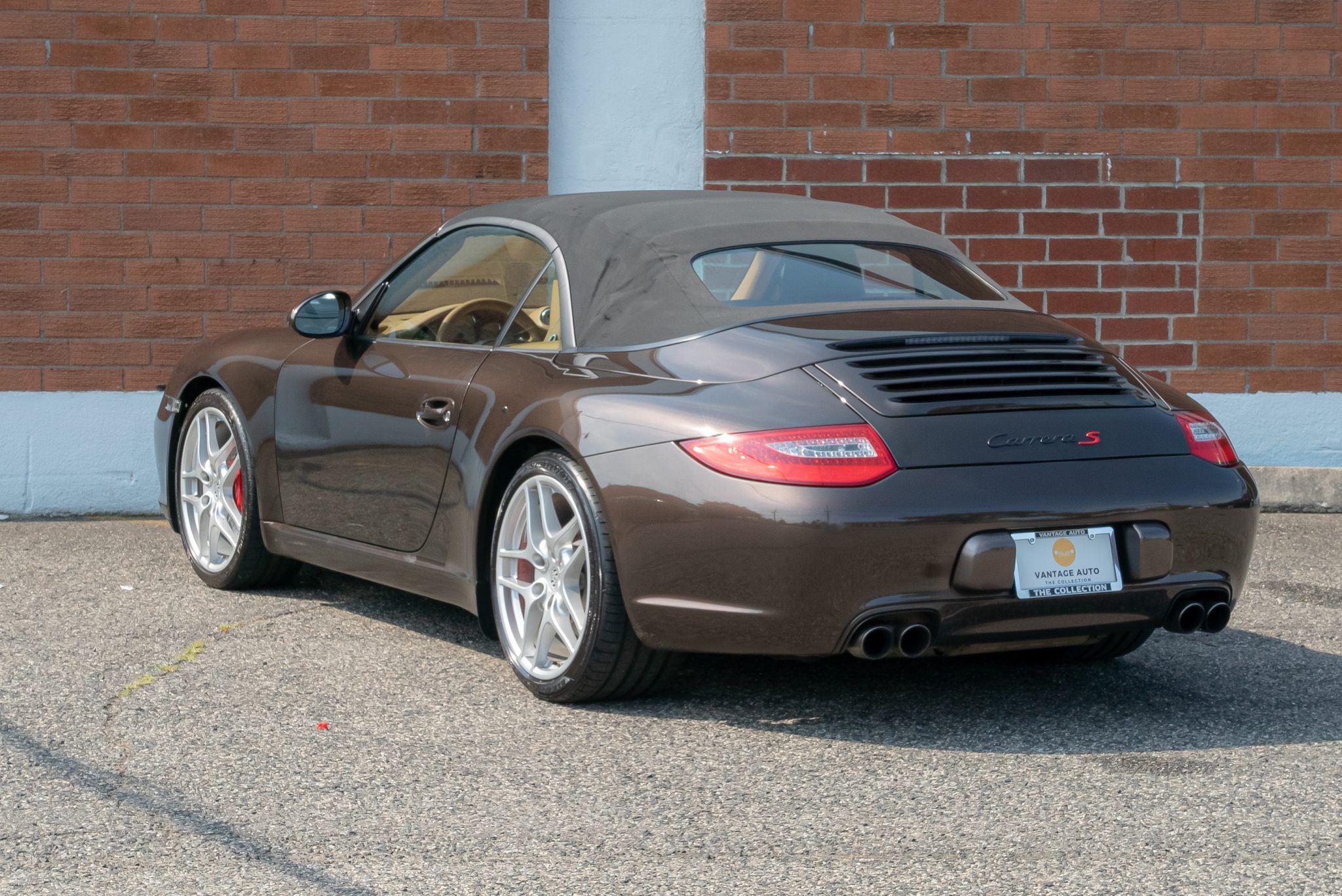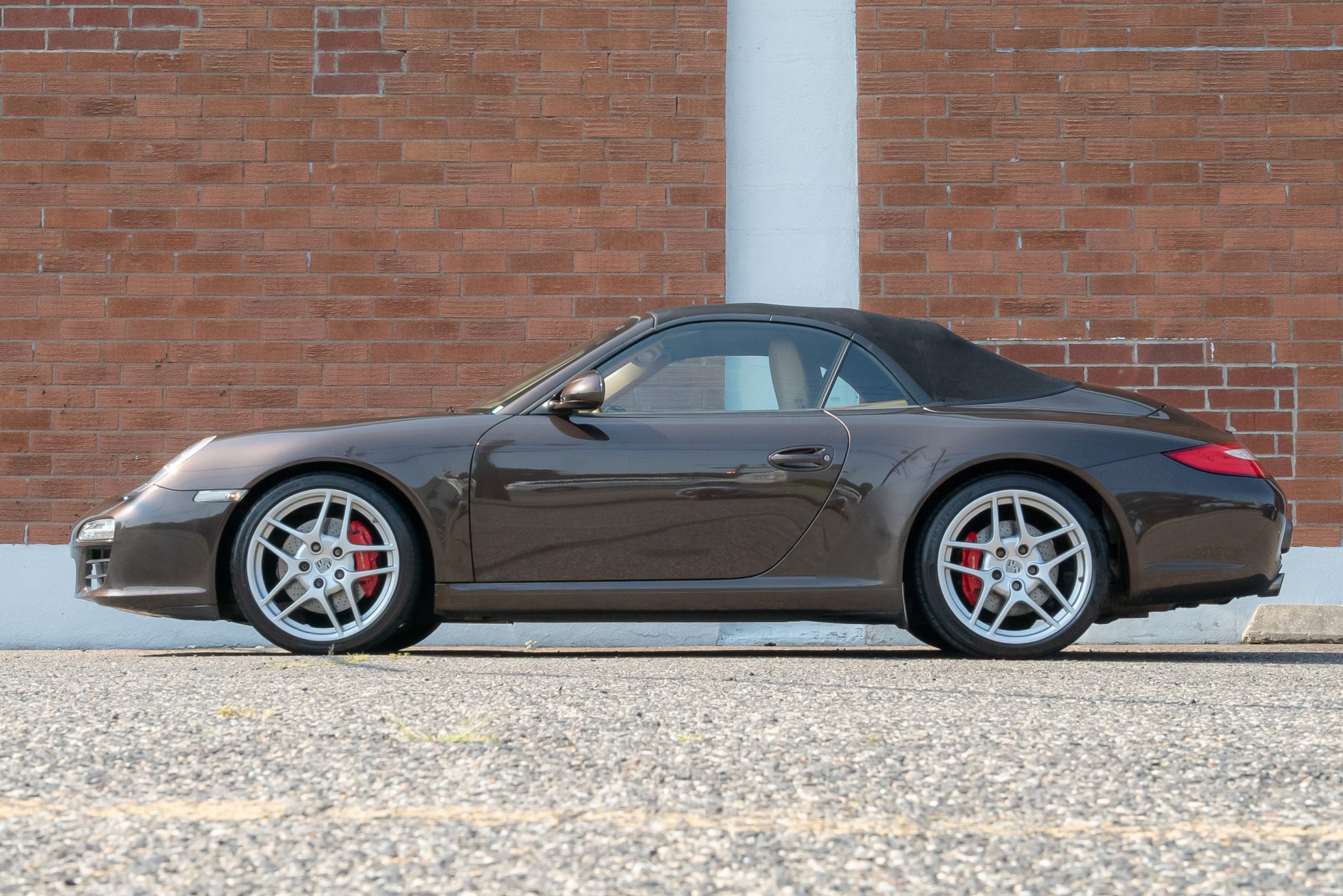 The 19” Carrera S II wheels are mounted with Michelin front and Sumitomo rear tires. Braking is handled by red Porsche-branded multi-piston brake calipers fitted over cross-drilled and vented rotors at all four corners. The car is equipped with Porsche Stability Management (PSM), an active brake differential (ABD), and Anti Slip Regulation (ASR).