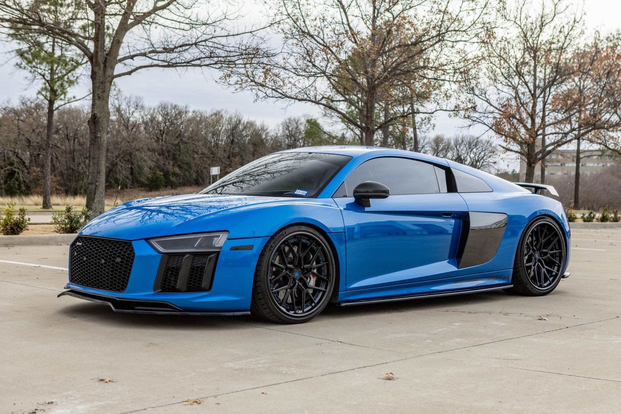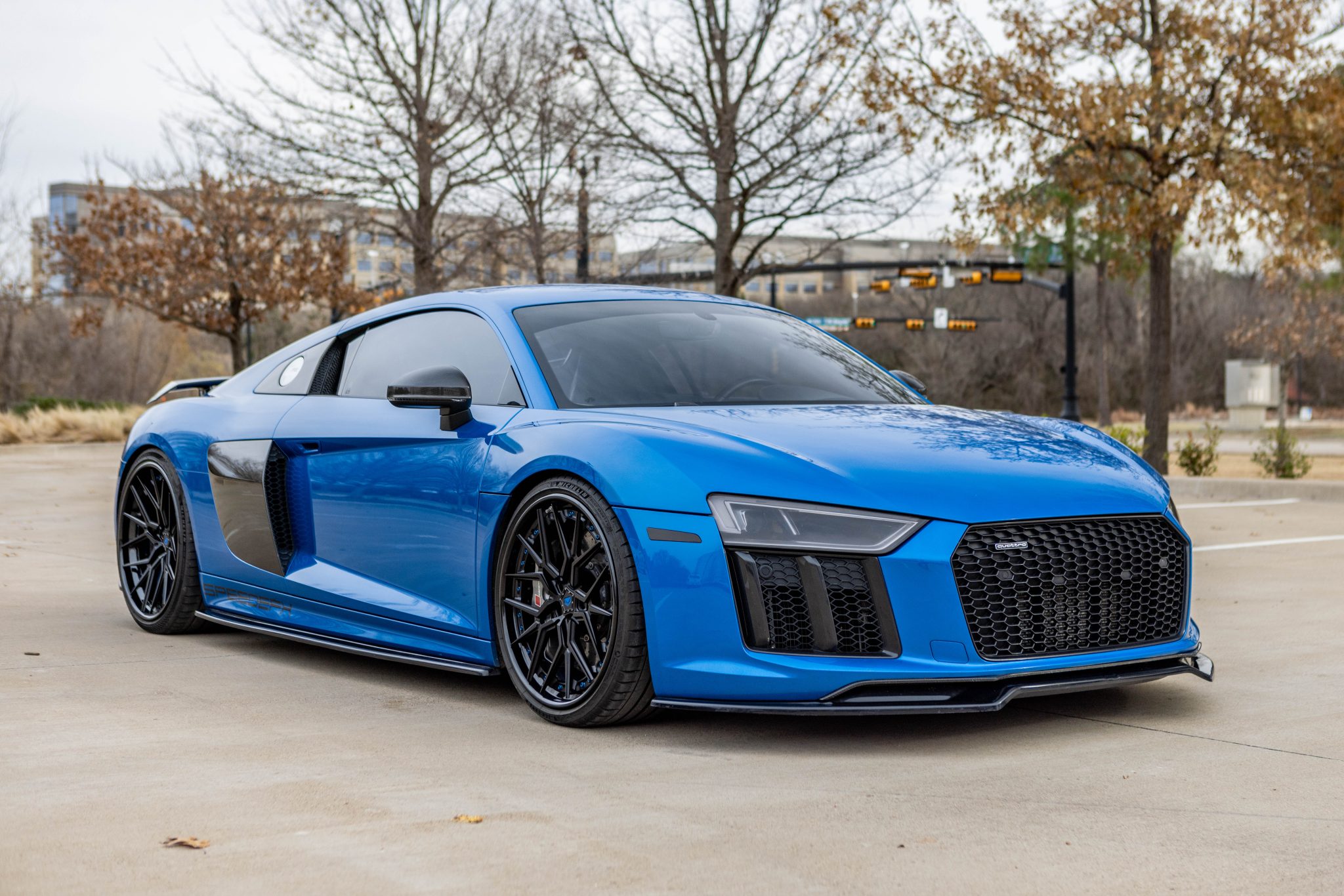 Vossen 20″ and 21″ three-piece wheels are finished in black with blue barrels and hardware. Michelin Pilot Sport 4 S tires are fitted and measure 245/30 up front and 325/25 out back. Braking is handled by cross-drilled carbon-ceramic rotors with gray-finished calipers at all four corners. The seller notes that Ohlins suspension components were fitted under previous ownership.