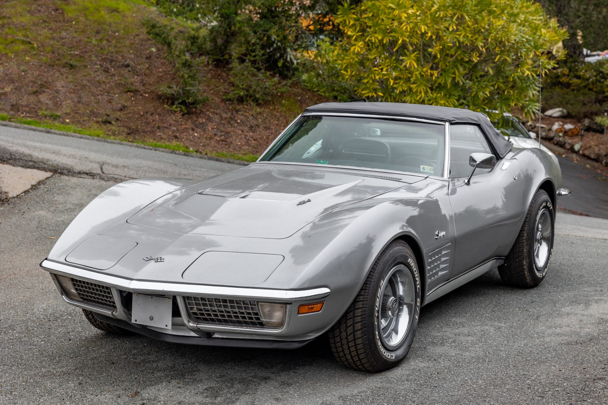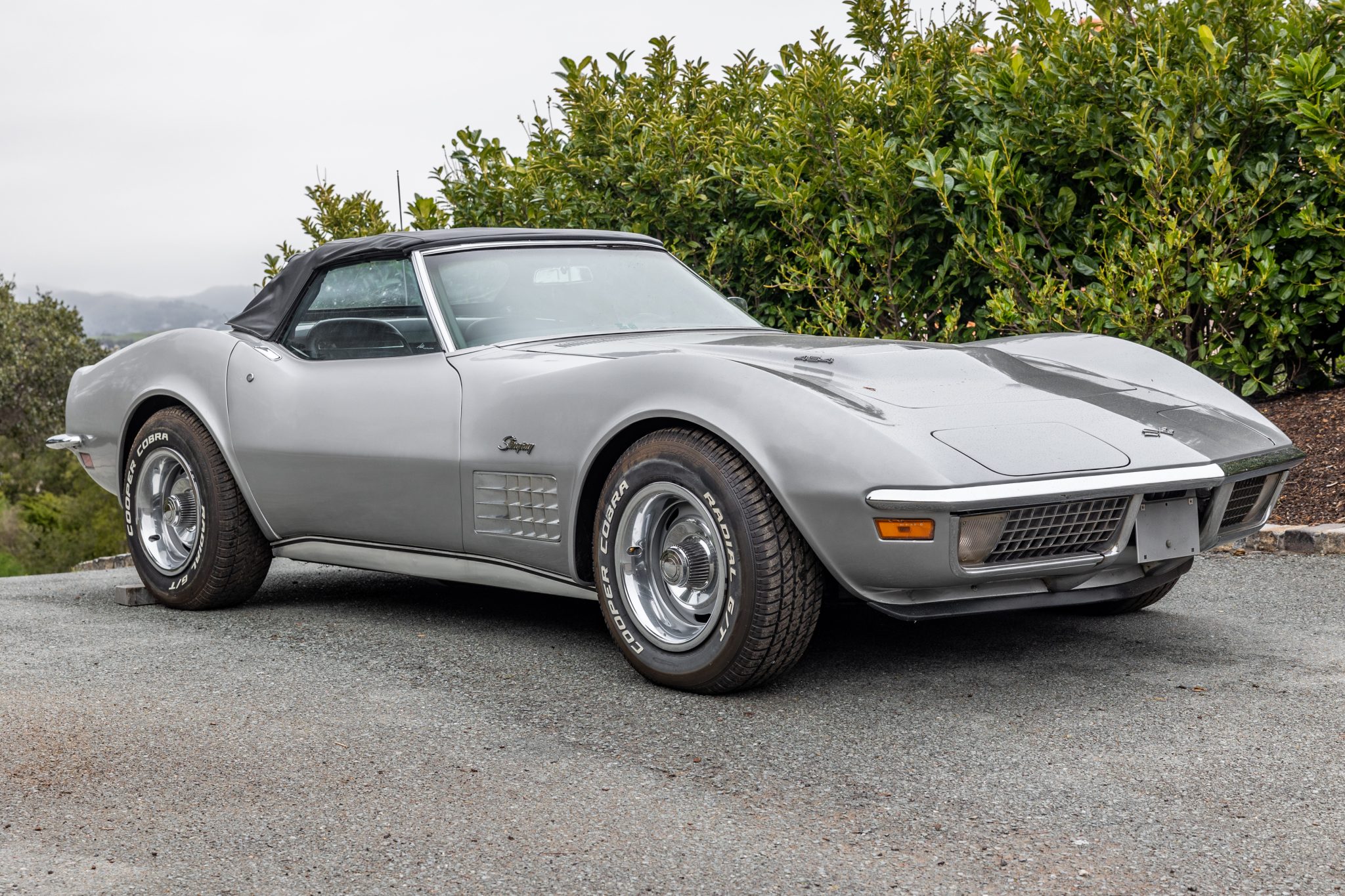 The 15″ Rally wheels wear bright center caps and trim rings and are mounted with 225/70 Cooper Cobra Radial G/T tires showing 2020 production date codes. The car is equipped with power steering, and braking is provided by power-assisted discs at all four corners. The brake master cylinder and calipers are said to have been replaced in 2021. The seller notes that the parking brake functions but requires an adjustment to catch at lower handbrake settings.