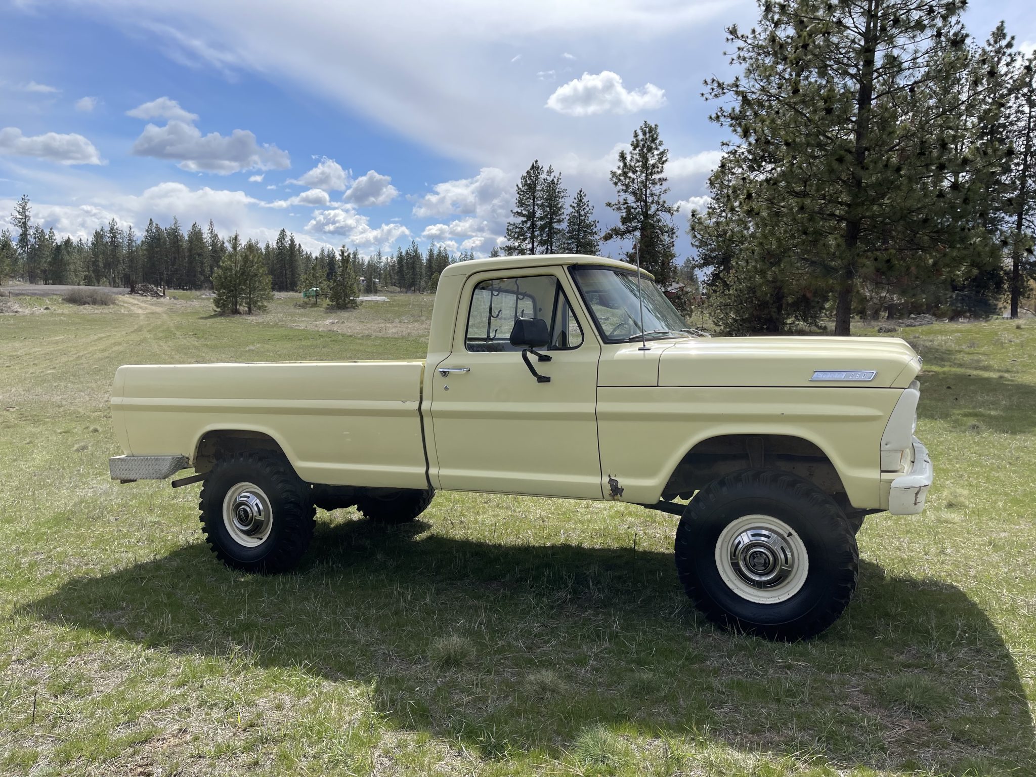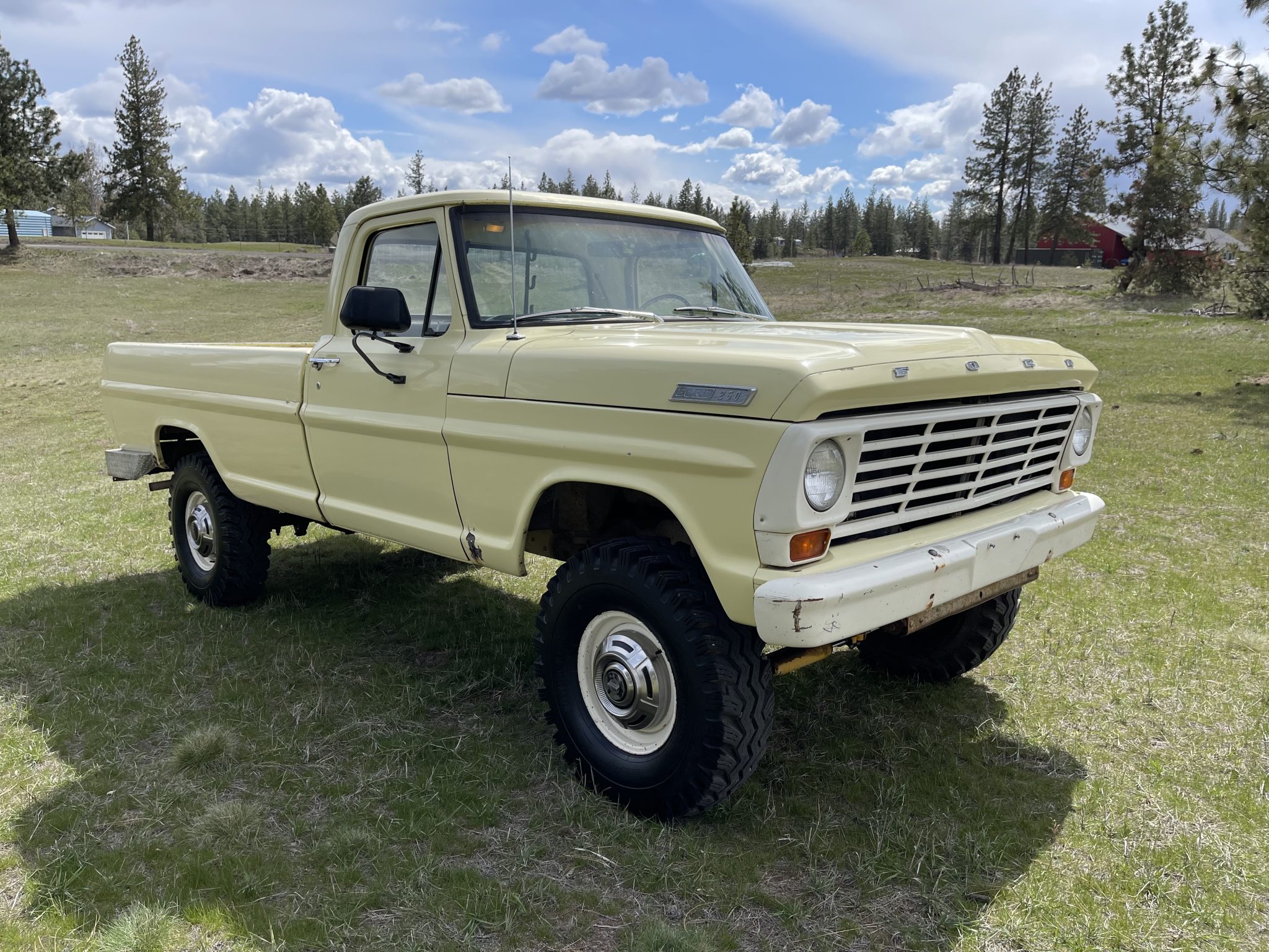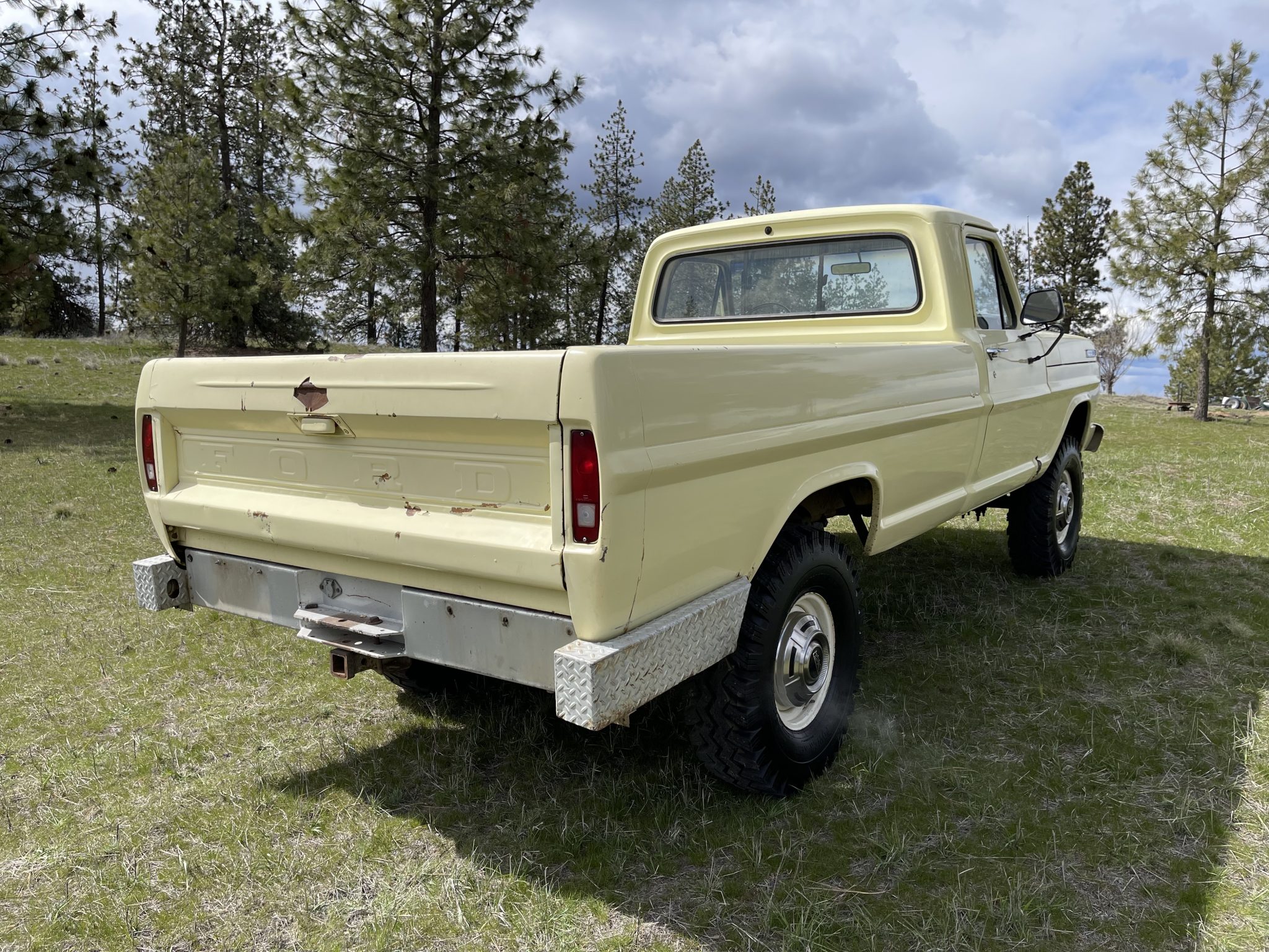 White-finished 16″ steel wheels wear polished covers and 9.00-16″ Power King Super Traction LT II tires mounted during current ownership. The truck has manually locking front hubs and rides on a lifted suspension, and the seller states the steering stabilizers and shocks were recently replaced. Stopping power is provided by four-wheel drum brakes.