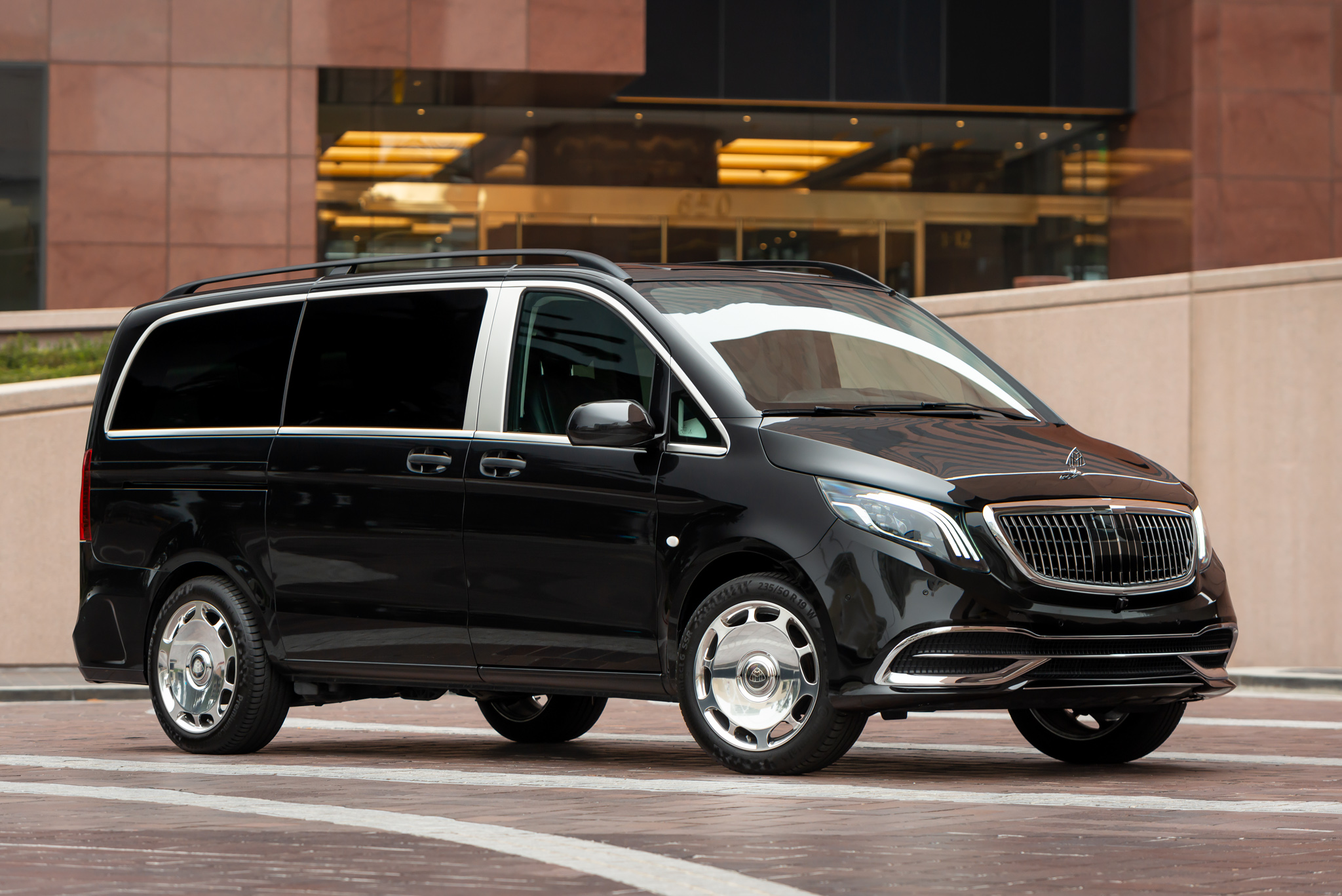 Maybach-branded 19″ polished wheels are wrapped in 235/50 Continental PremiumContact 6 SSR tires. Stopping power is provided by four-wheel disc brakes.