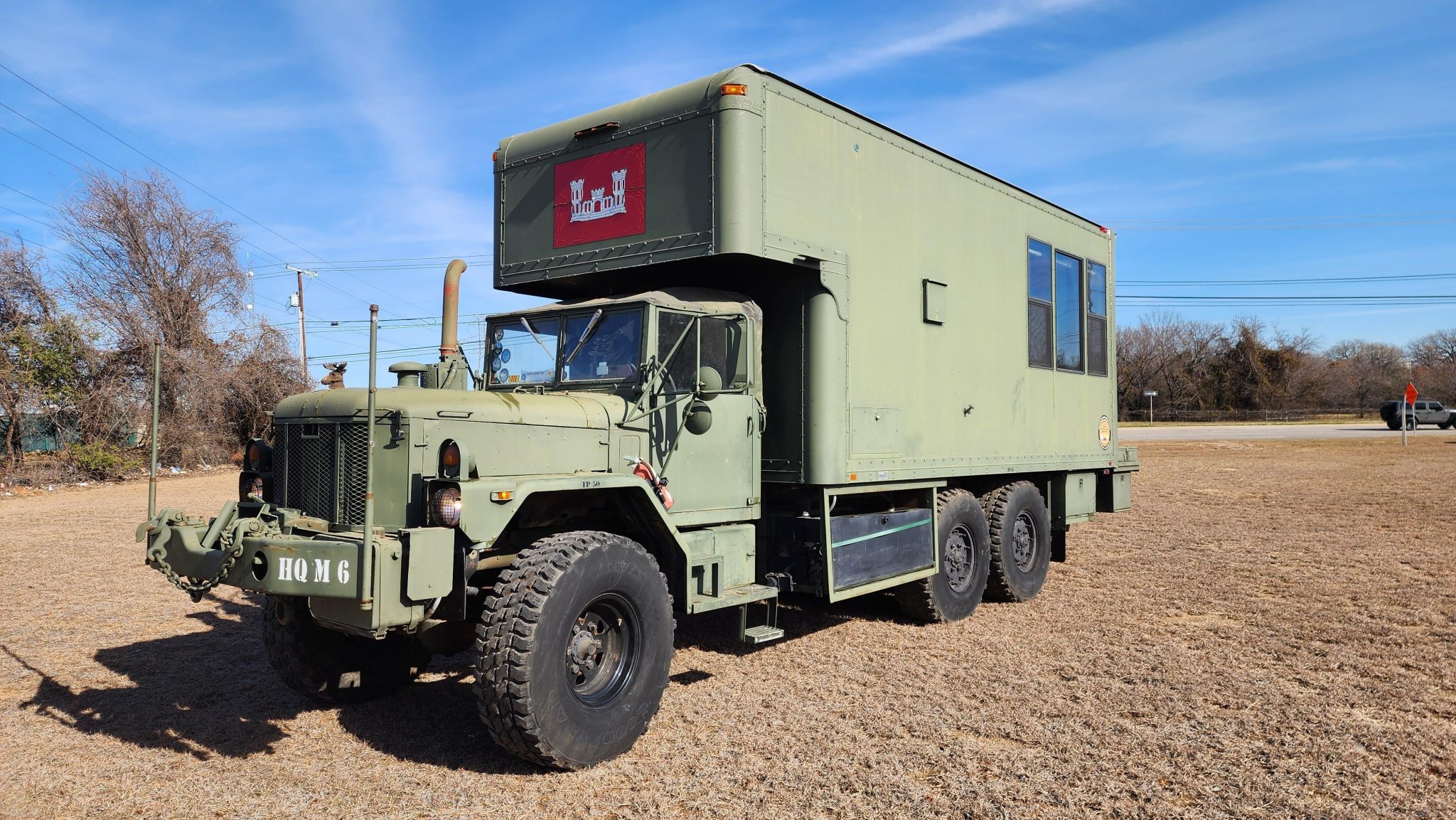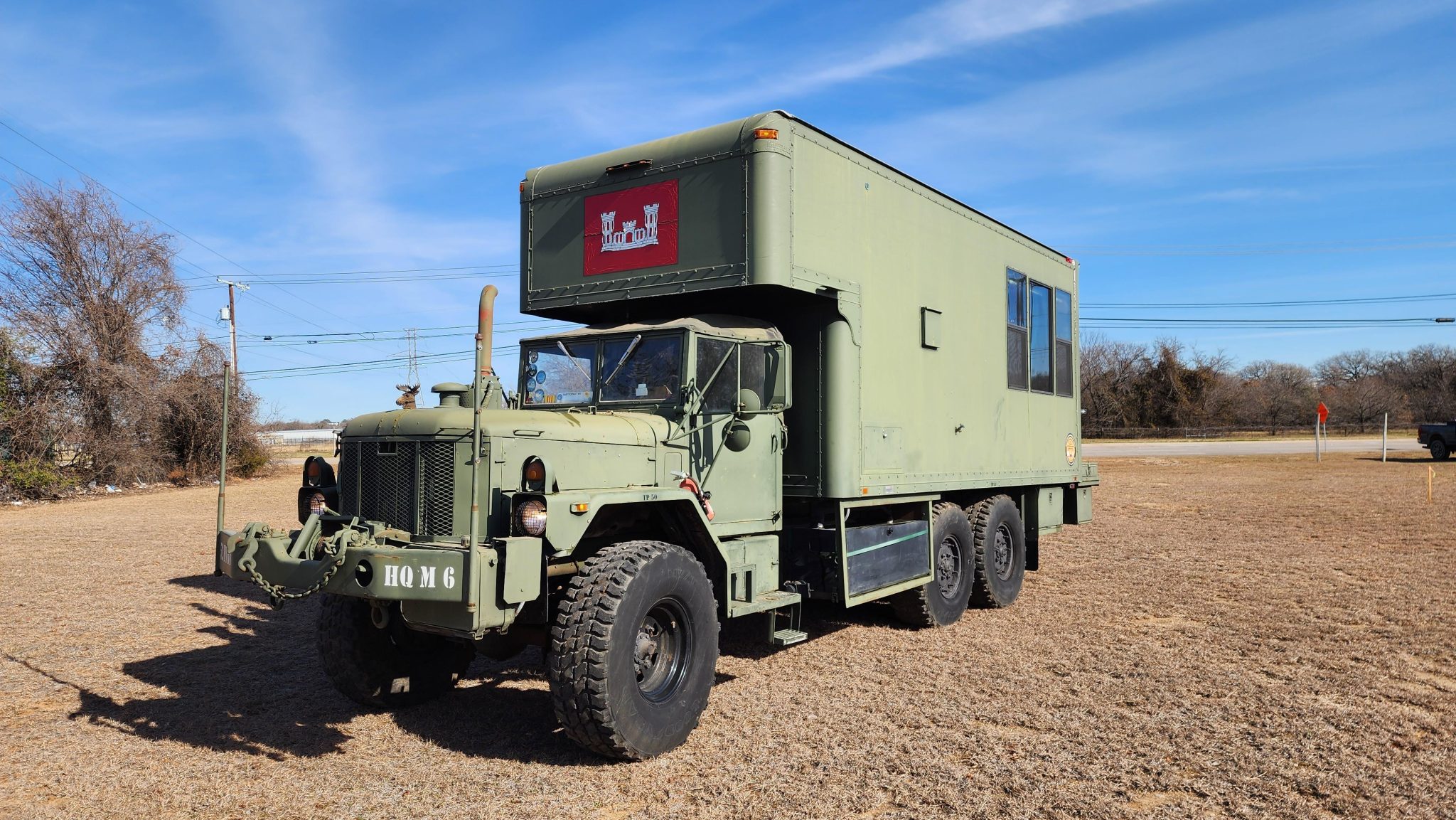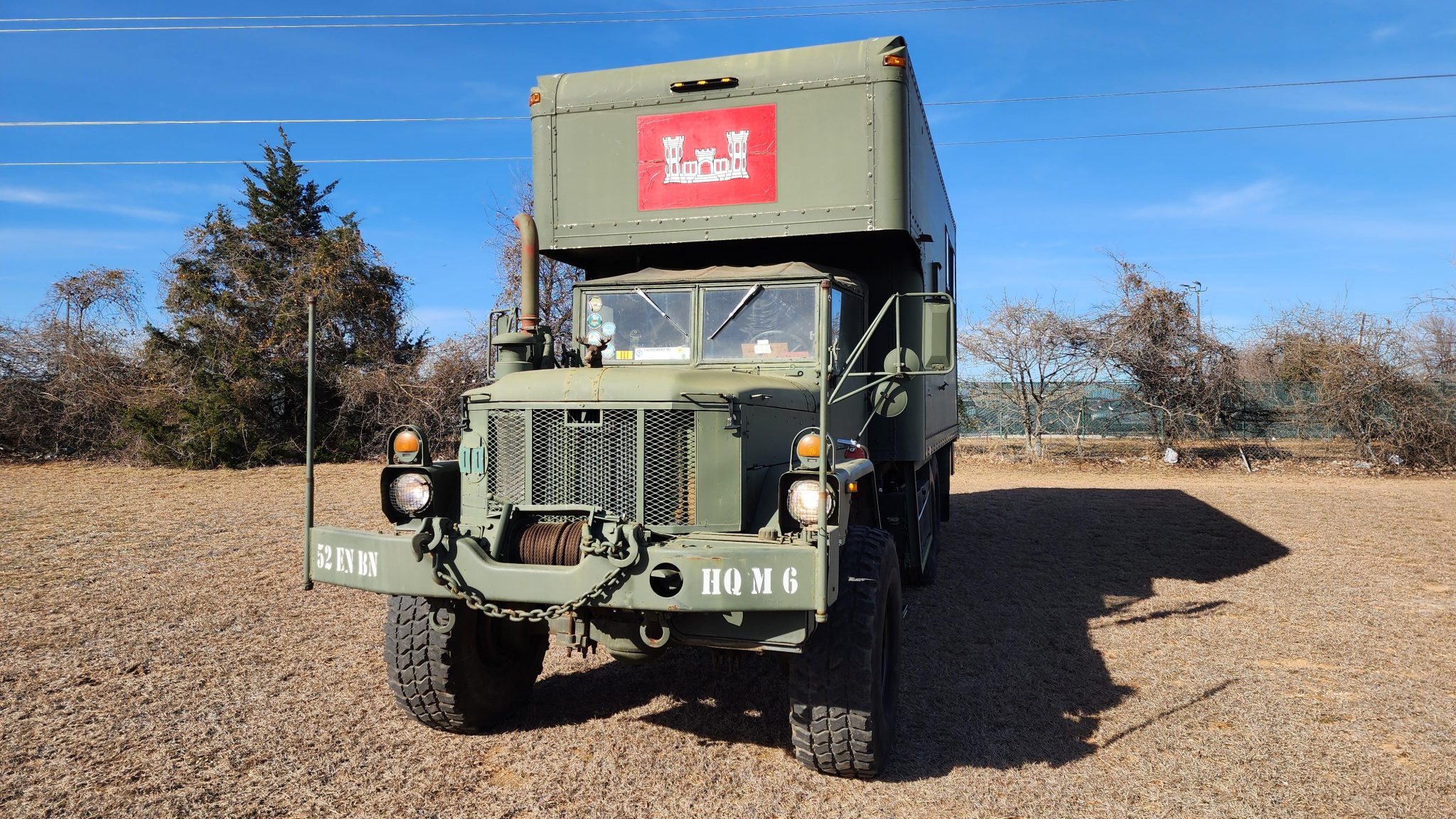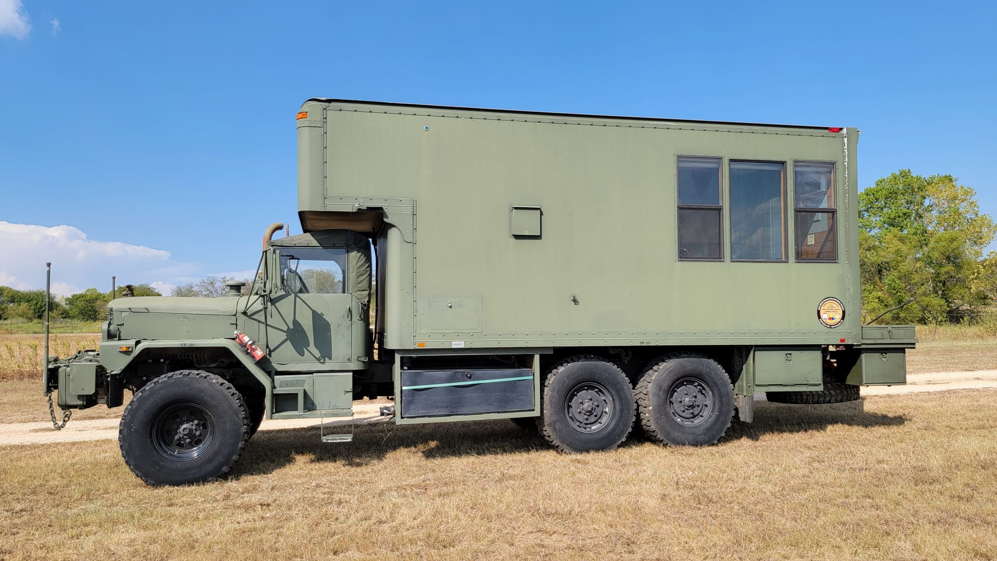 Black 20″ steel wheels are wrapped in 395/85 Goodyear MV/T tires, and a spare is mounted under the rear deck. The truck is equipped with air-assisted hydraulic drum brakes, dual rear axles, and aftermarket power steering. The frame has reportedly been extended by approximately 18″ to accommodate the camper shell, and steel fender wells have been added around the rear wheels.