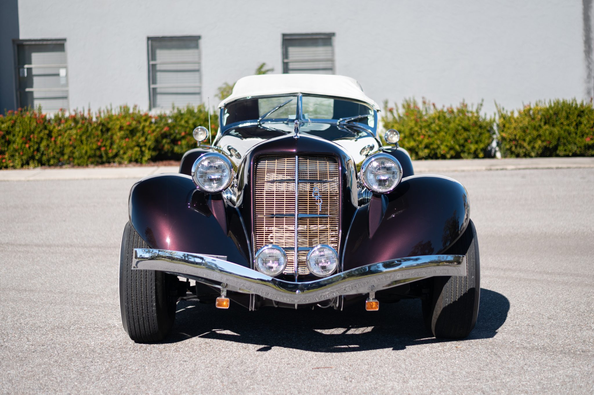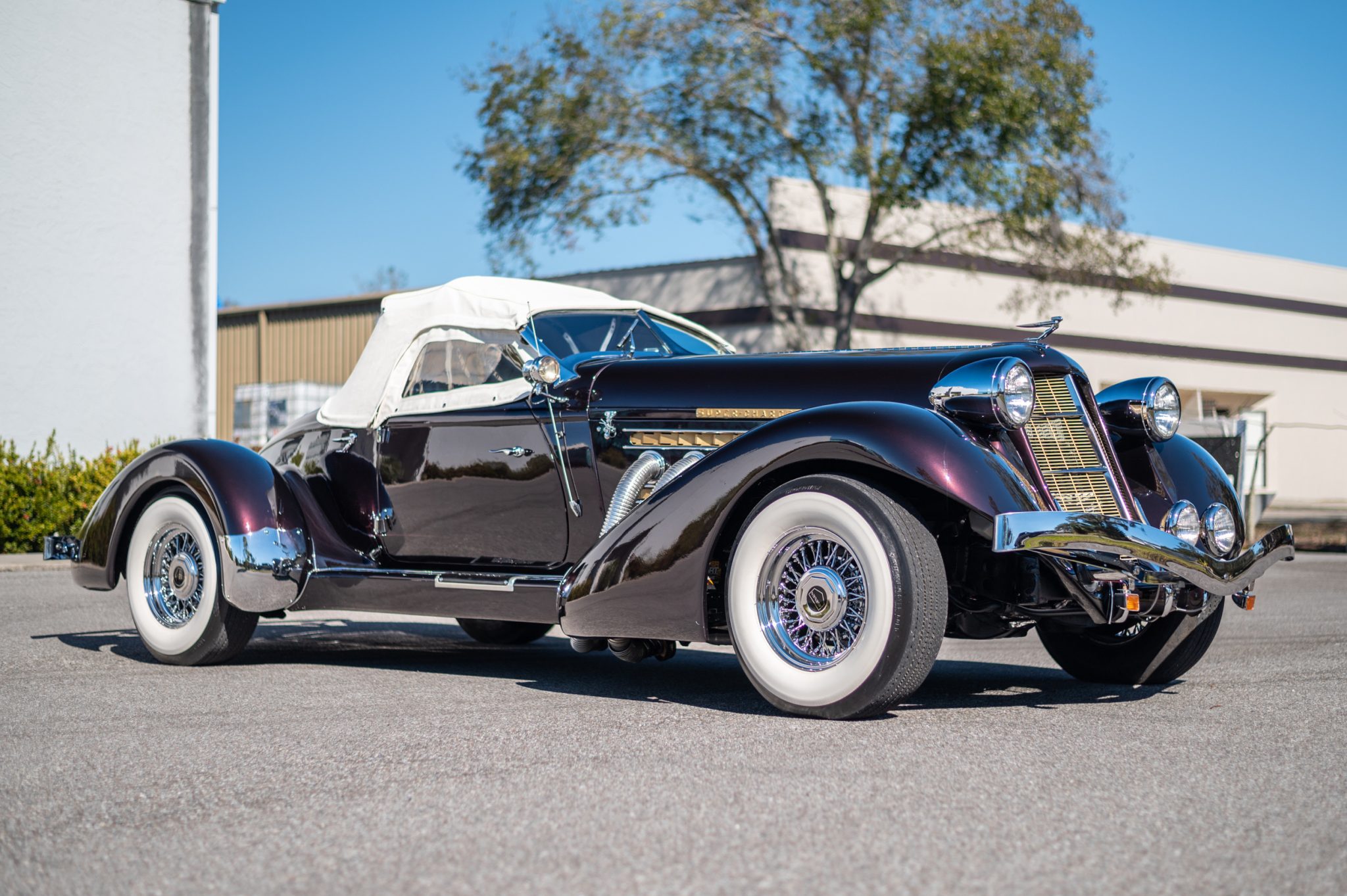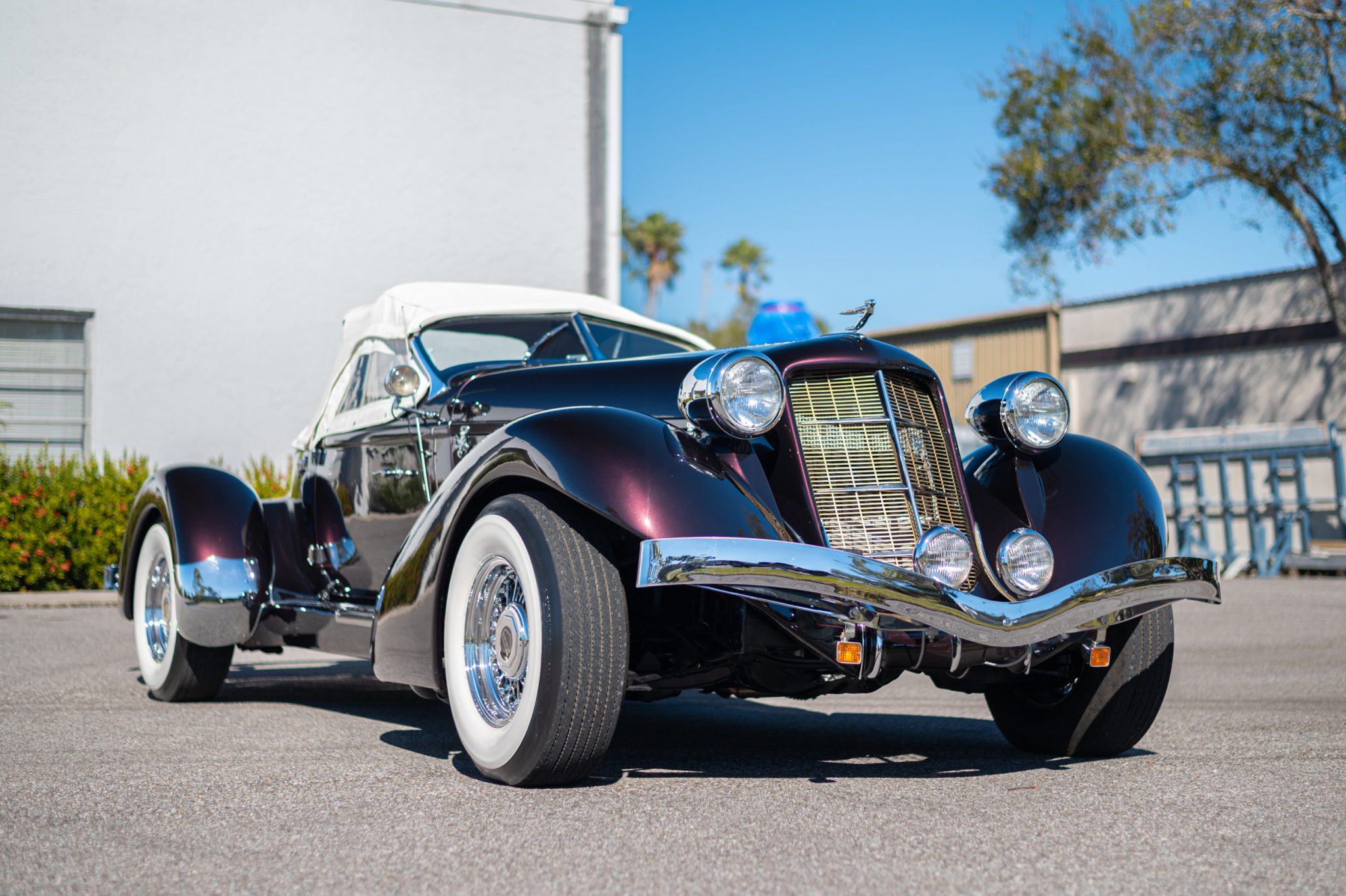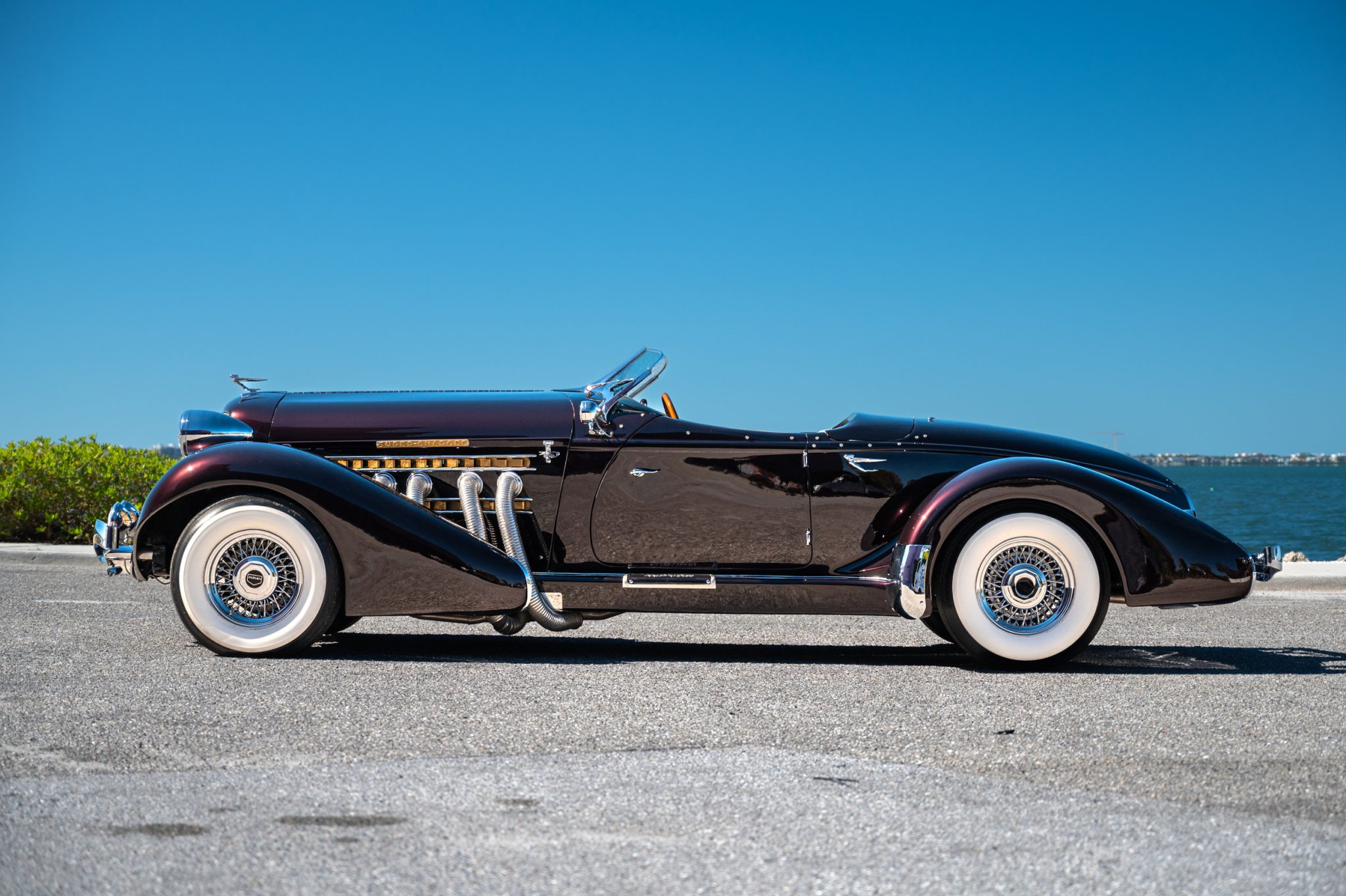 Chrome 15″ wire wheels wear Auburn-branded center caps and are mounted with Broadway wide-whitewall tires. Stopping power is provided by power-assisted discs up front and drums out back.