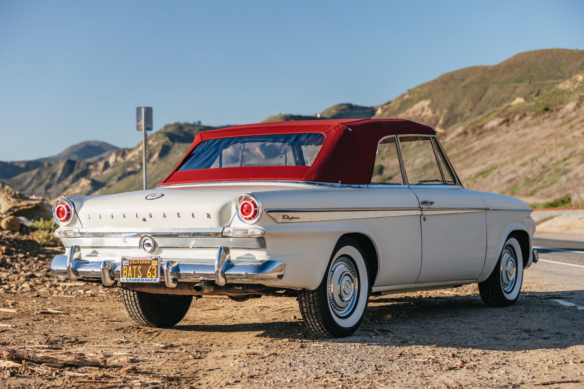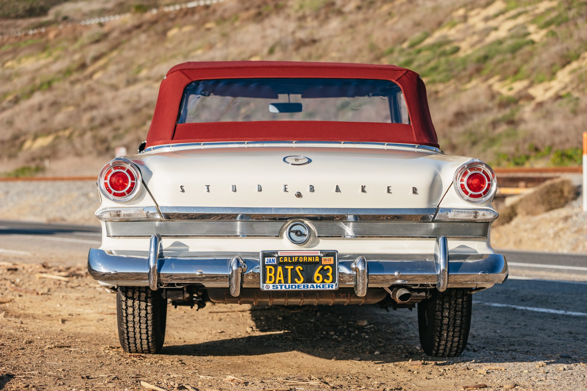 Black-painted 15″ steel wheels wear Studebaker covers and are mounted with 205/75 American Classic whitewall tires showing 2017 date codes. Braking is handled by drums at all four corners.