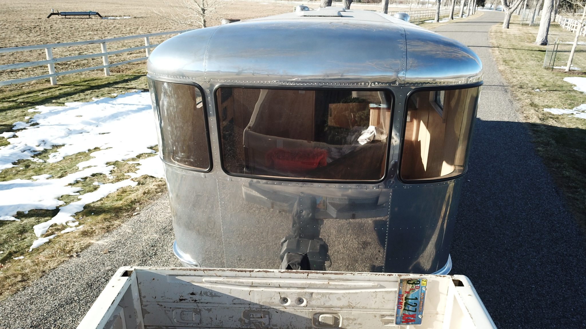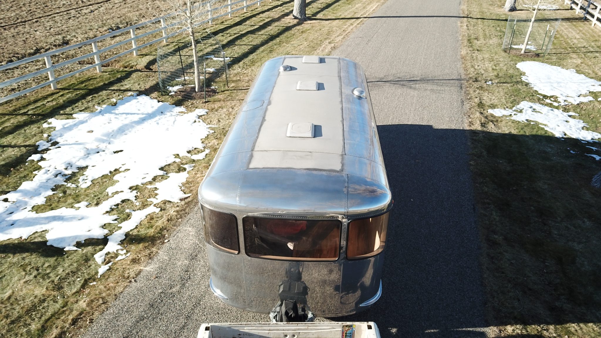 This example’s exterior riveted aluminum panels were polished along the sides and roof perimeter following the selling dealer’s purchase, while the center roof and skylight covers are finished in white. Doors with porthole windows are positioned at the front right and left rear of the trailer, although the latter is not usable from the outside due to a malfunctioning handle. Features include wood-framed inner screen doors, wrap-around front windows, swing-out aluminum step plates under each door, aluminum rub rails, and a lighting sconce next to the right-side door.