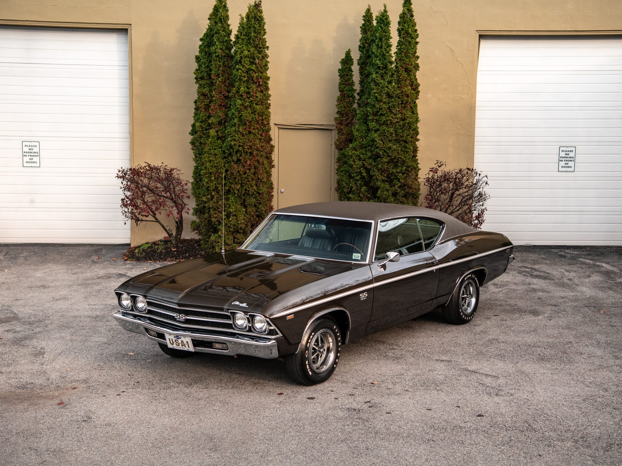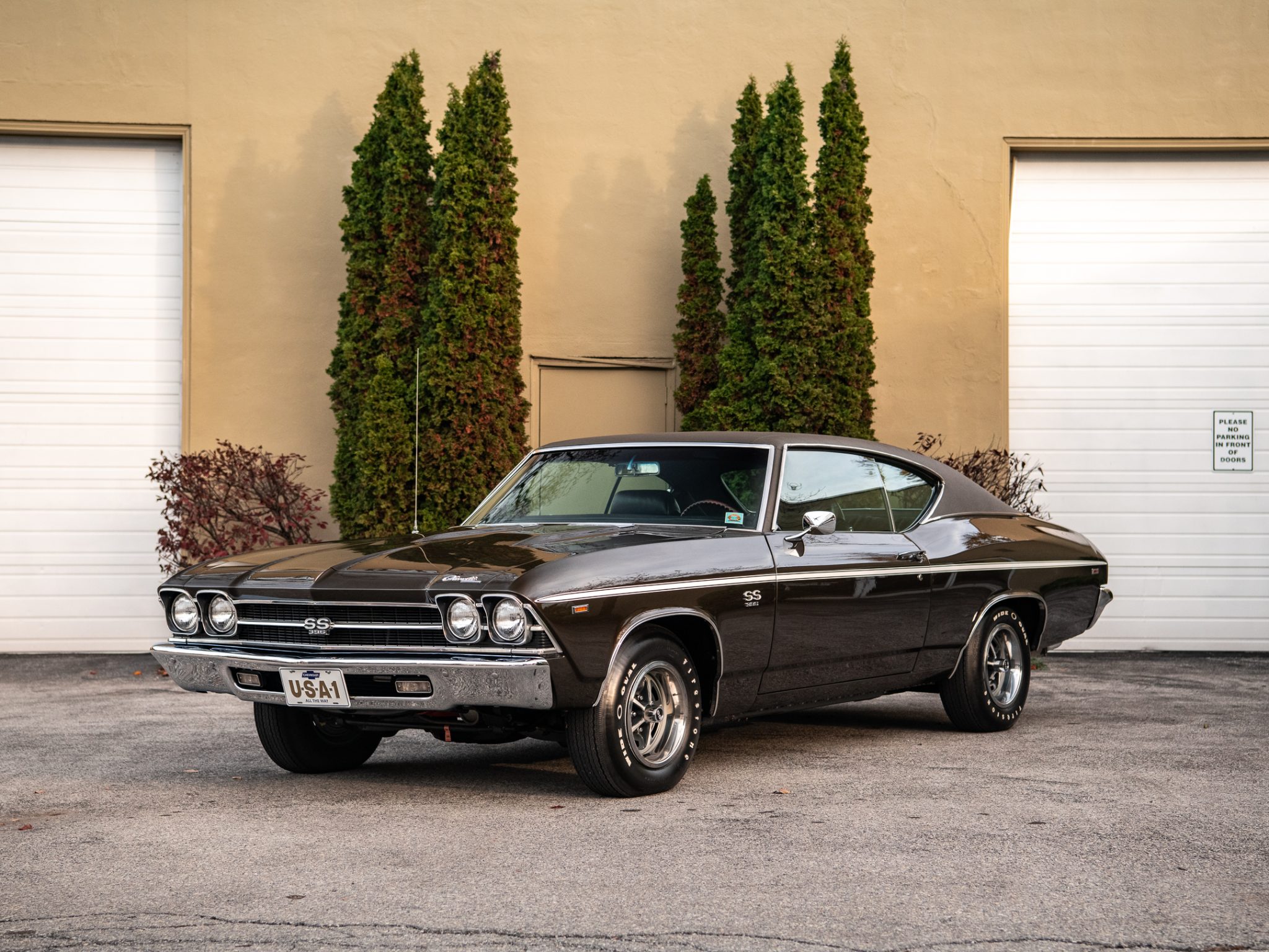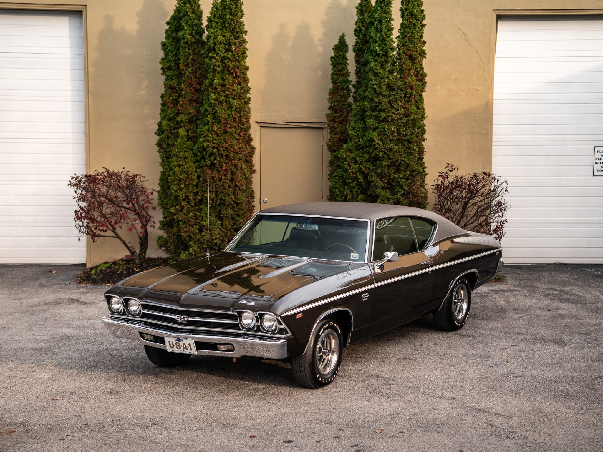 The 14″ Super Sport wheels wear SS center caps and are mounted with FR70-14 Firestone Wide Oval white-letter tires. The car is equipped with power steering and braking is handled by power-assisted front discs and rear drums.