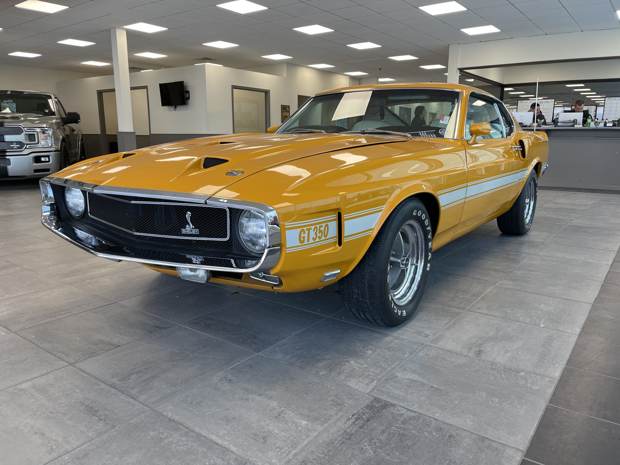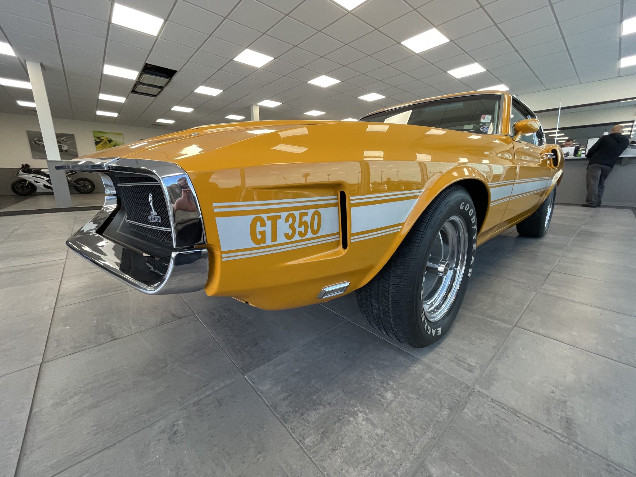 Five-spoke 15″ wheels with polished lips wear black Shelby center caps and are mounted with Goodyear Eagle GT white-letter tires. The car is equipped with power steering, and braking is handled by power-assisted front discs and rear drums.