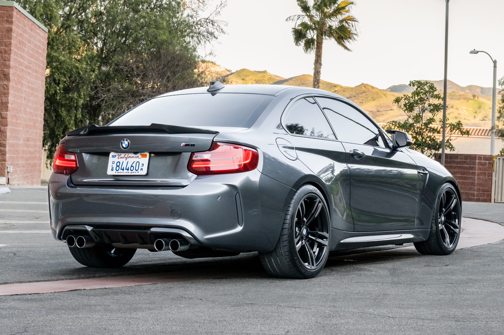 Staggered-width 19″ Style 437 alloy wheels are mounted with 245/35 front and 265/35 rear Michelin Pilot Sport 4S tires showing 2020 date codes. Braking is handled by blue-finished calipers paired with cross-drilled rotors at all four corners. KW adjustable lowering springs and 15mm rear spacers were reportedly installed under previous ownership, and the front V-brace is finished in blue.