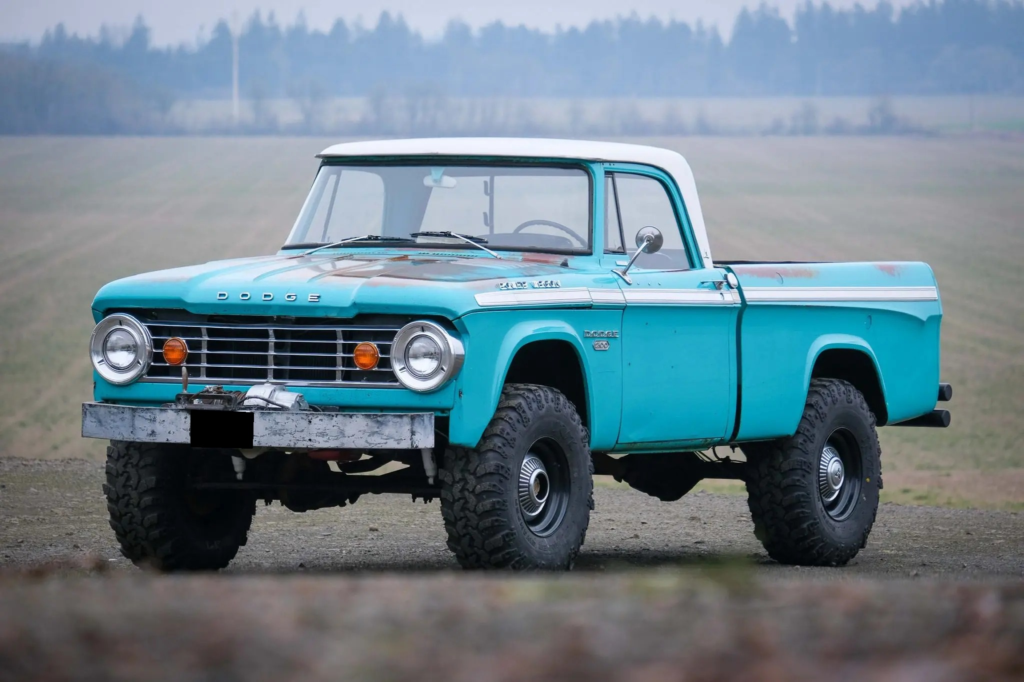 The truck utilizes a 114-inch wheelbase as well as a short-box bed. Black 16.5×8″ steel wheels with dog-dish hubcaps are mounted with 36×13.5″ Irok Super Swamper tires that show 2010 date codes. Rancho RS5000 shocks have been installed, the front axle has locking hubs, and the brakes and steering are unassisted. The brakes have been serviced with replacement shoes, wheel cylinders, and master cylinder. The selling dealer states that the steering wheel has approximately 6″ of play, and the truck would benefit from a replacement steering box.