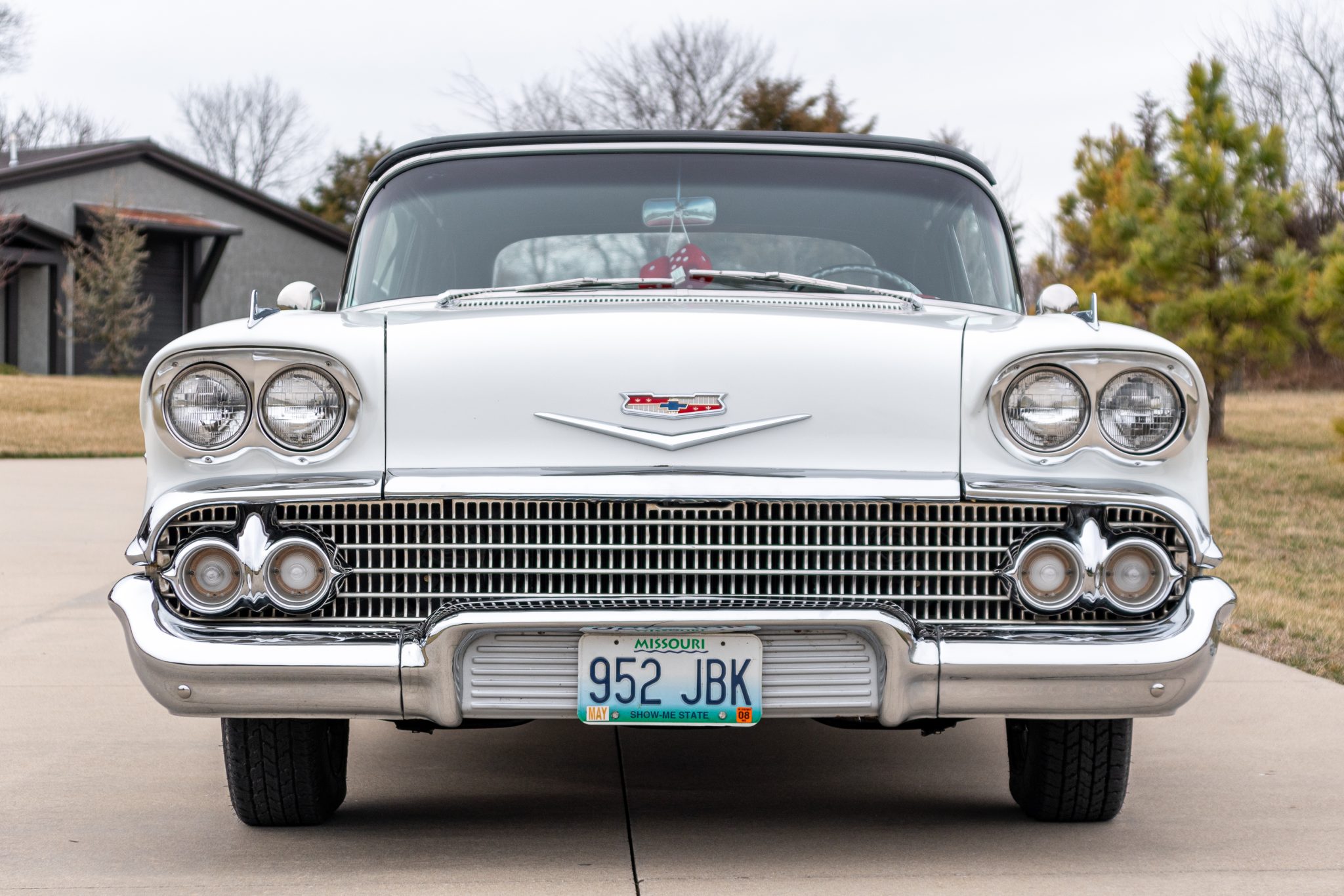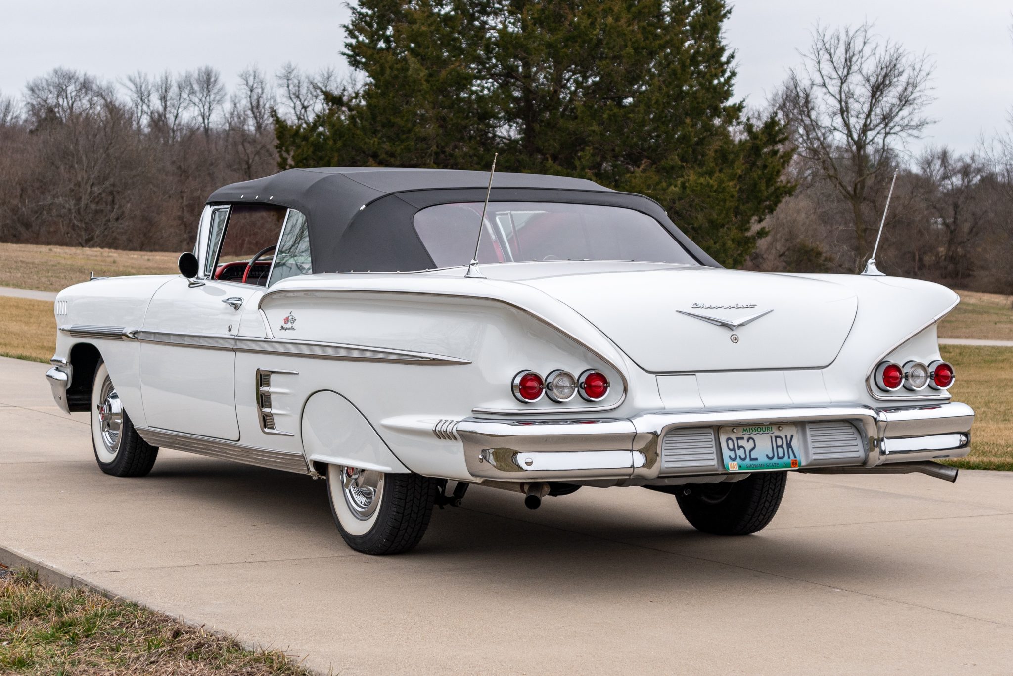 The 14″ steel wheels wear spinner-style covers and are mounted with 205/75 Coker Classic whitewall tires that were reportedly installed in 2022. The car is equipped with power steering, and braking is handled by power-assisted drums at all four corners. The chassis is said to have been stripped and refinished during the time of the refurbishment, and the suspension bushings, brake lines, ball joints, springs, wheel bearings, wheel cylinders, and shock absorbers were replaced under previous ownership, according to the seller.