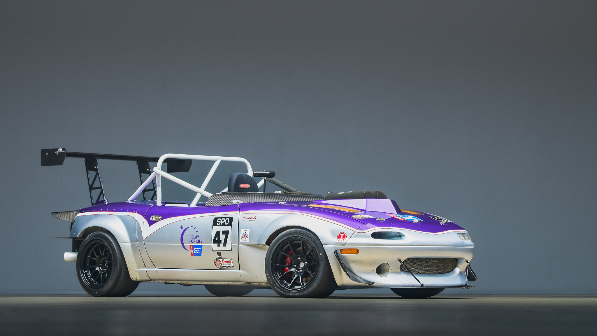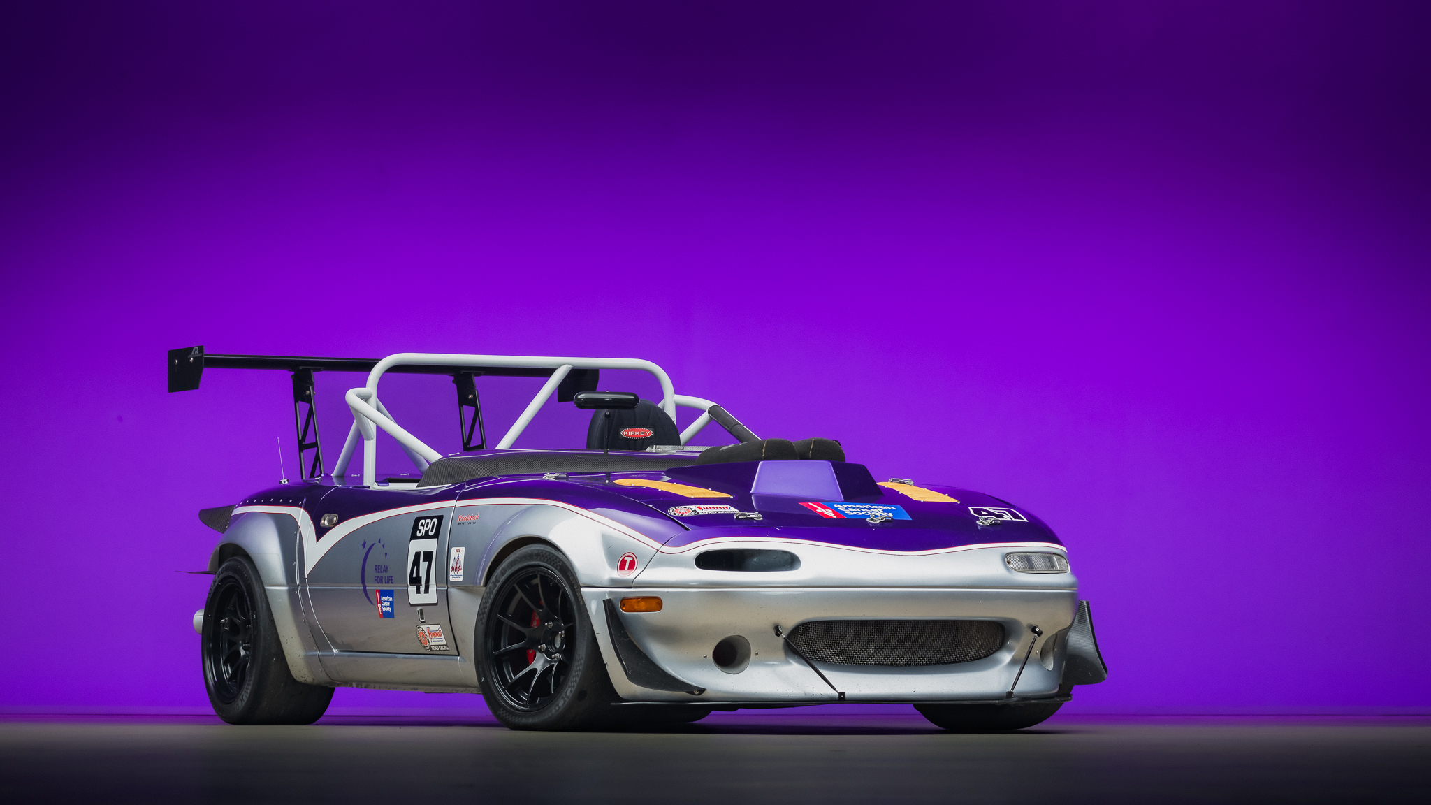 15″ Jongbloed Racing wheels are wrapped in Hoosier racing slick tires sized 275/35 front and 295/35 rear. Equipment includes custom-valved AFCO shocks, 1,000-lb front and 700-lb rear springs, a 1986 Ford Thunderbird rear independent suspension, adjustable rear upper control arms, and a 1″ front sway bar. Braking is handled by six-piston front and four-piston rear Wilwood calipers and slotted rotors.