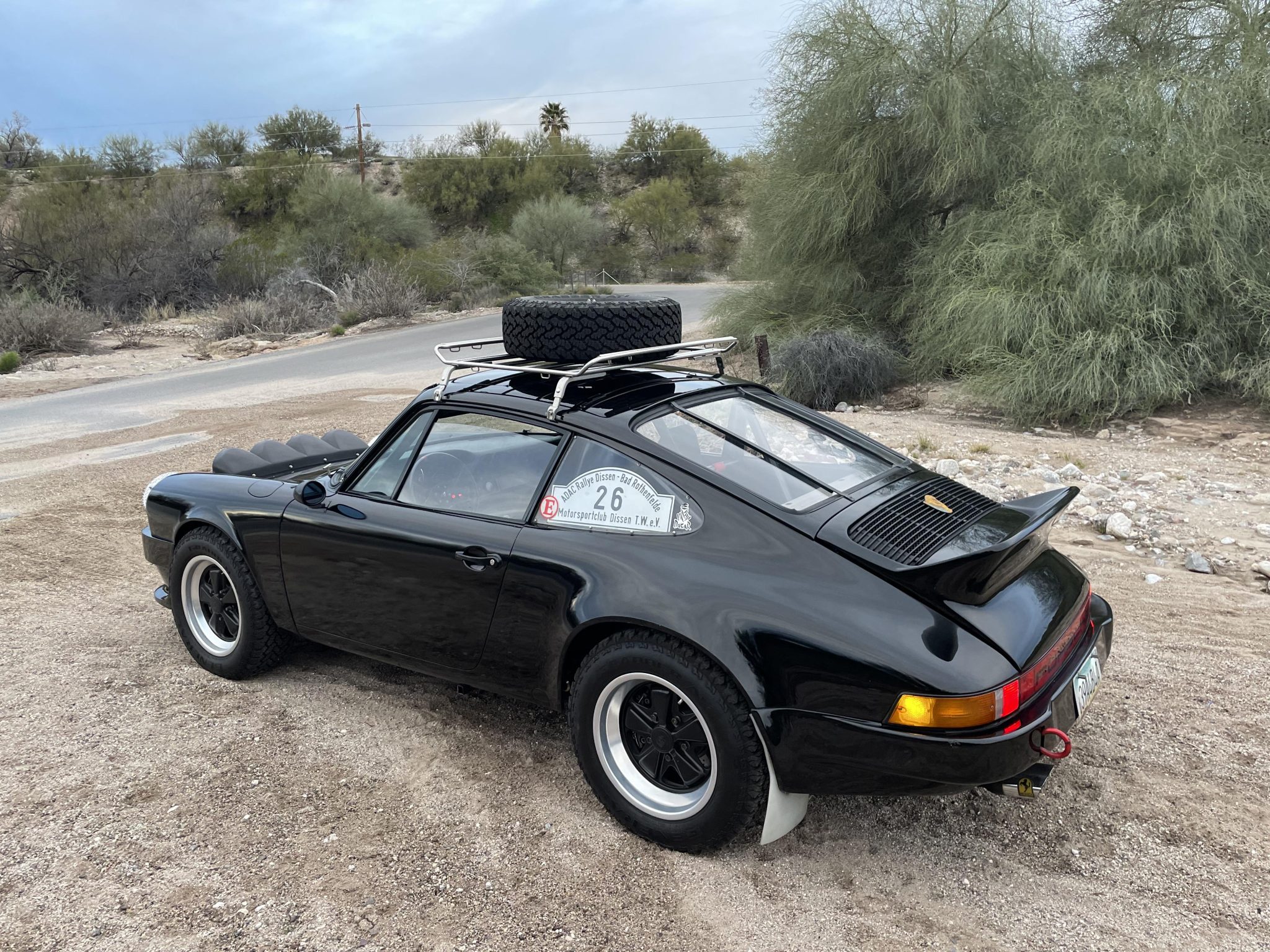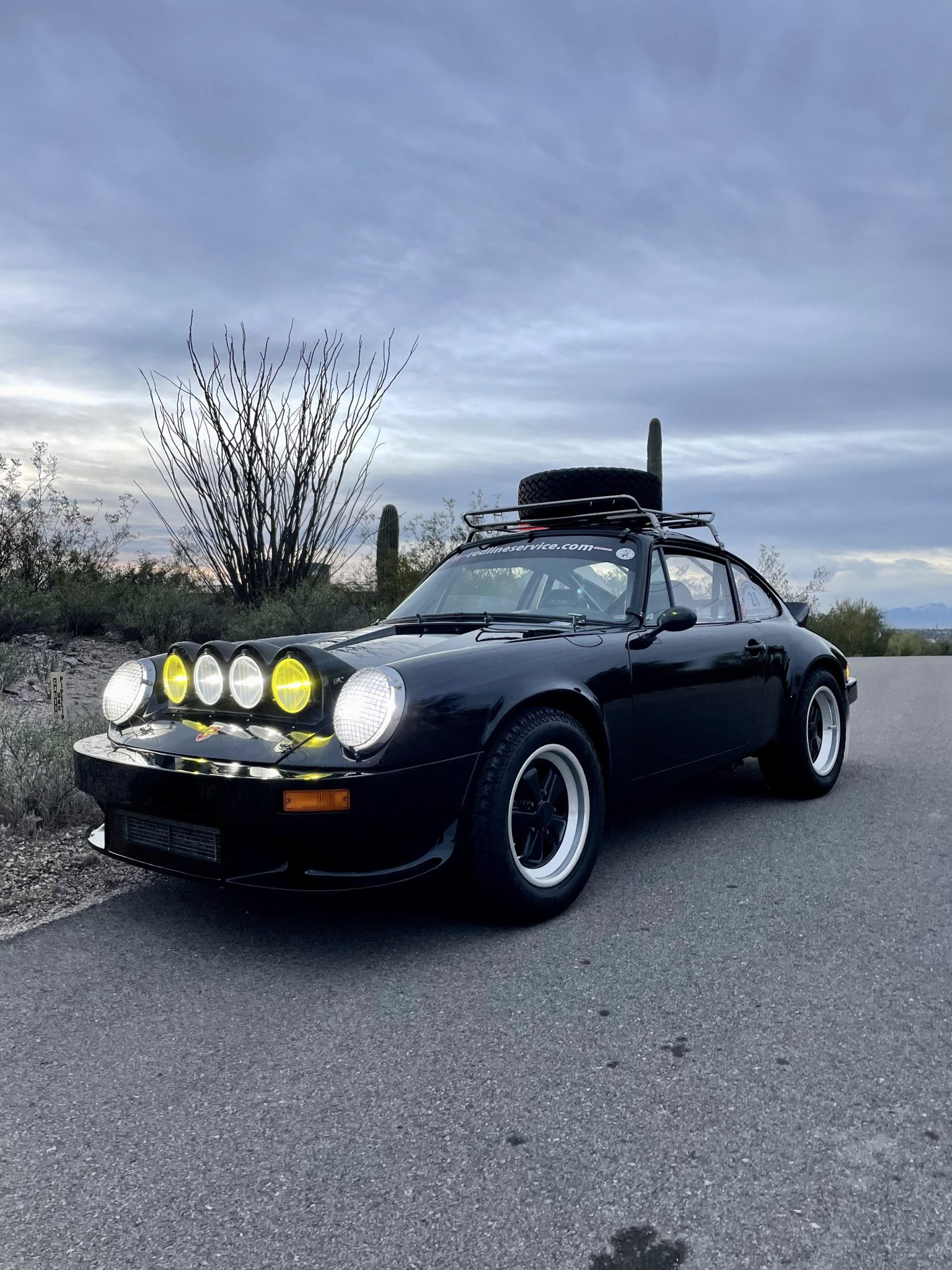 Fuchs 16″ wheels are finished in black with bright lips and wear 215/65 General Grabber AT2 tires. A matching spare is mounted atop the roof rack. The suspension has been modified to increase the ride height and features adjustable torsion bars, dropped Boge front spindles, mono-ball front strut mounts, Bilstein dampers, reinforced rear shock mounts, and Elephant Racing adjustable rear spring plates. Braking is handled by contemporary 911 Turbo-sourced calipers and cross-drilled rotors. Service has included re-packing the front wheel bearings and replacing the CV axle boots.